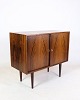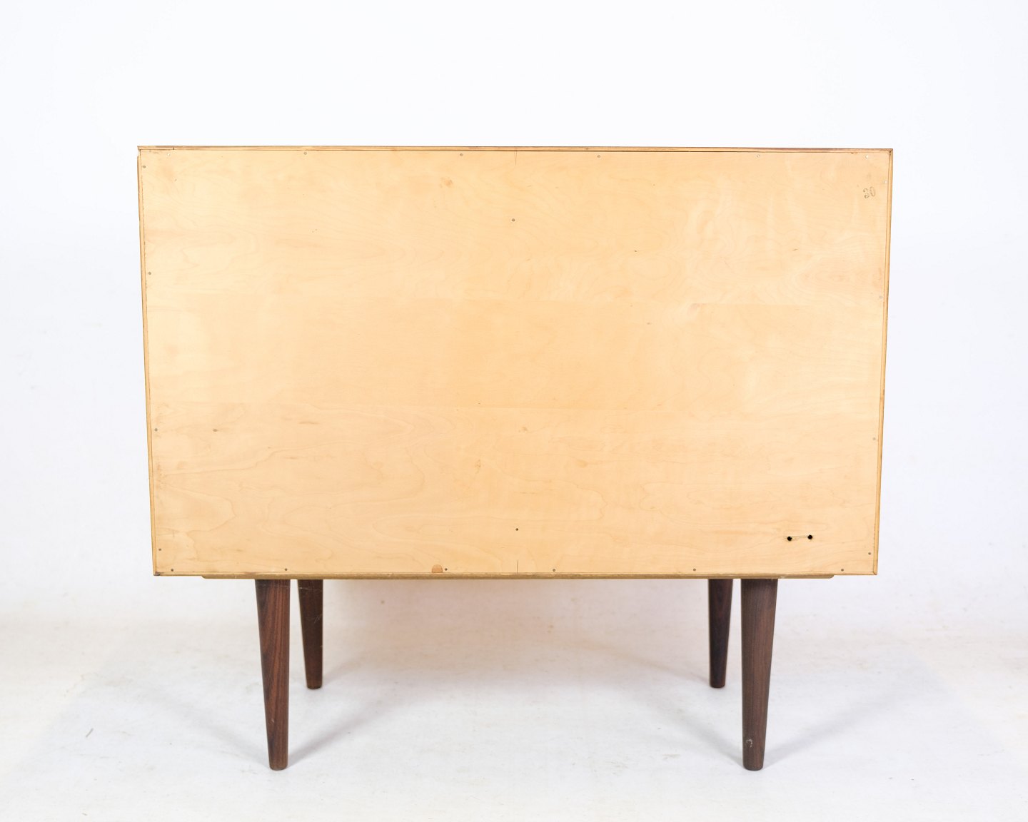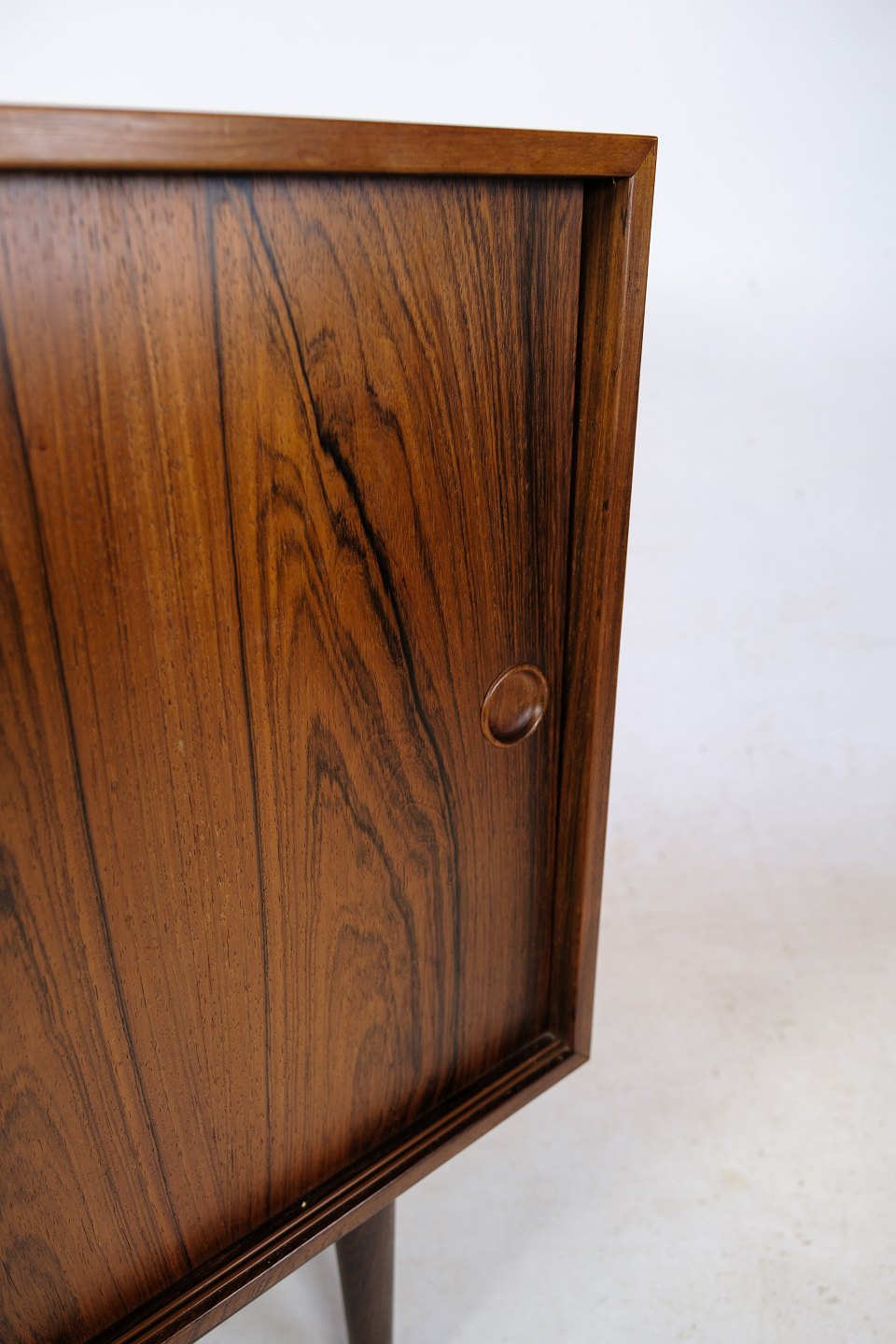 SolgtEn lille kommode med front af to skydedøre bag med hylder og skuffer i palisander med tilspidsede ben fremstillet af Dansk Møbelproducent omkring 1960'erne.