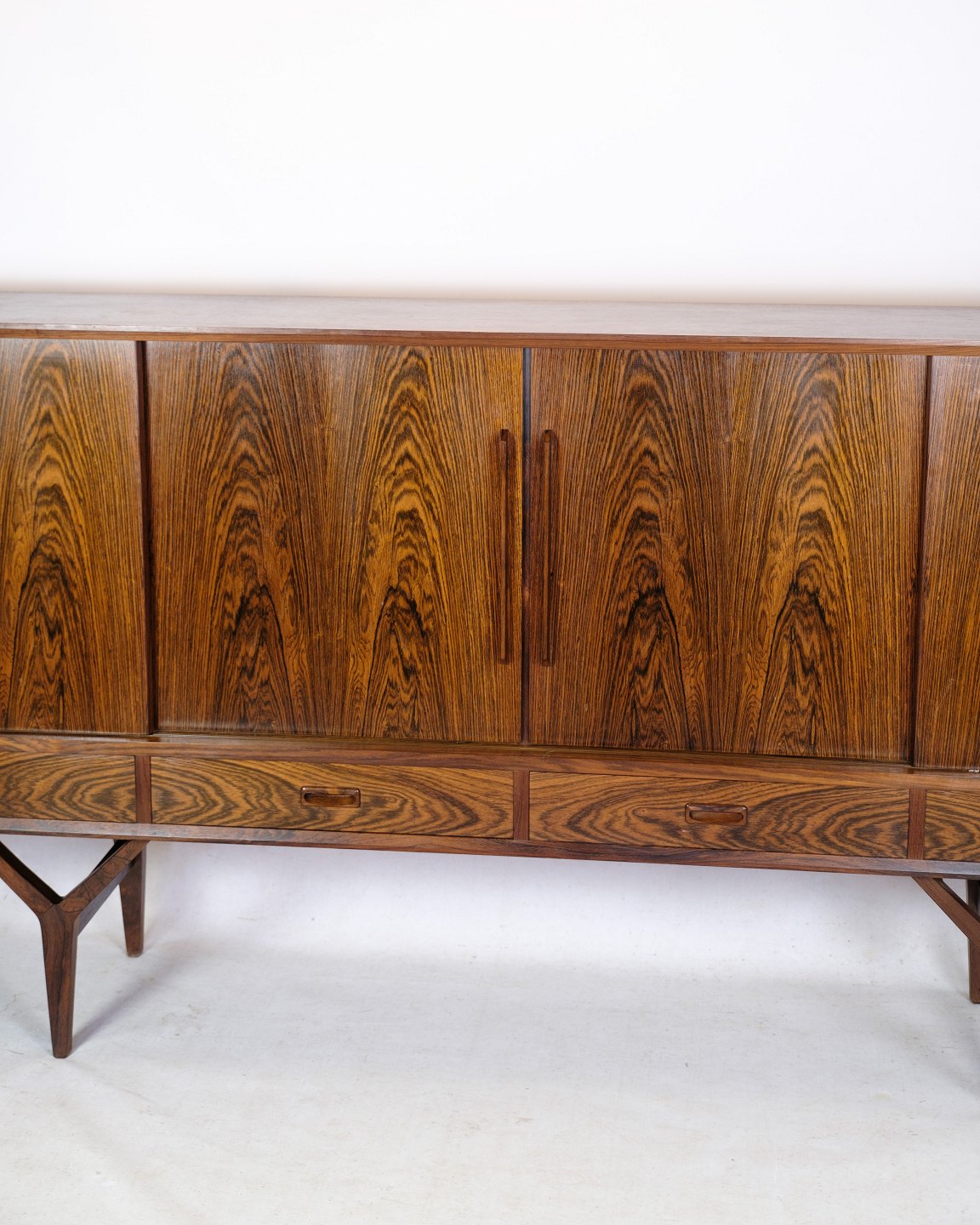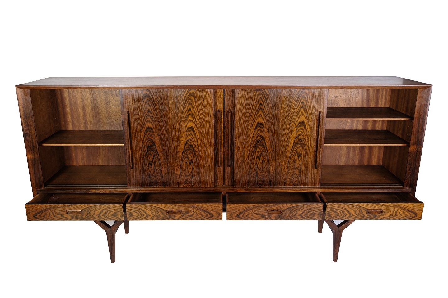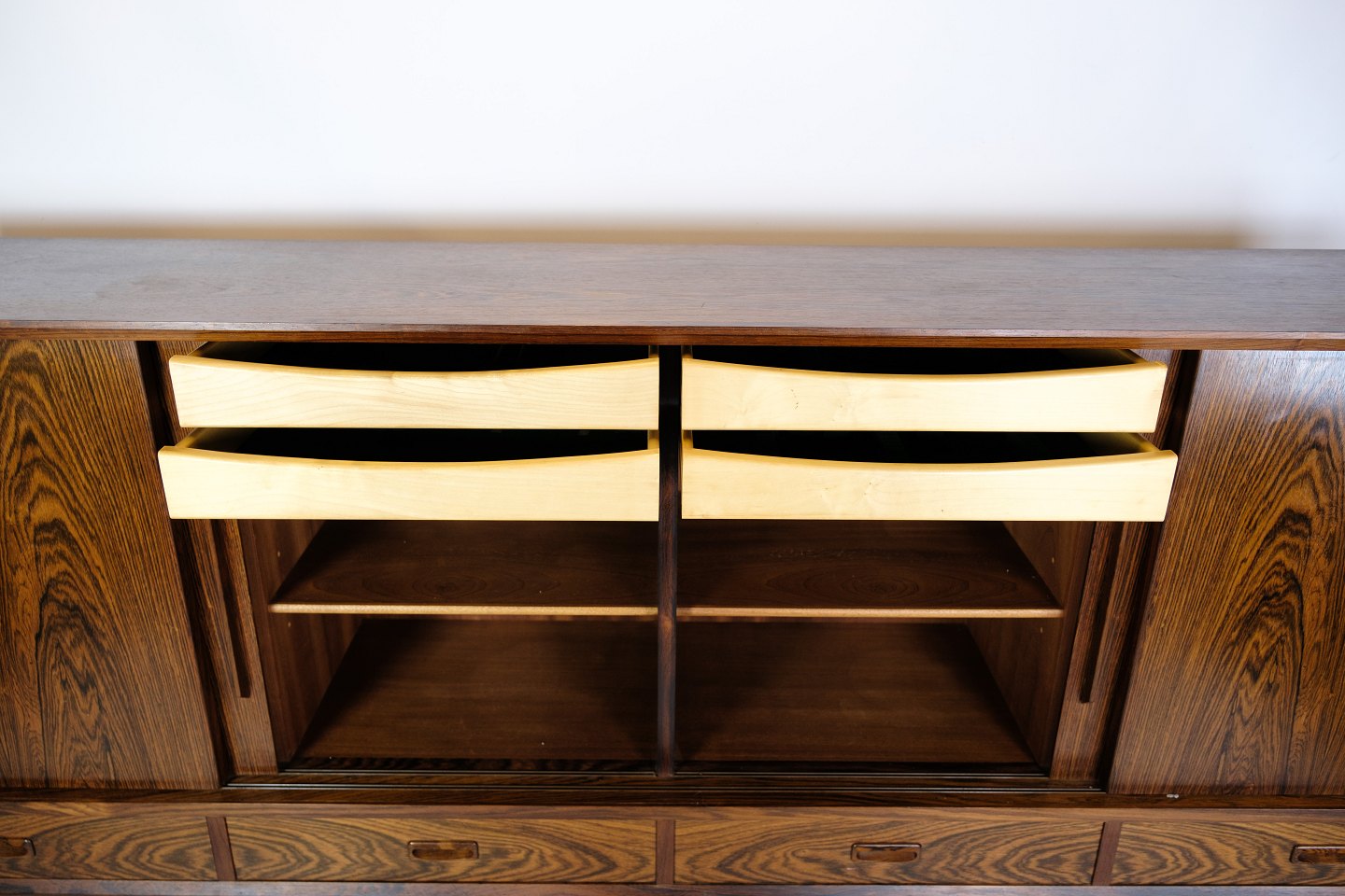 This beautiful rosewood sideboard is a brilliant example of Danish furniture design from the 1960s. The deep, warm color and the characteristic grain patterns in the rosewood add elegance and authenticity to any decor.