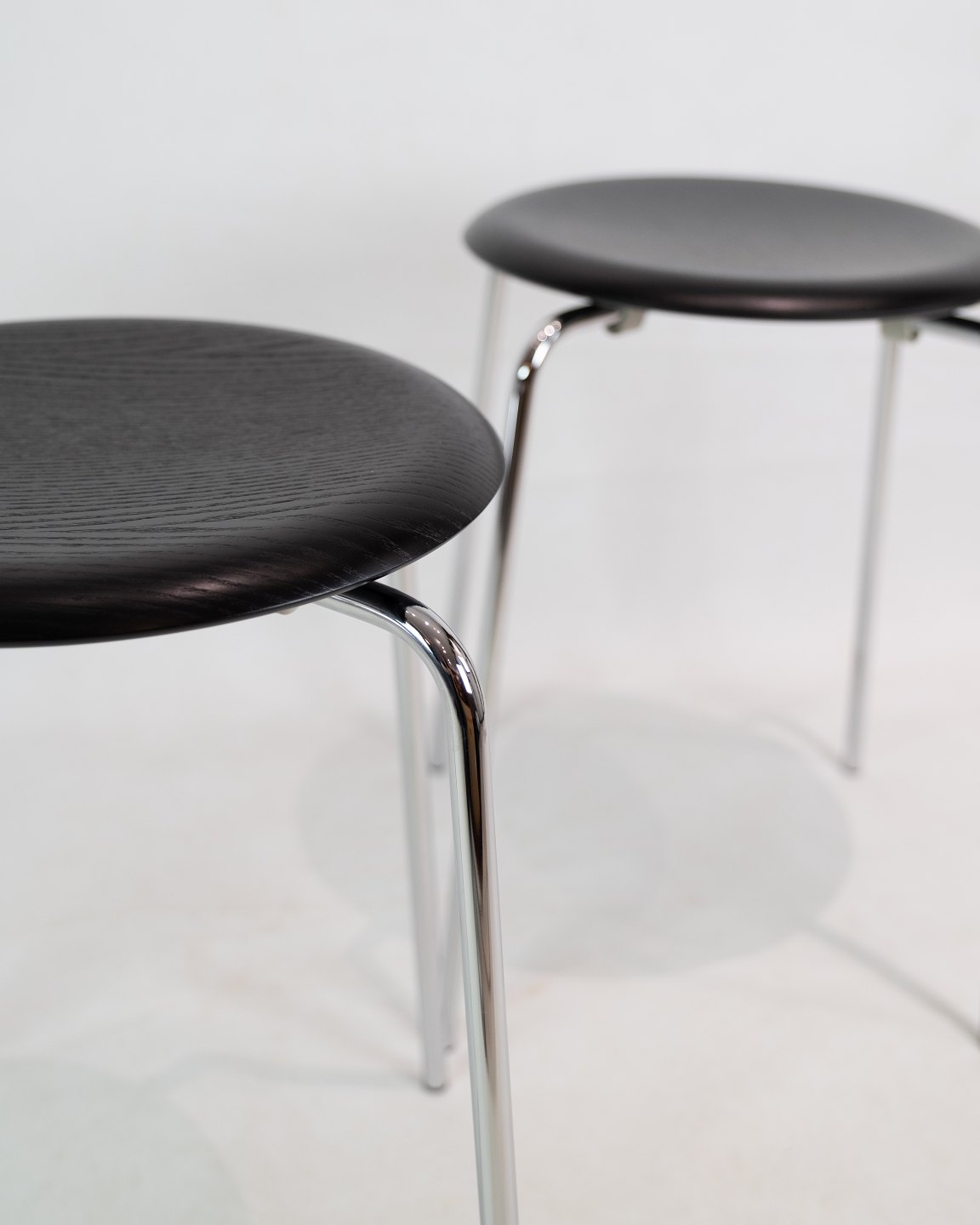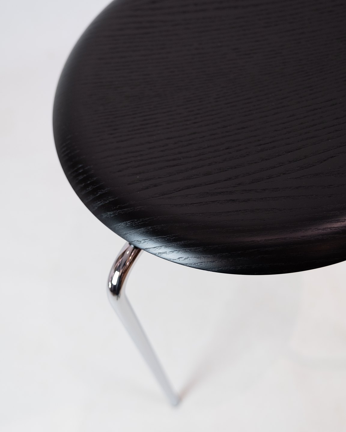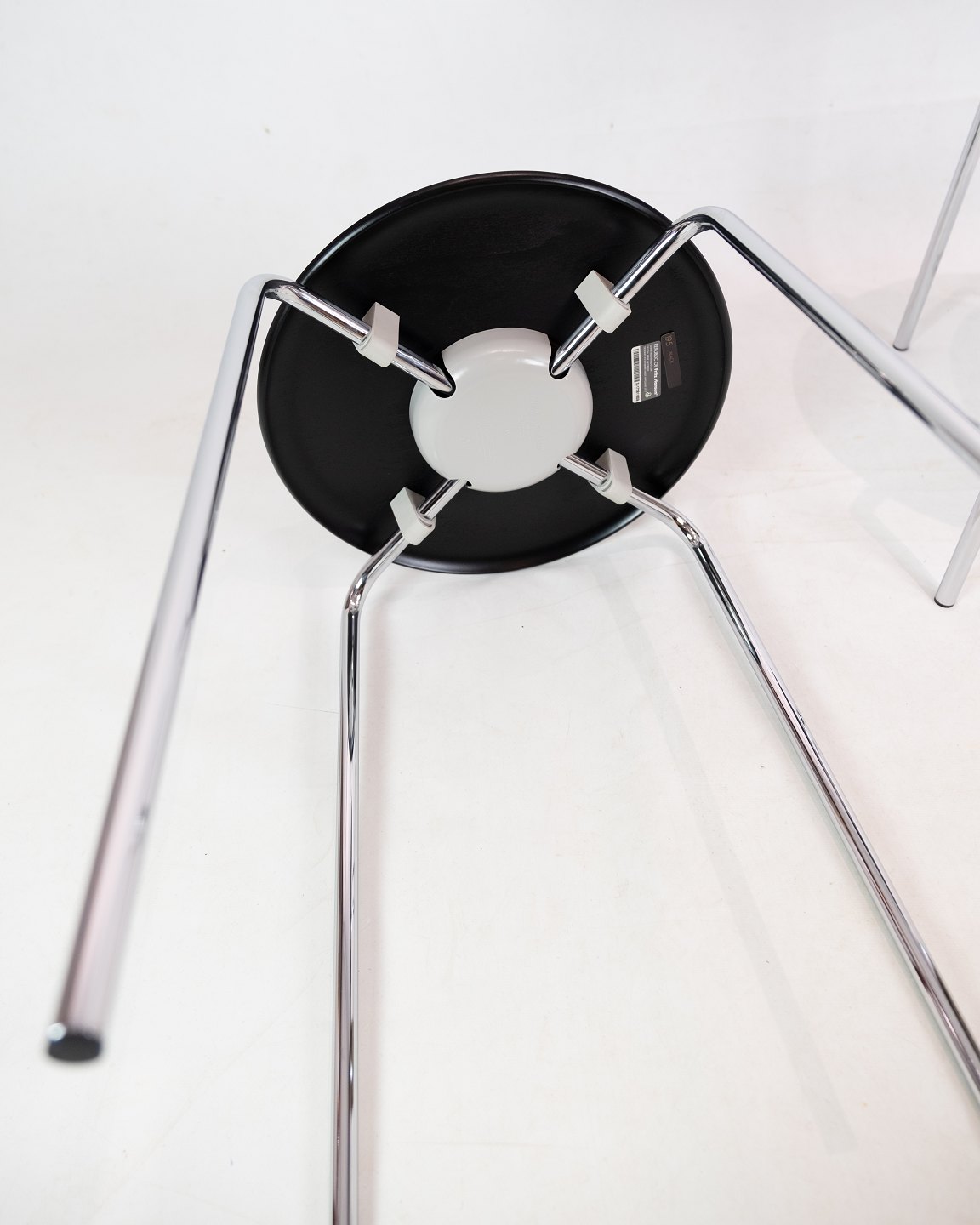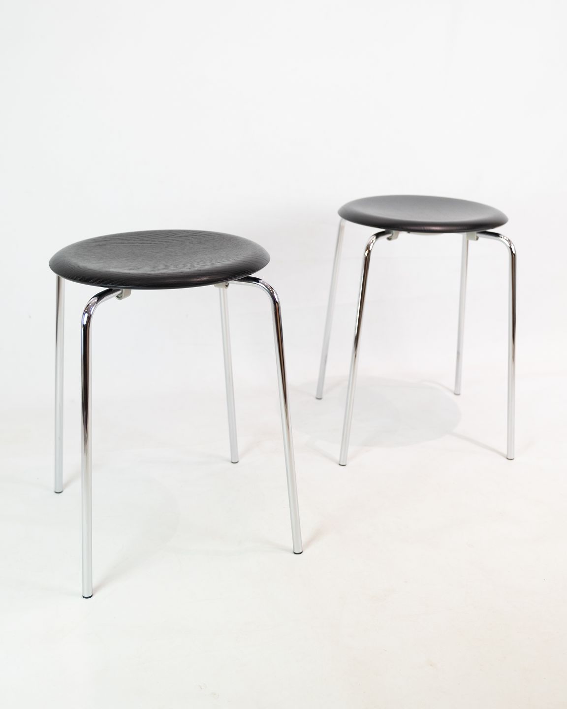 Skamlerne har en stel af forkromet stålrør, der giver dem en let og elegant fremtoning. Sædet er lavet af sort askefiner, der tilføjer varme og kontrast til det strømlinede stålstel. Den enkle og funktionelle form gør disse skamler velegnede til en lang række indretningsstile og anvendelsesformål.