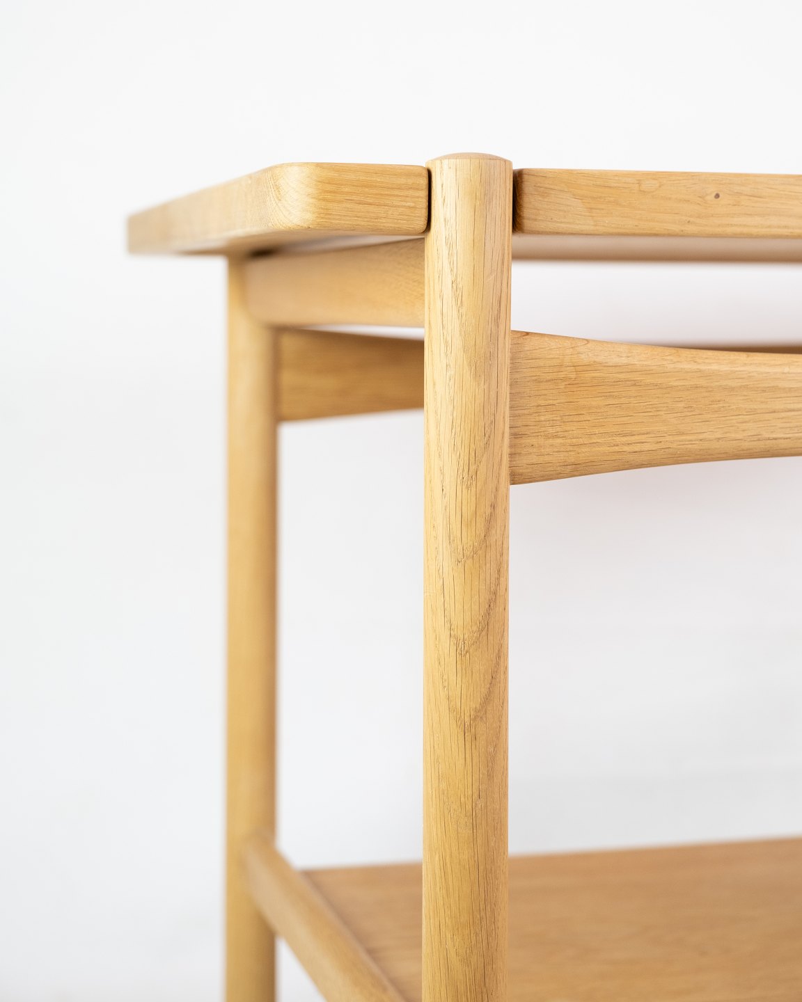 Hans J. Wegners design tilfører en tidløs elegance og funktionalitet til serveringsvognen, hvilket gør den til en eftertragtet og værdsat møbelgenstand. Med sin massivt egetræskonstruktion er "AT 48" serveringsvognen et smukt eksempel på dansk designarv, der vil tilføje en elegant touch til ethvert hjem eller interiør.