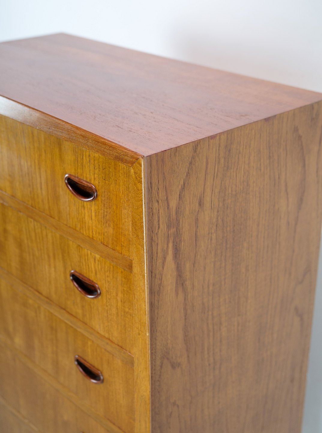 Teaktræet er kendt for sin naturlige skønhed, varme farver og holdbarhed, hvilket gjorde det til et foretrukket materiale til møbeldesign i denne æra. Kommoden vil sandsynligvis have enkle linjer og en elegant silhuet, der afspejler det tidløse og stilfulde design af 1960'erne.