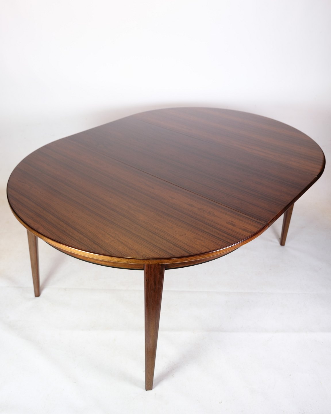 Overall, the dining table is in rosewood, designed by Oman Jun. A/S, model no. 55, from the 1960s a tribute to Danish furniture design tradition. With its rosewood construction and timeless design, it represents the aesthetics and quality so characteristic of the period and will no doubt continue to add style and elegance to modern interiors.