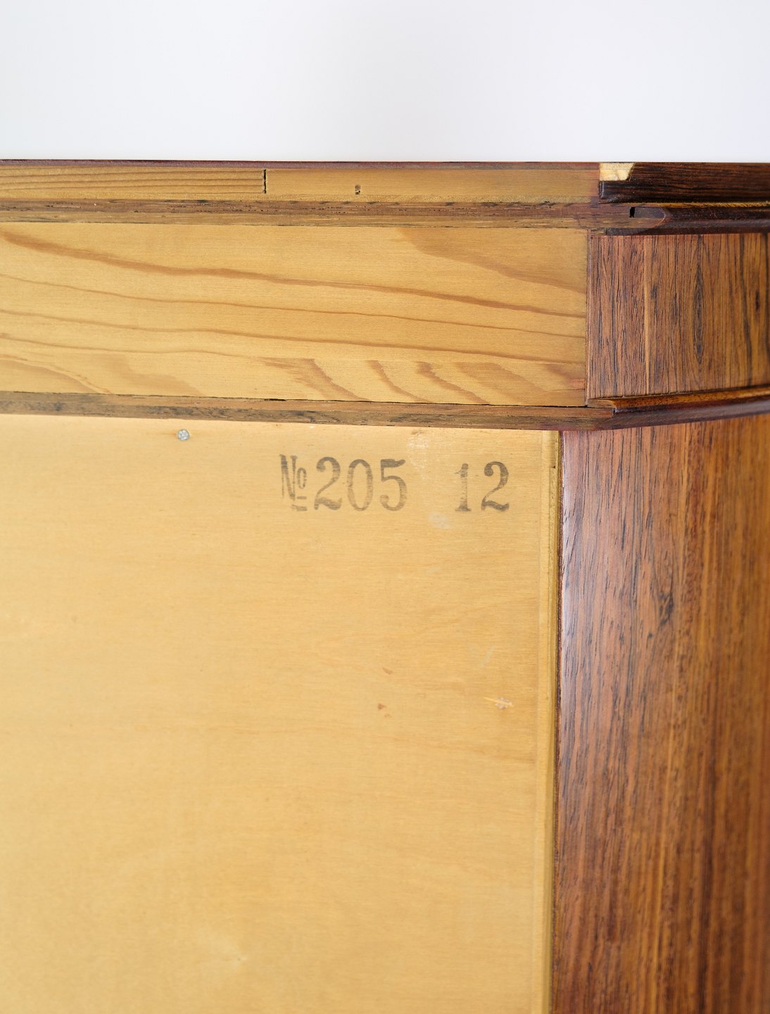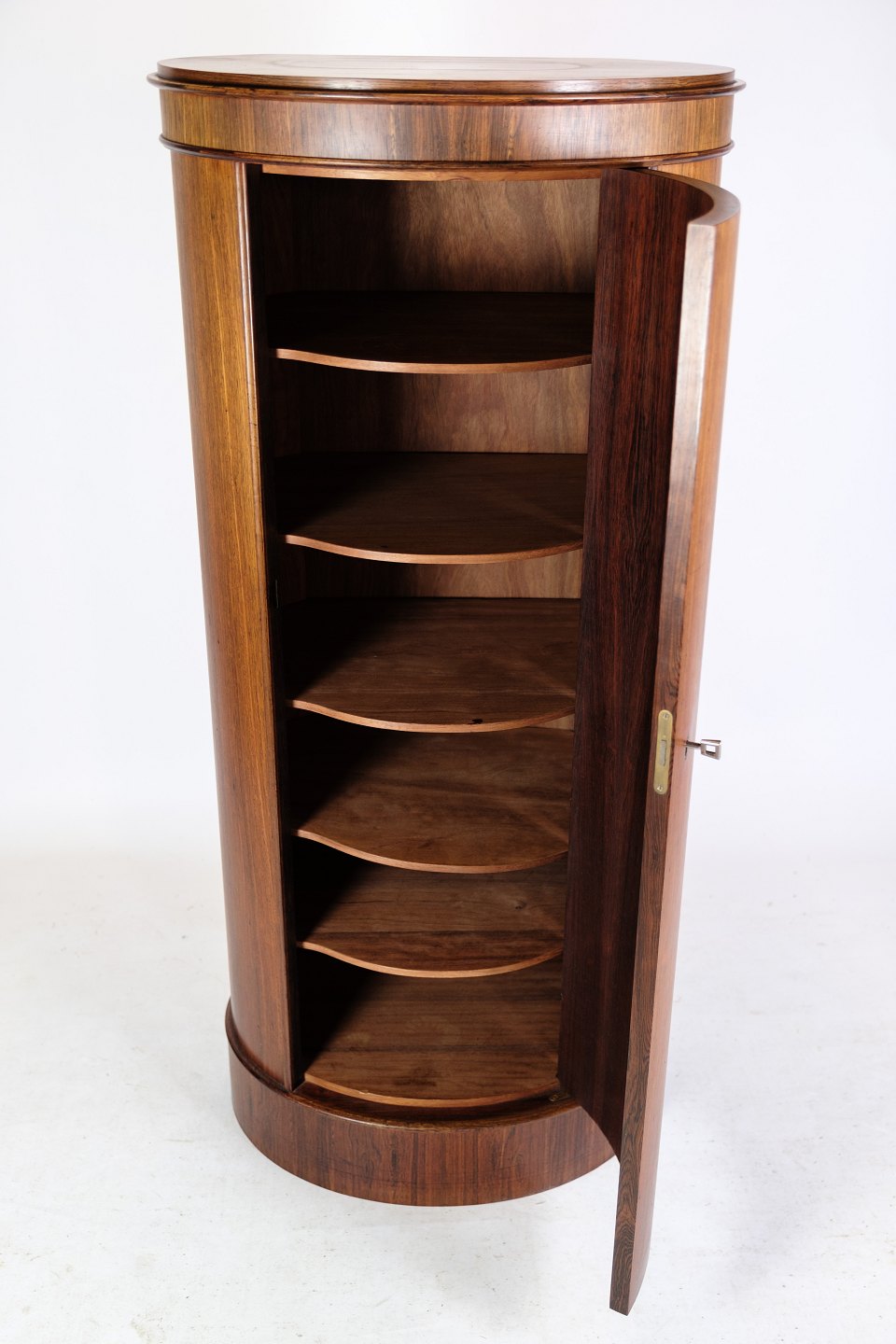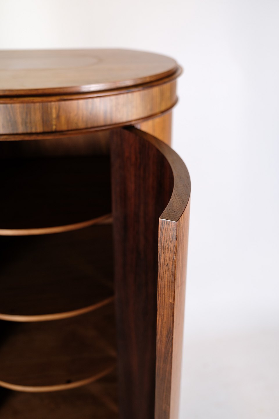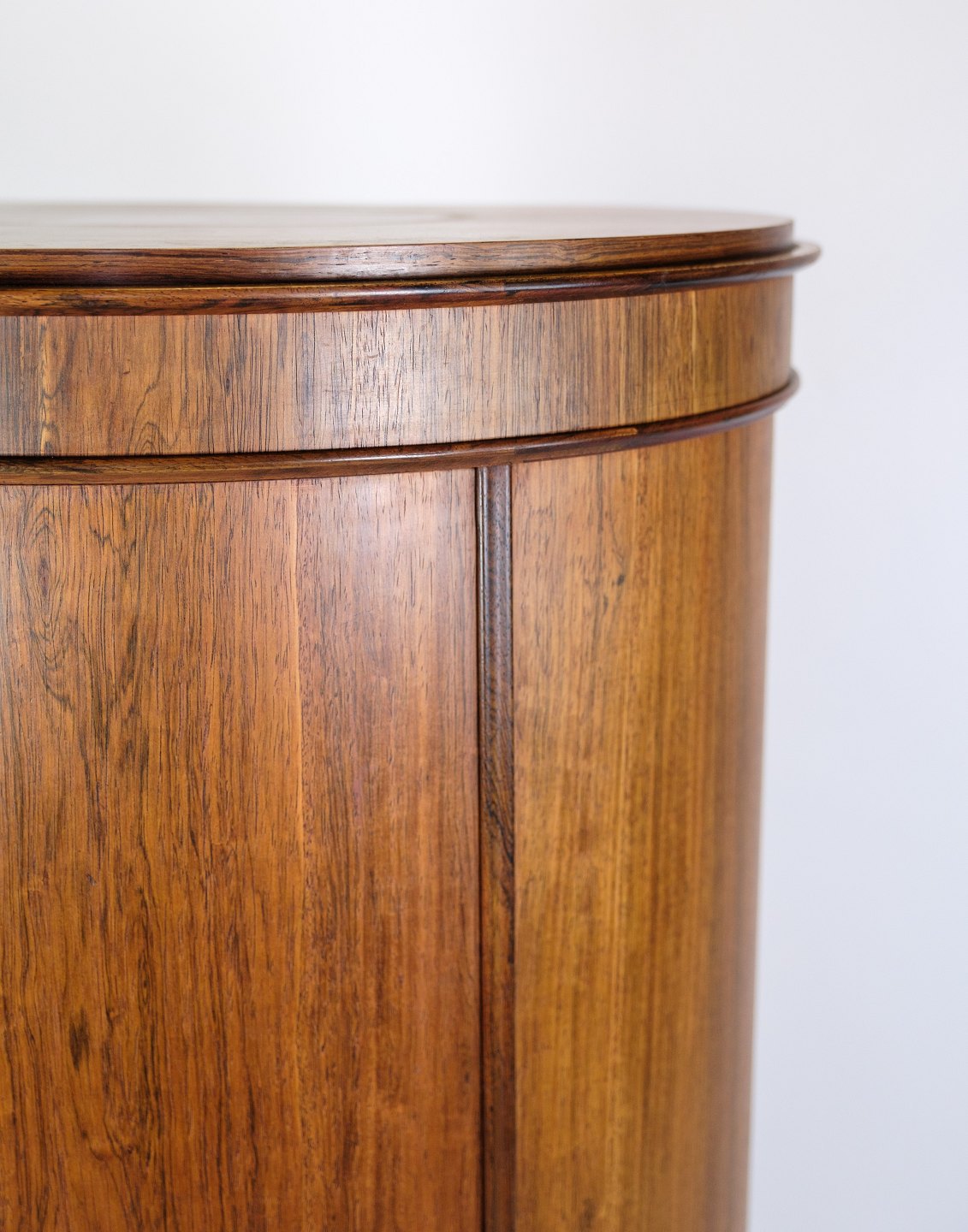 This oval-shaped rosewood pedestal cabinet, designed by Johannes Sorth for Bornholms Møbelfabrik around the 1960s, exudes a timeless elegance and beauty. Made from first-class rosewood, this cabinet is a beautiful example of Danish furniture craftsmanship from the mid-20th century.