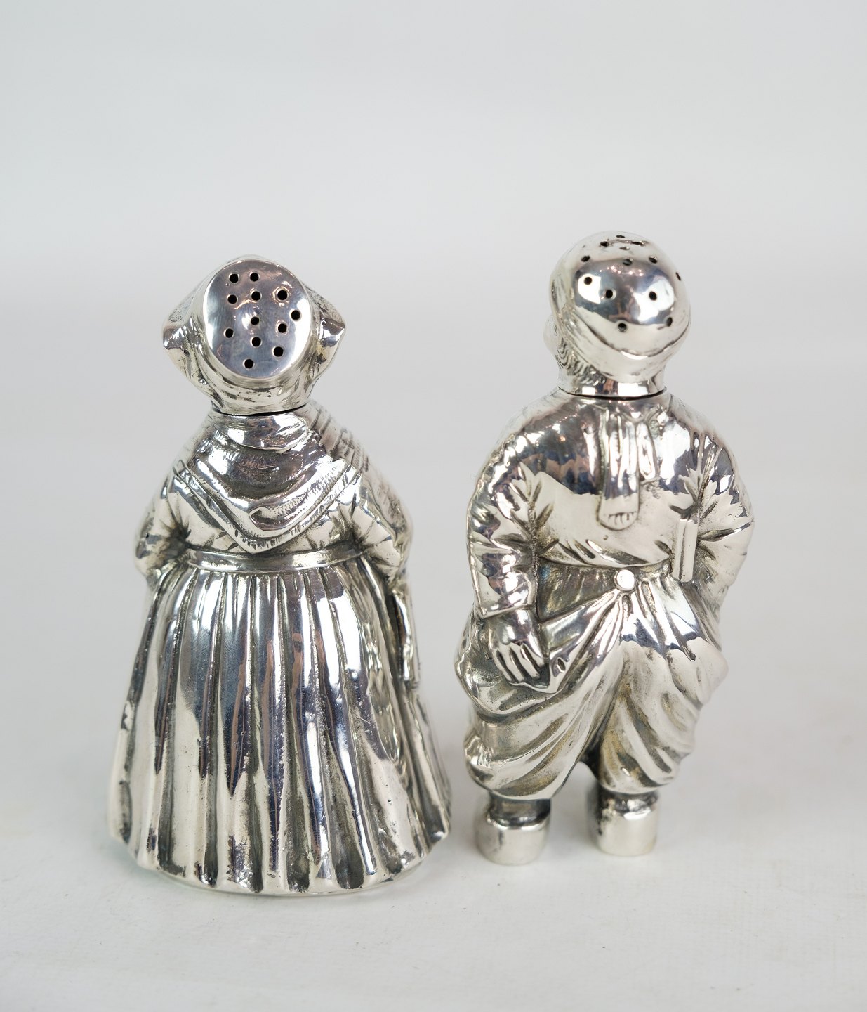 Salt and pepper shaker in silver, stamped 830, designed as a man and a woman. Weight: 325g