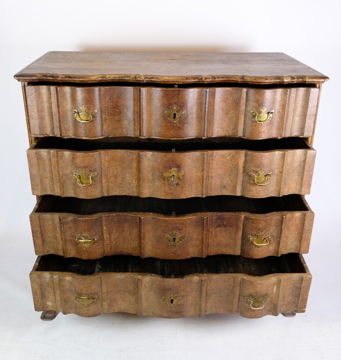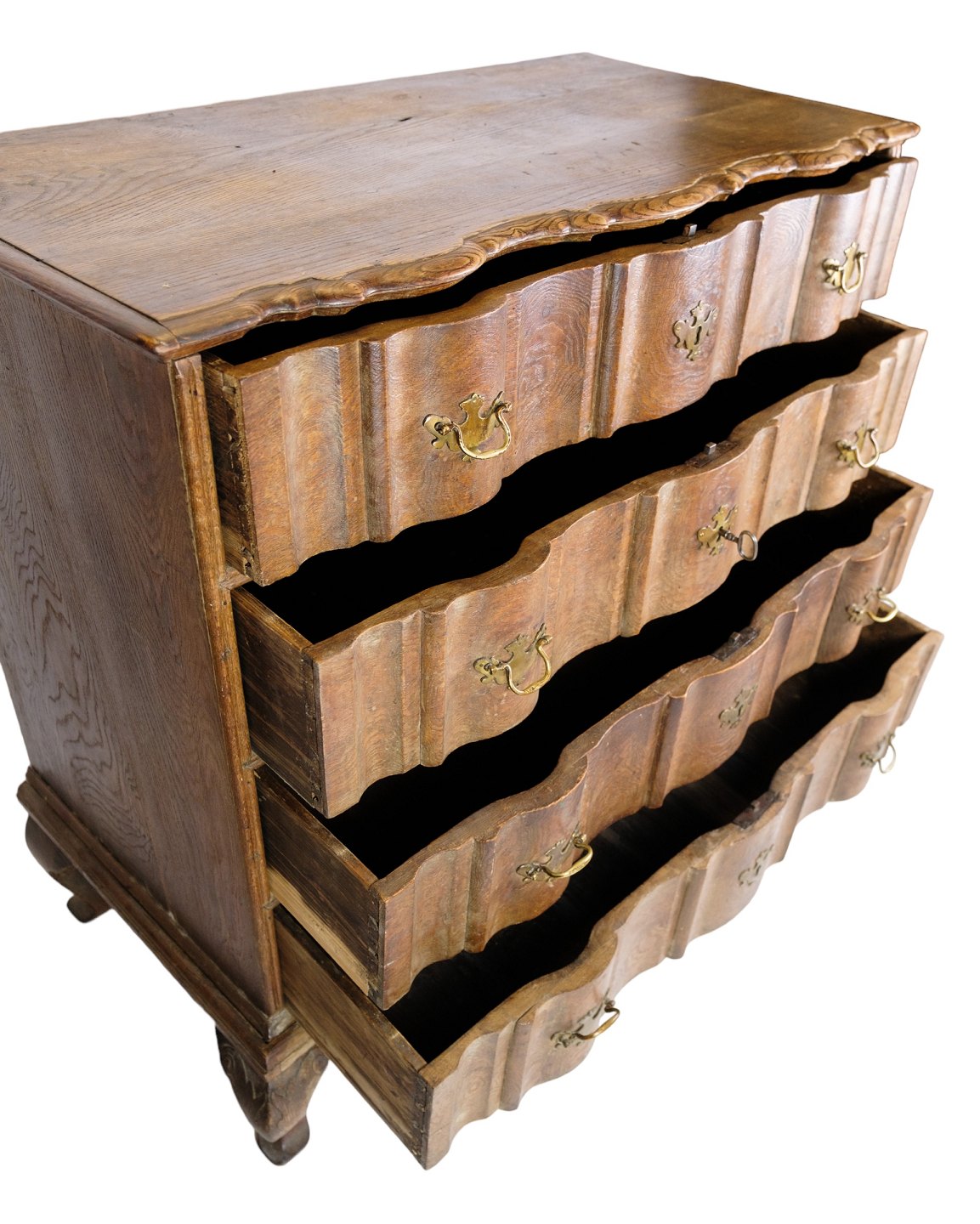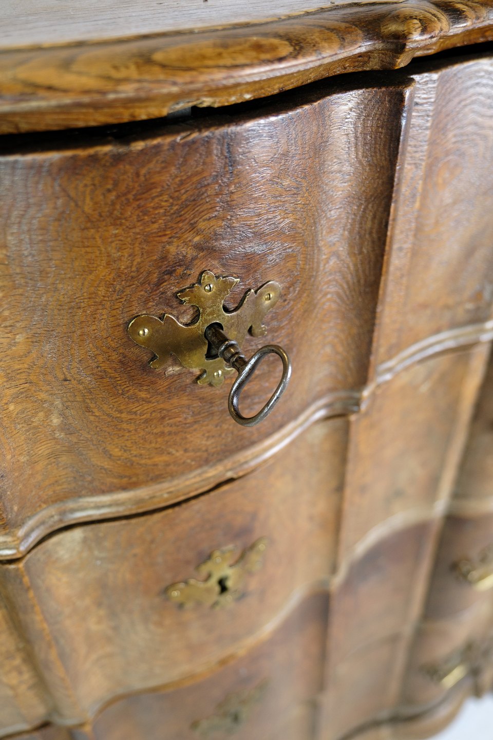 SolgtBarok dragkiste i egetræ med messing beslag udsmykket med træudskæringer fra perioden omkring 1780'erne.