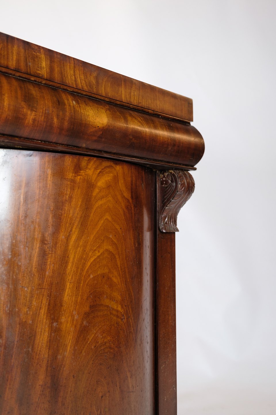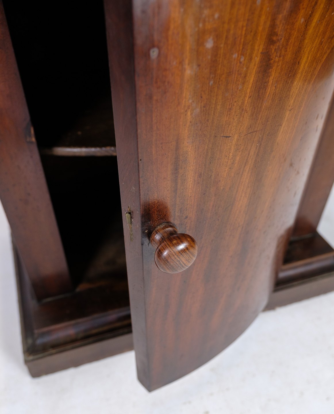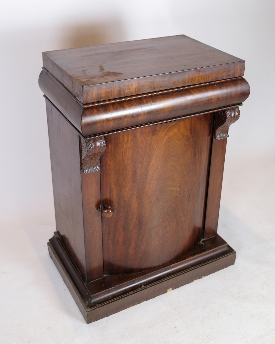 Entré møbel af mahogni med en låge med buede front dekoreret med udskæringer fra omkring 1860'erne.