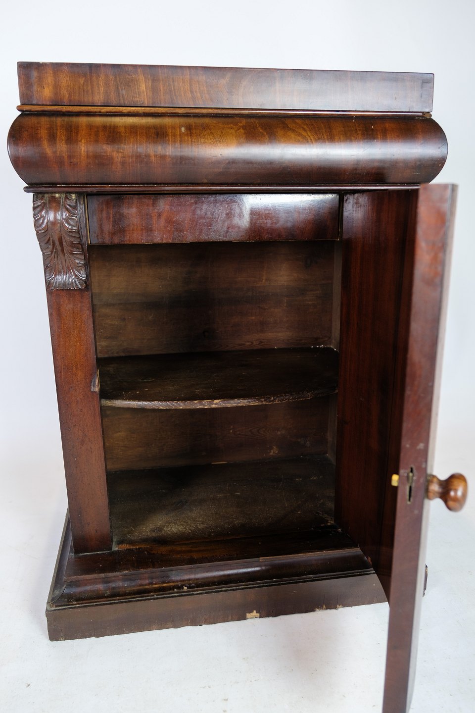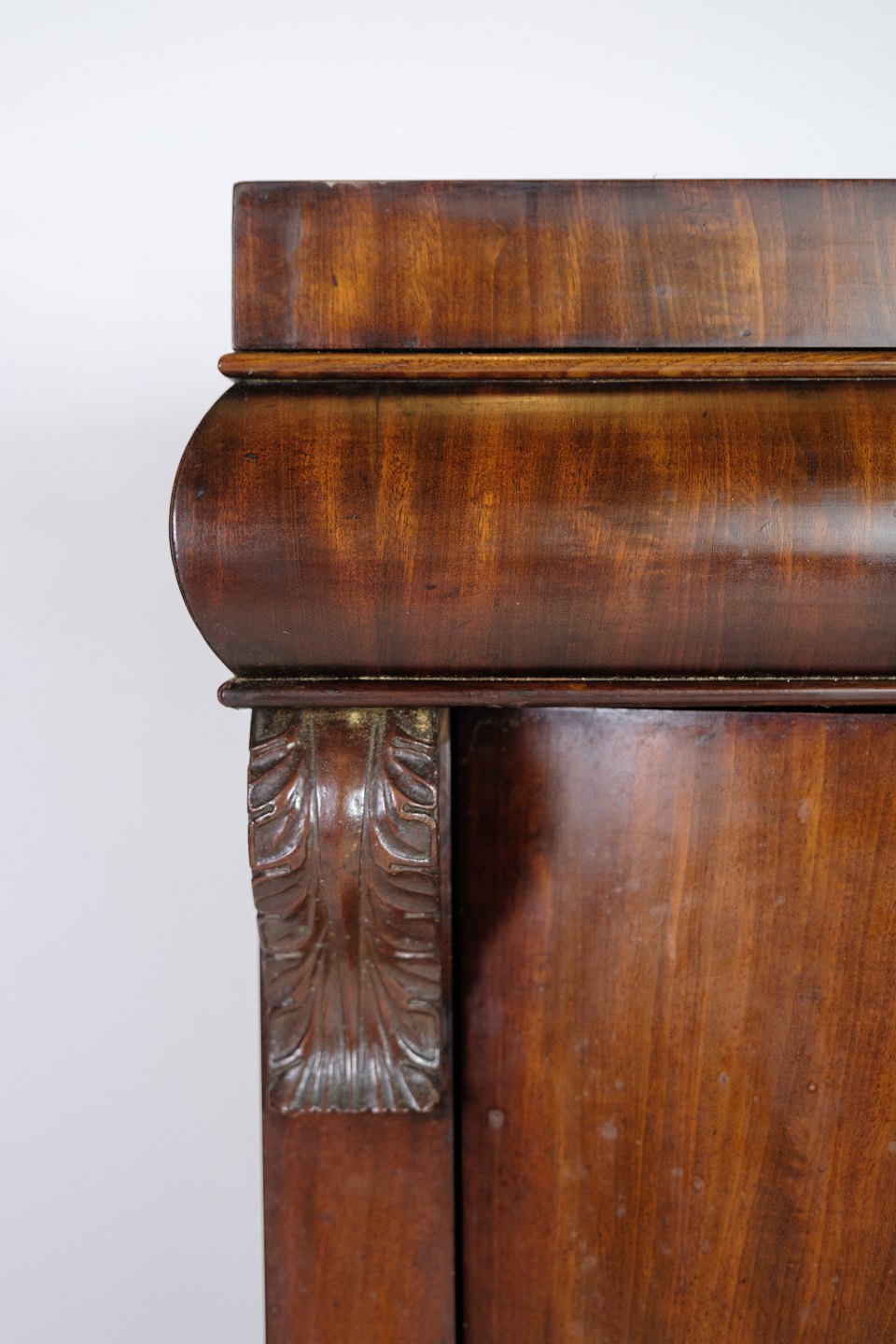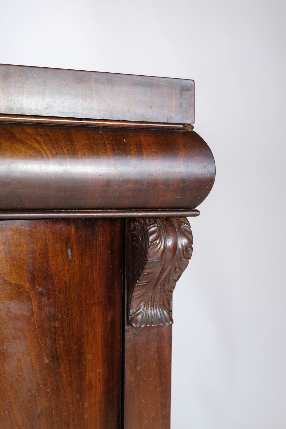 Entré møbel af mahogni med en låge med buede front dekoreret med udskæringer fra omkring 1860'erne.