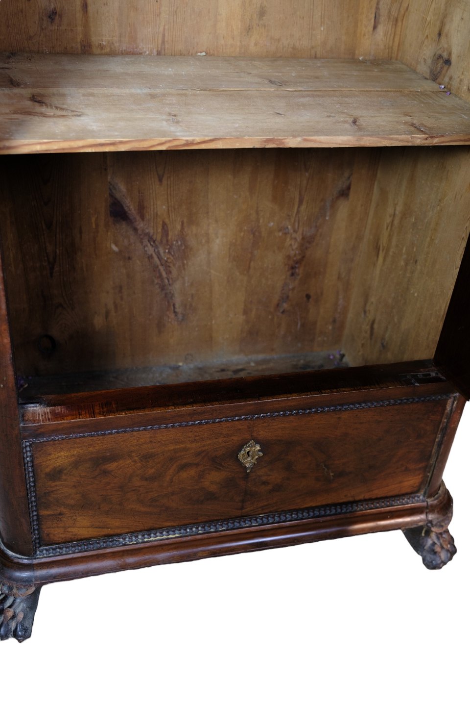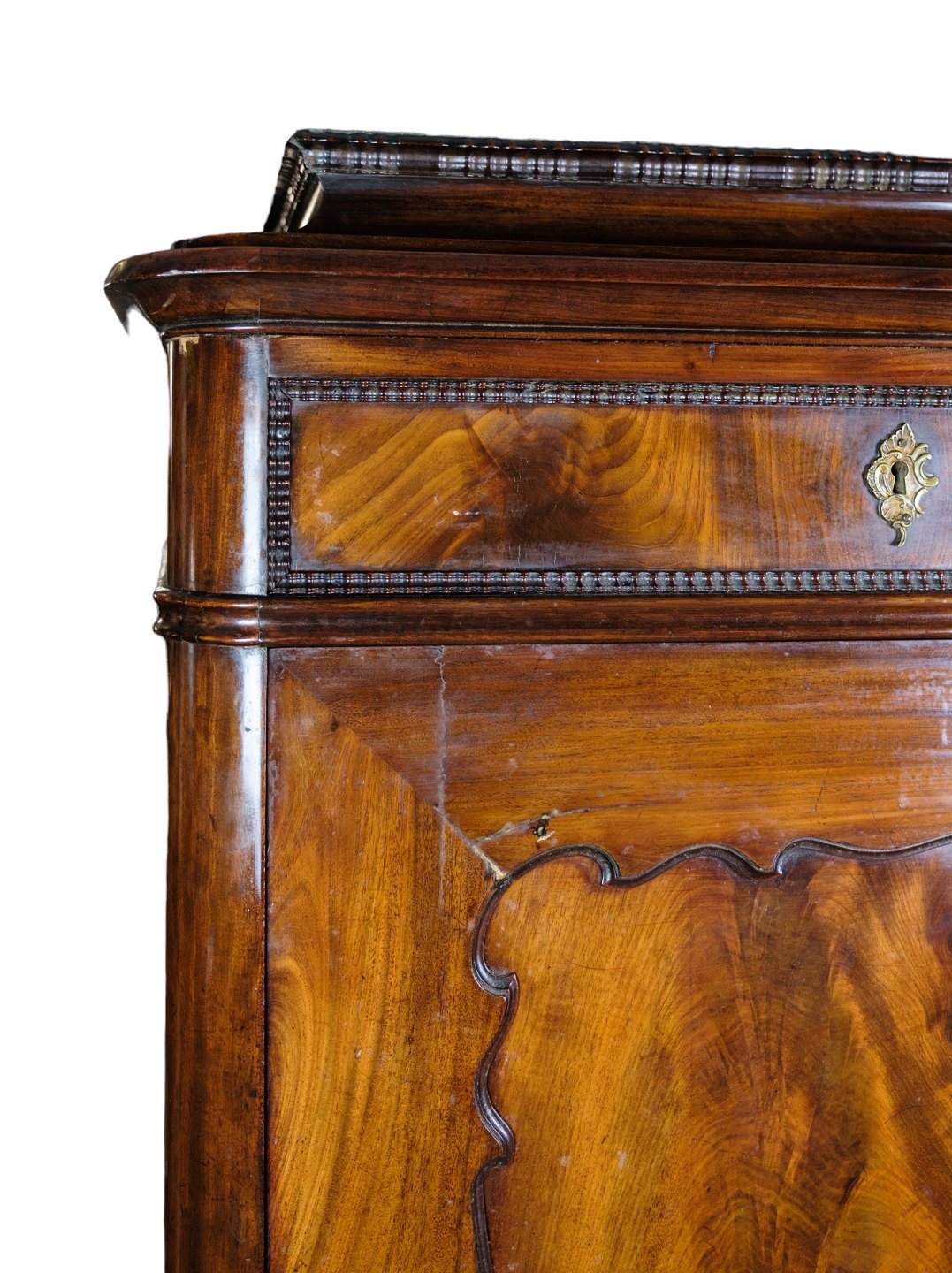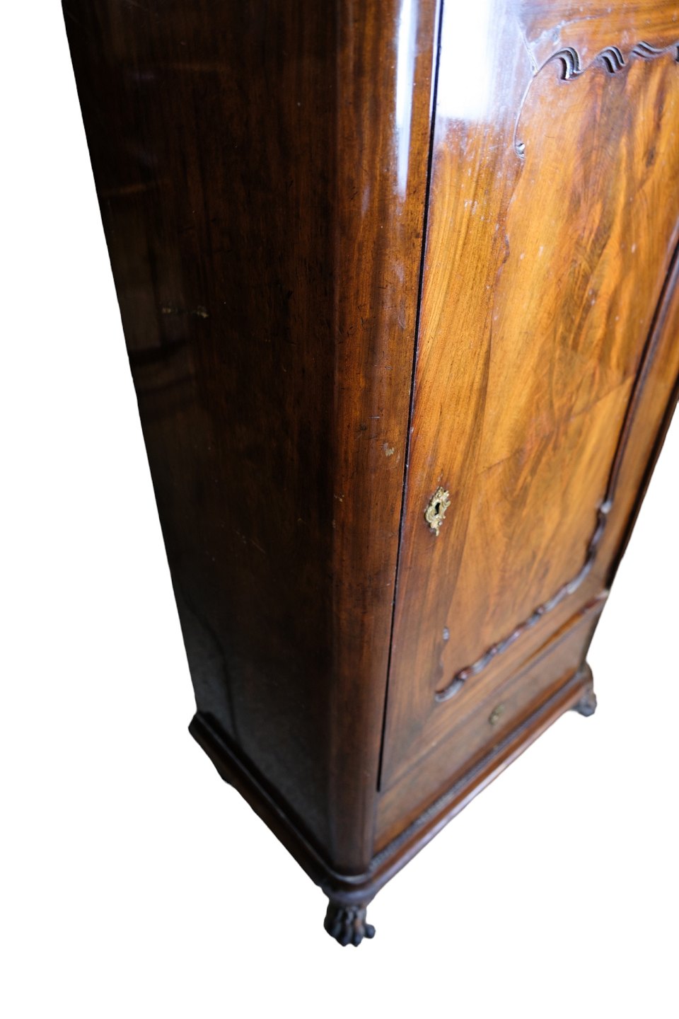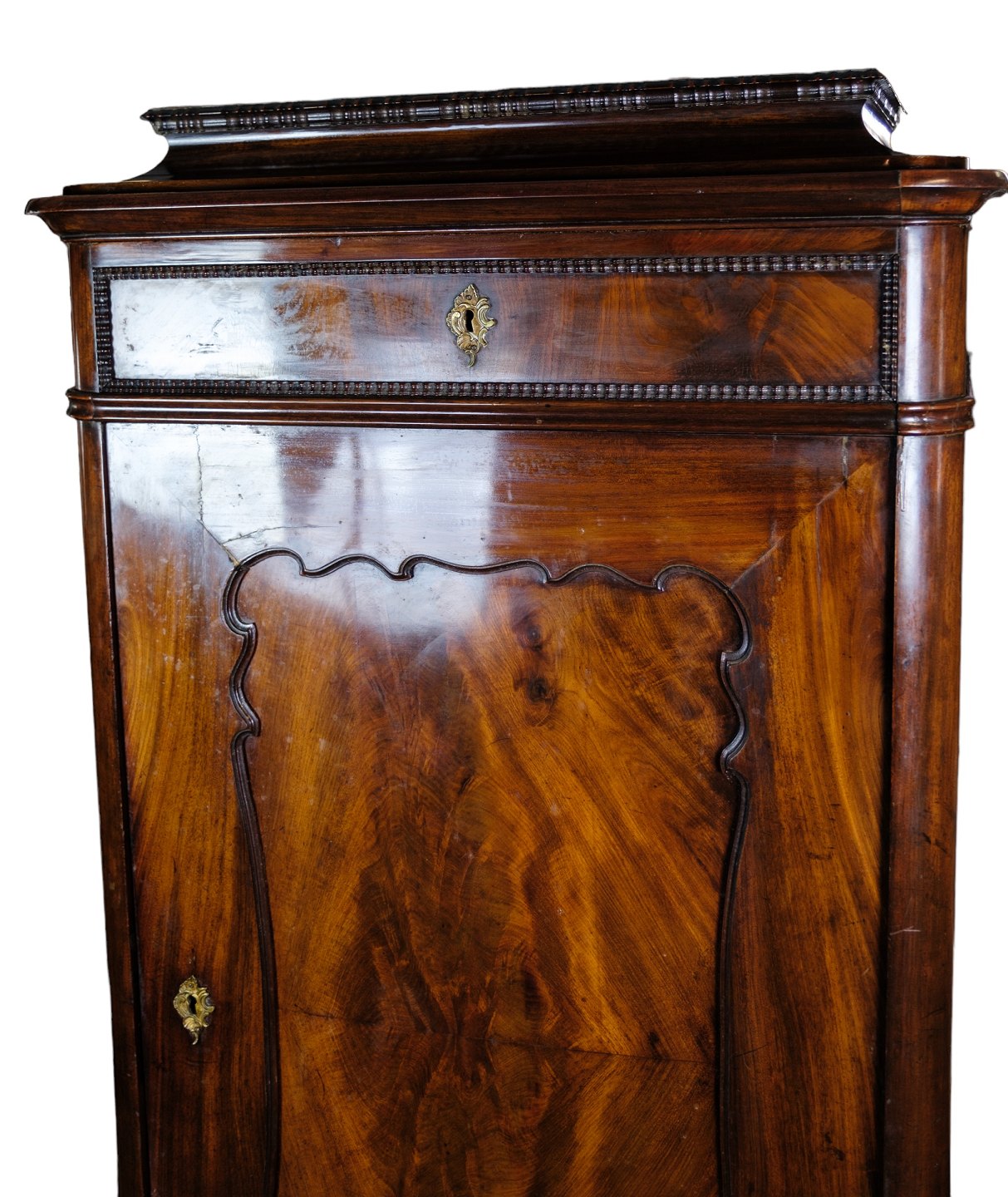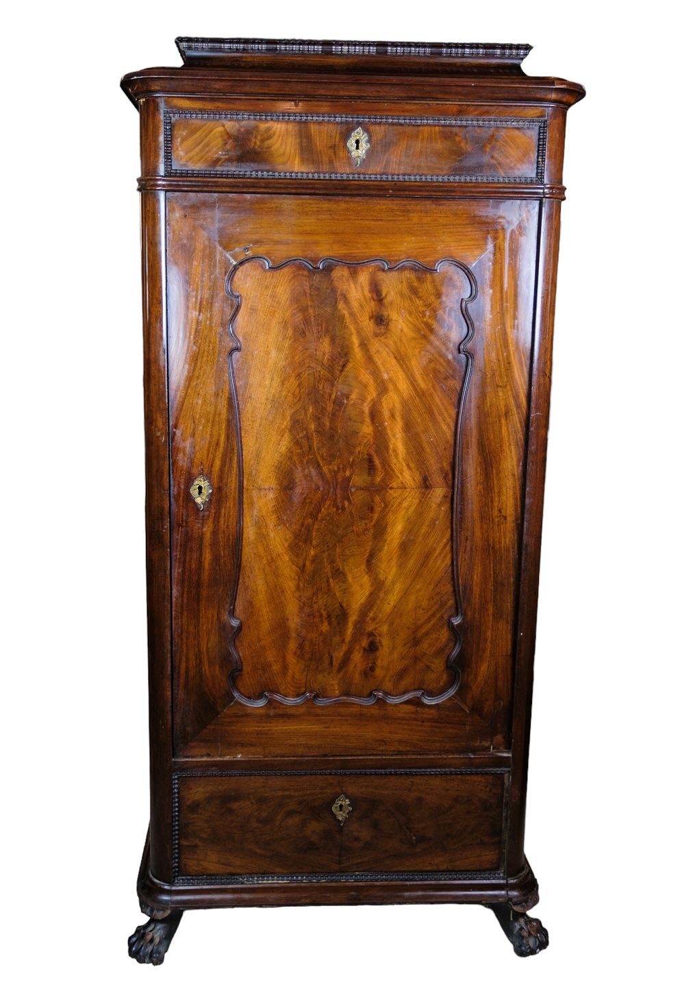 Tall cabinet of polished mahogany in beautiful antique condition with 2 drawers and a door with shelves from the 1850s.