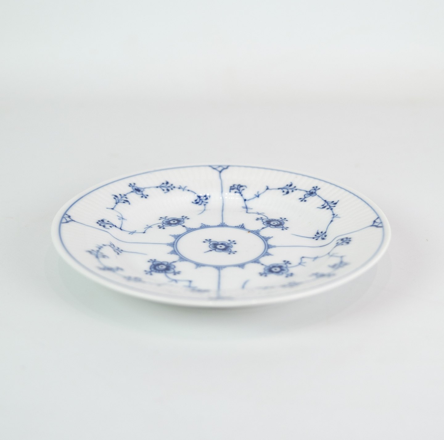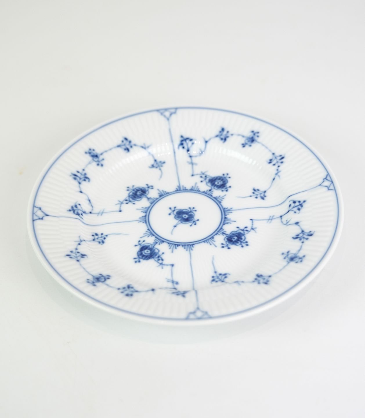 SolgtRoyal Copenhagen Musselmalet Riflet 180-1 sidetallerken er en smuk og klassisk del af den ikoniske Musselmalet Riflet-serie, der har prydet bordene i generationer.
