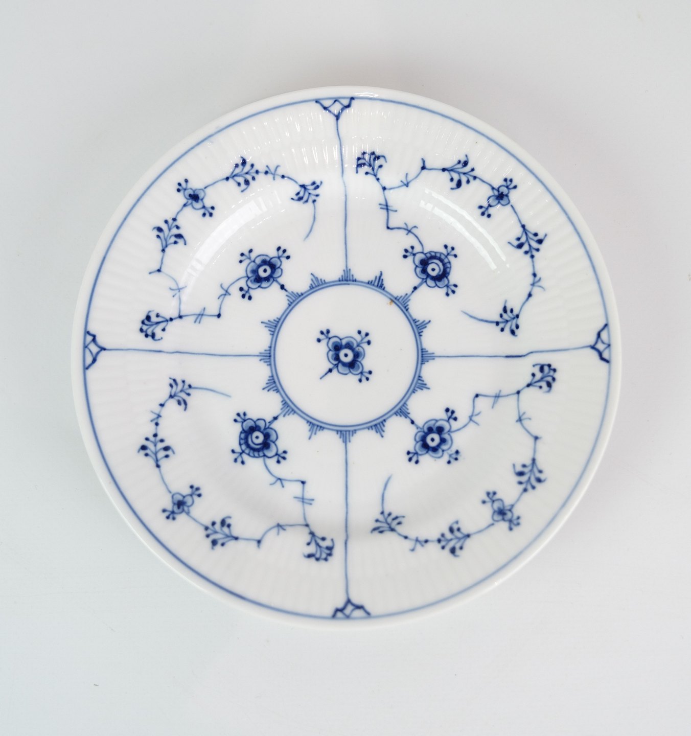 Denne sidetallerken bærer det karakteristiske Musselmalet-mønster, der består af delikate blåmønstre, der pryder tallerkenens overflade. Dette mønster er blevet synonymt med Royal Copenhagen og dansk porcelænstradition.