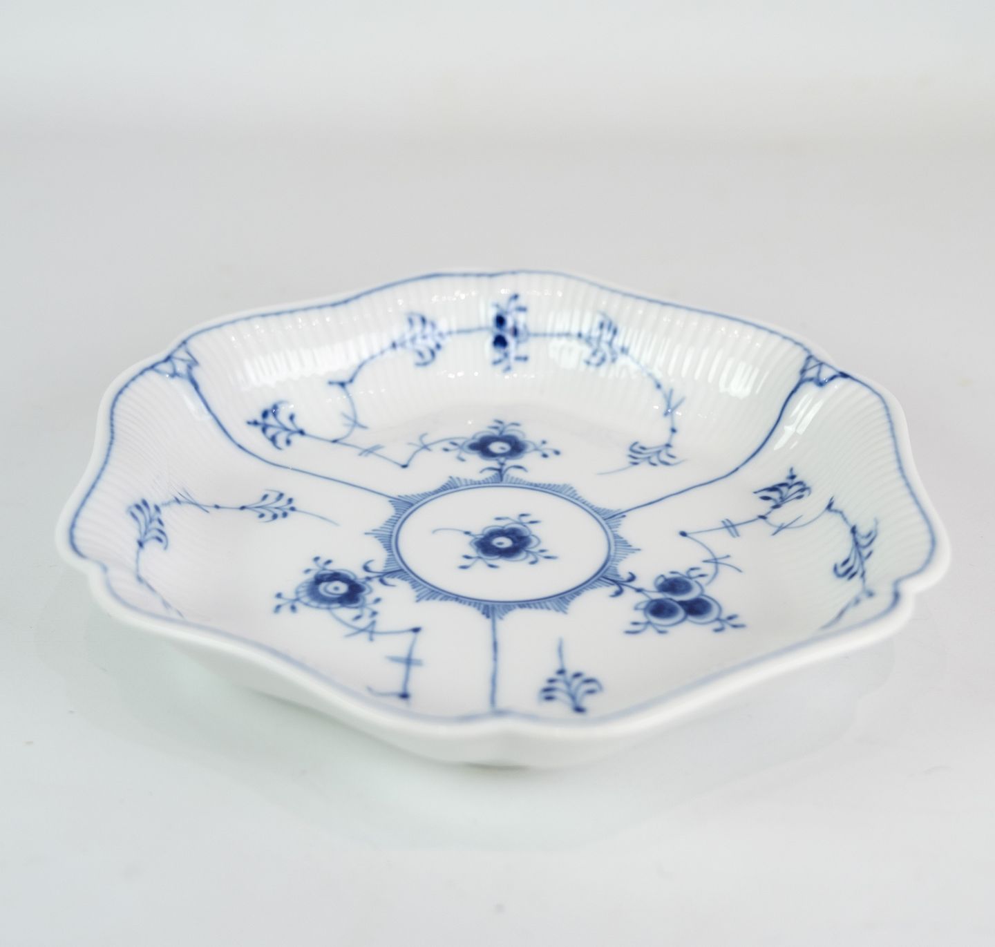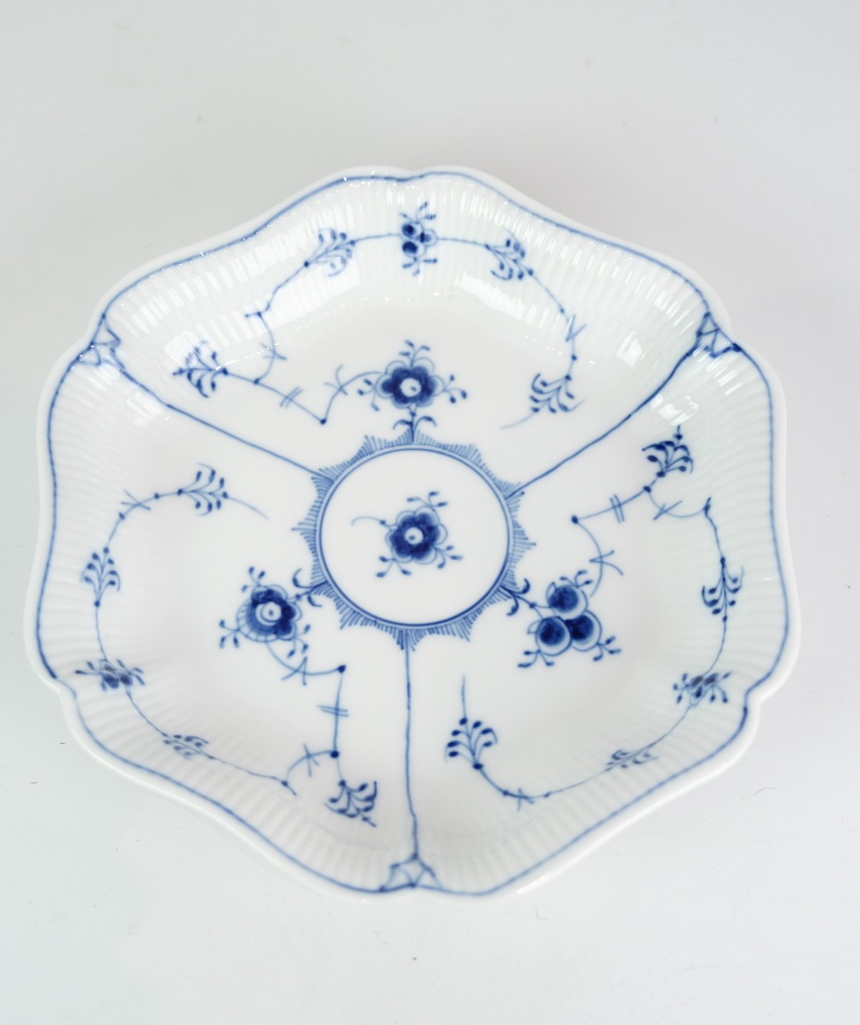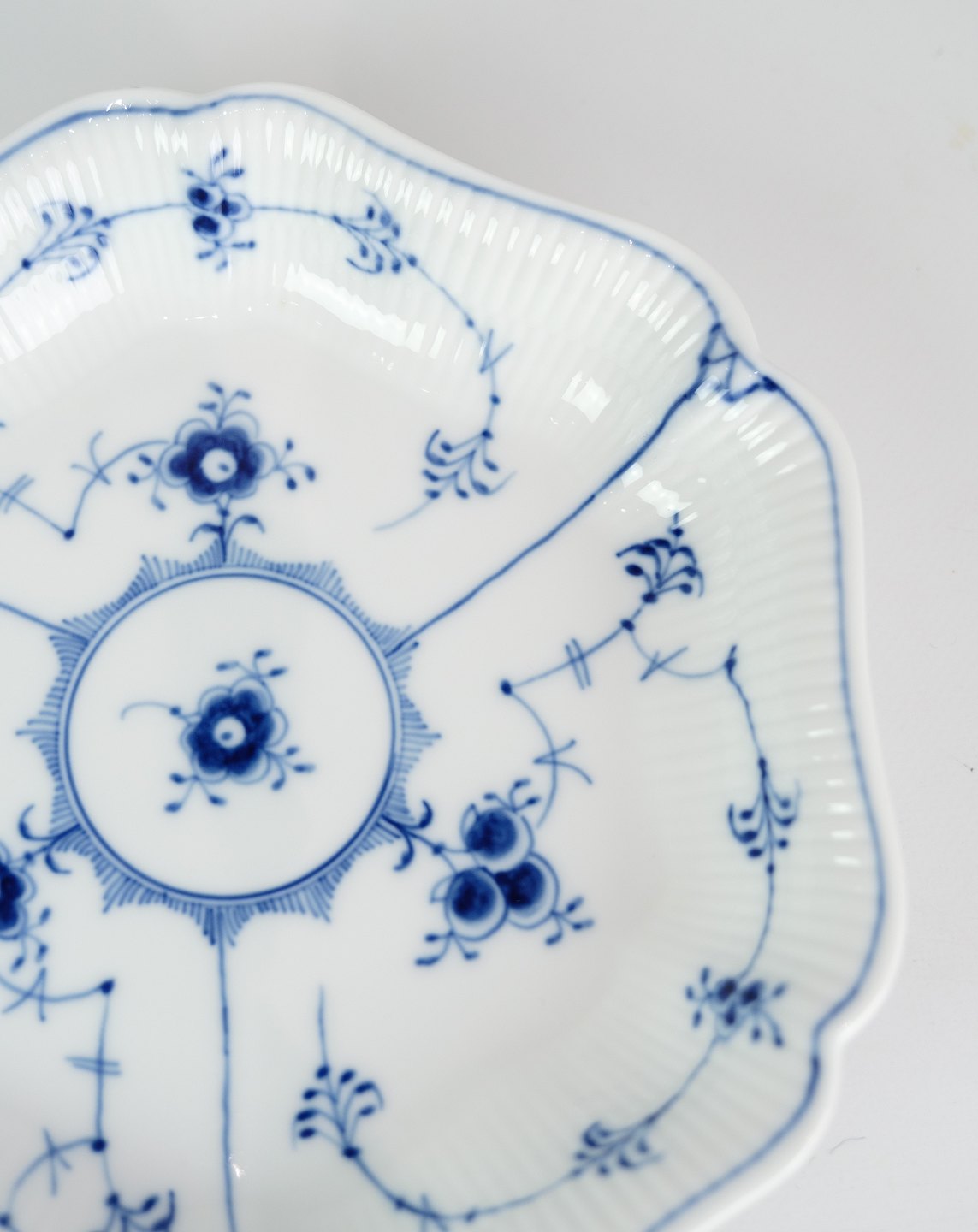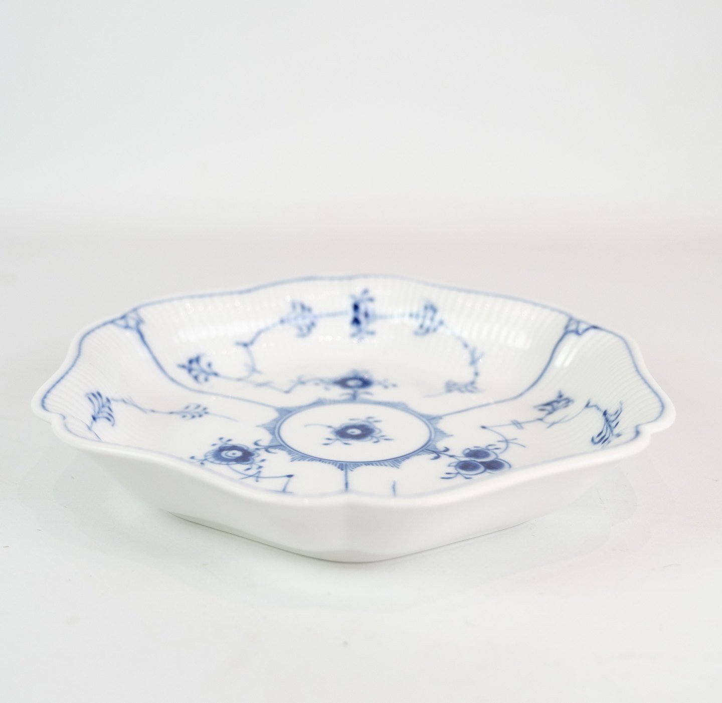 This cake pan is part of the iconic Musselmalet Fluted series, which combines the characteristic Fluted pattern with a hexagonal shape. The pattern consists of delicate blue patterns that adorn the surface of the dish and give it a timeless appearance.