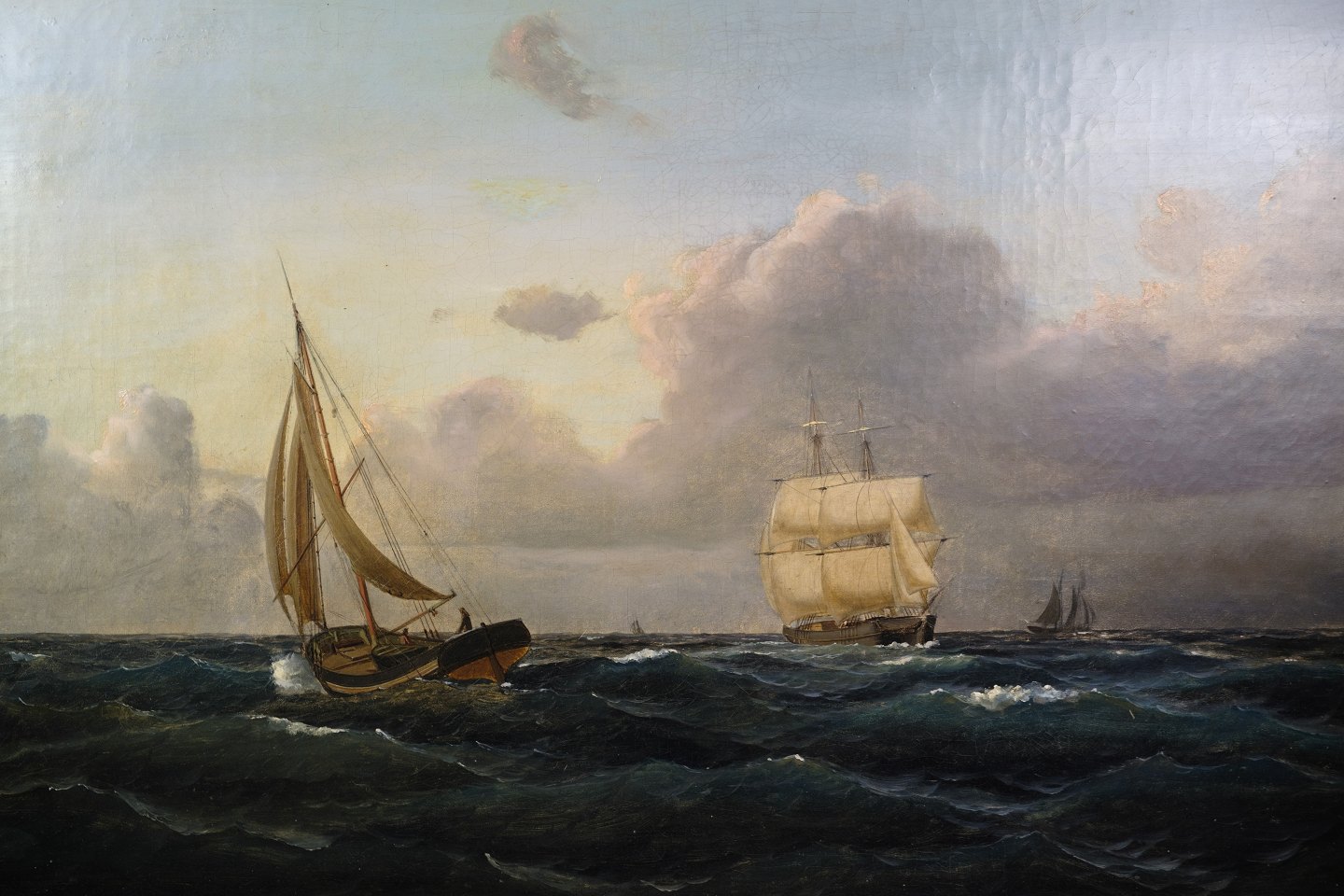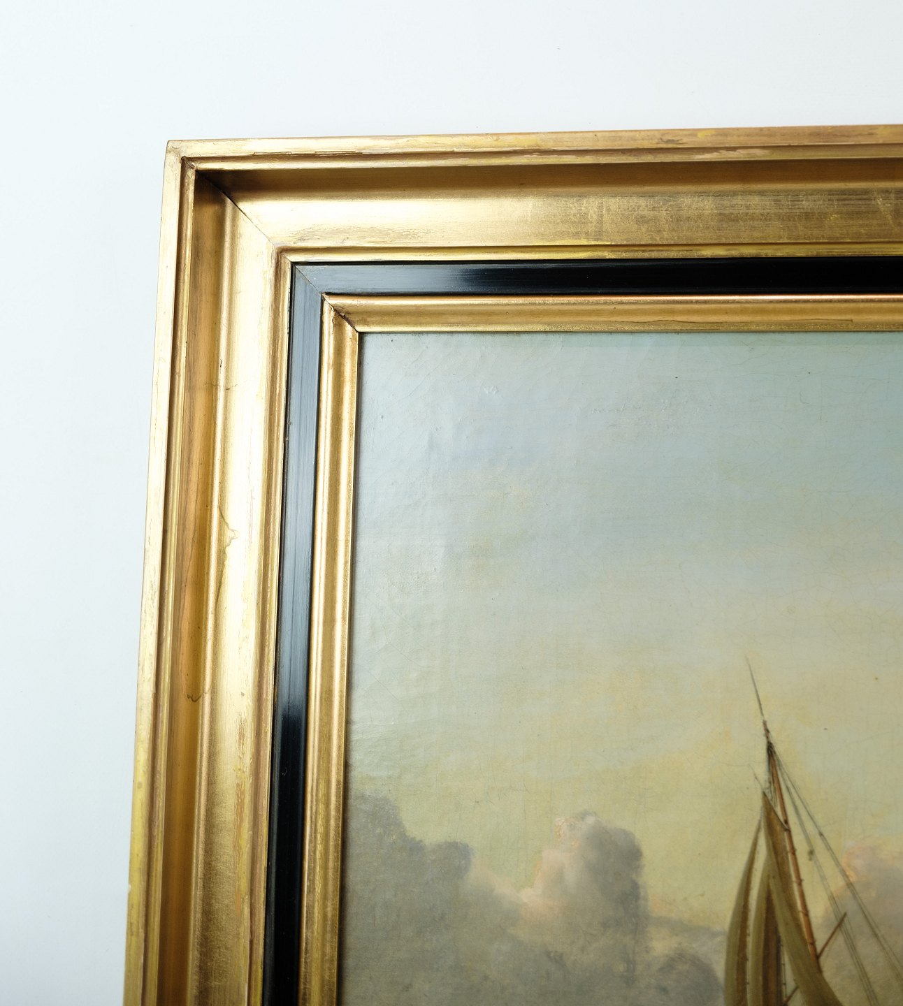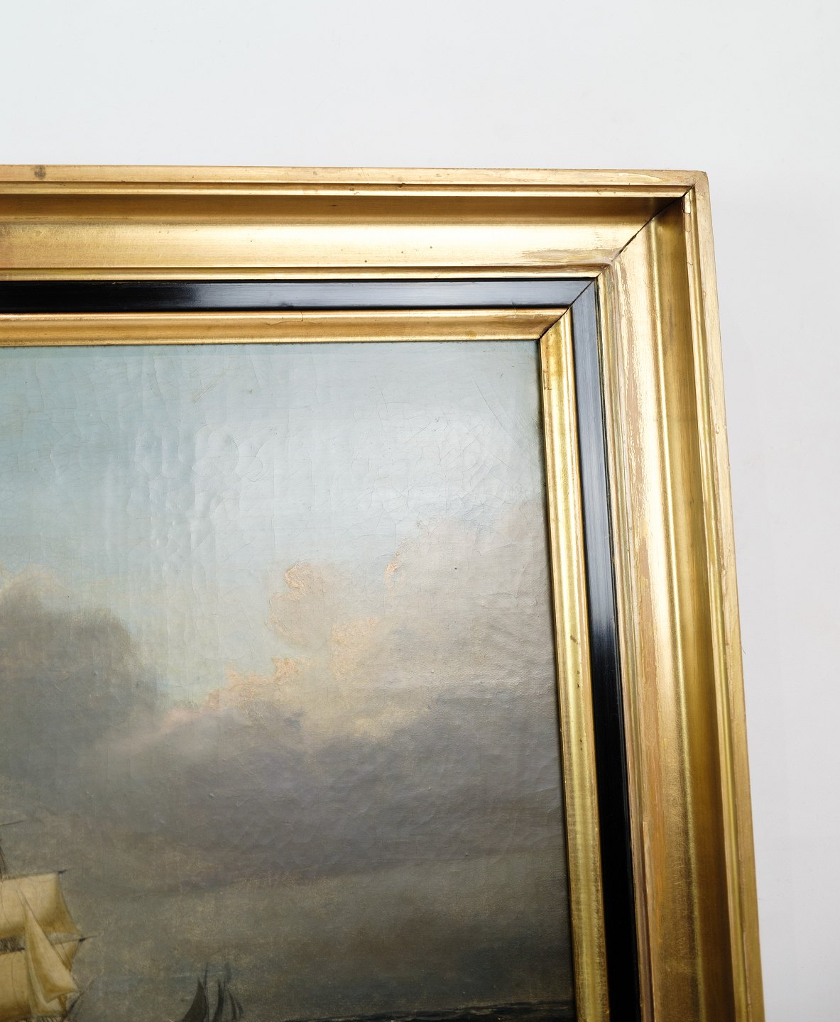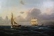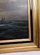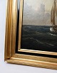 Marine Oliemaleri med motiv af hav og både i en ramme med bladguld tilskrevet Carl Olsen (1818-1878)