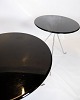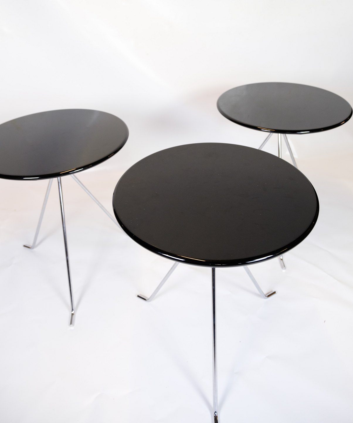 Sofabords sæt bestående af 3 små runde borde med krom ben med folde mekanisme og sort overflade originalt fra Danmark.