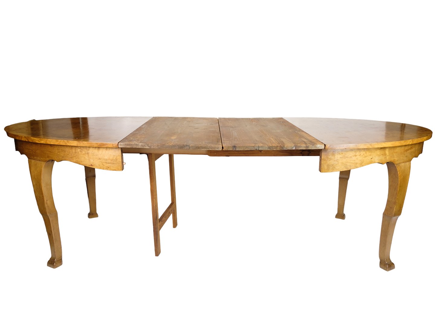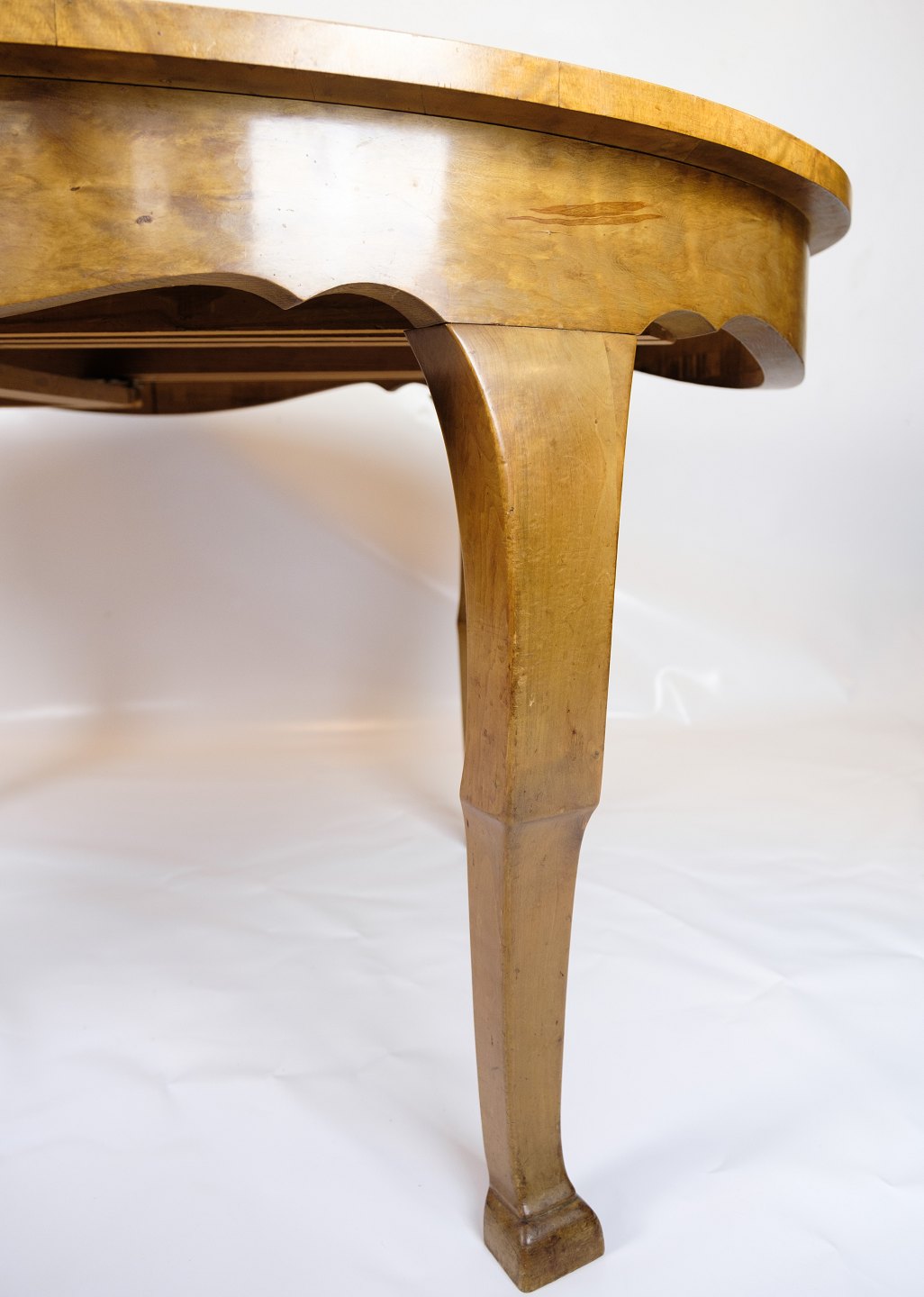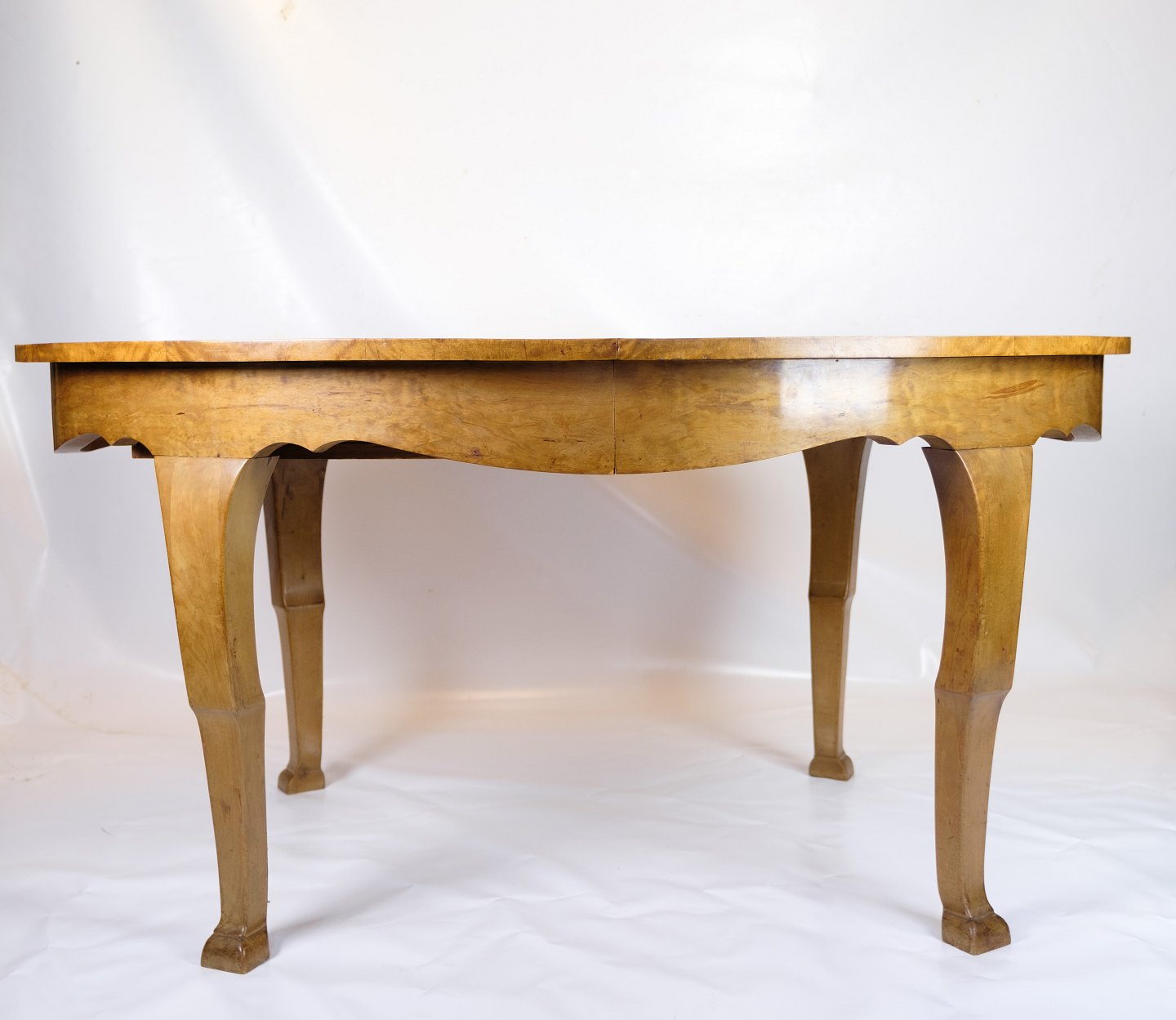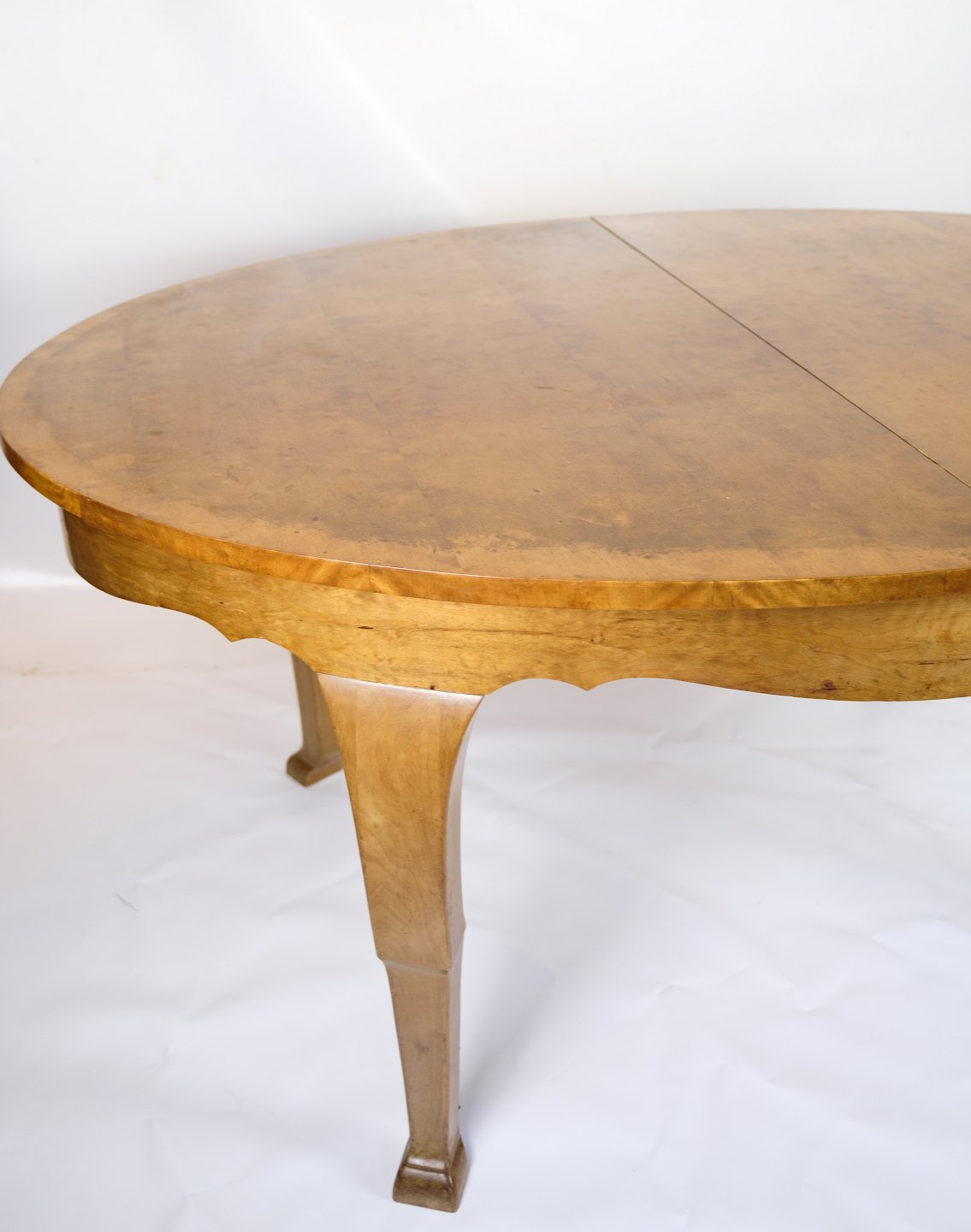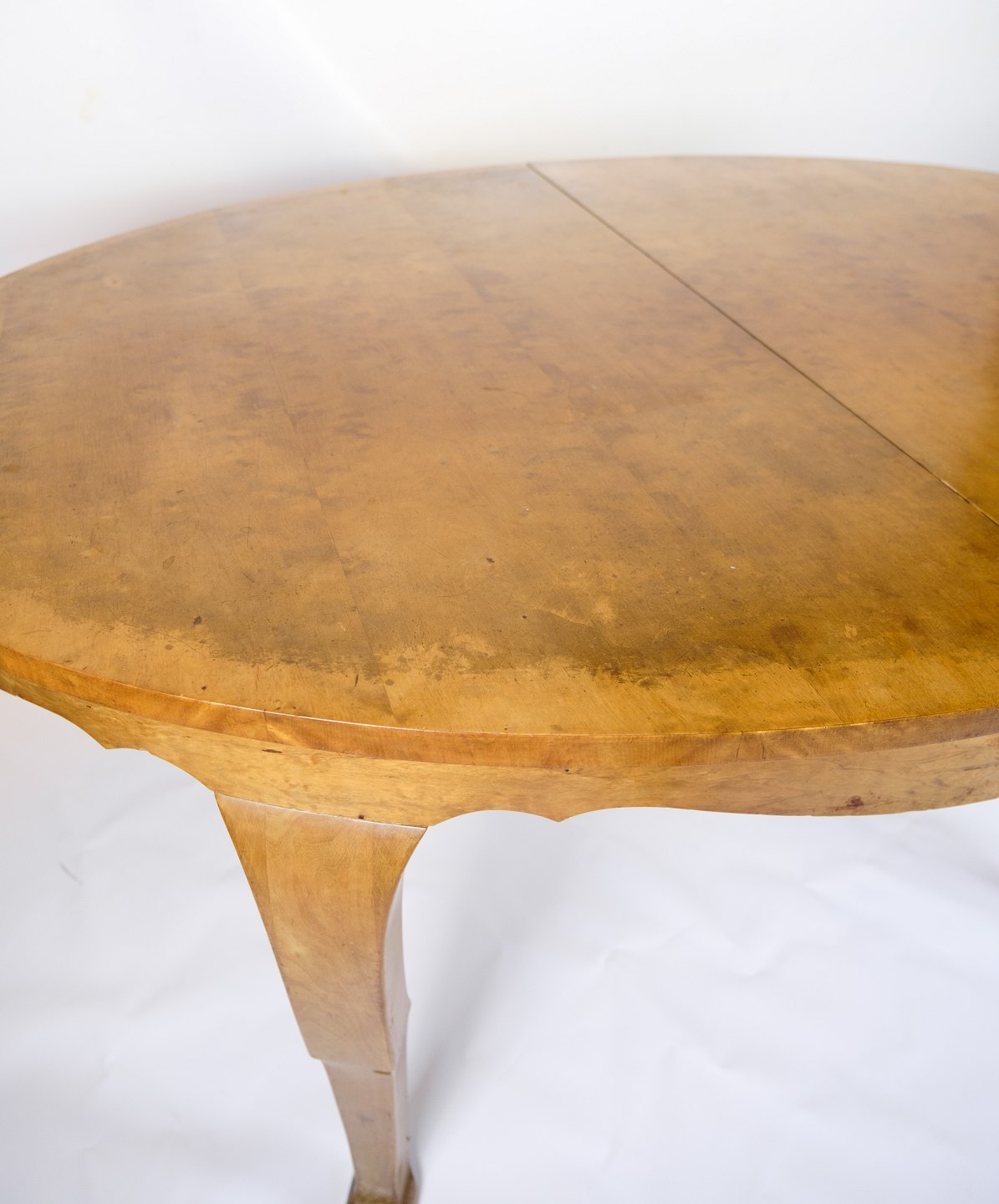 SoldDining table with additional plates made of birch wood from around the 1920s.