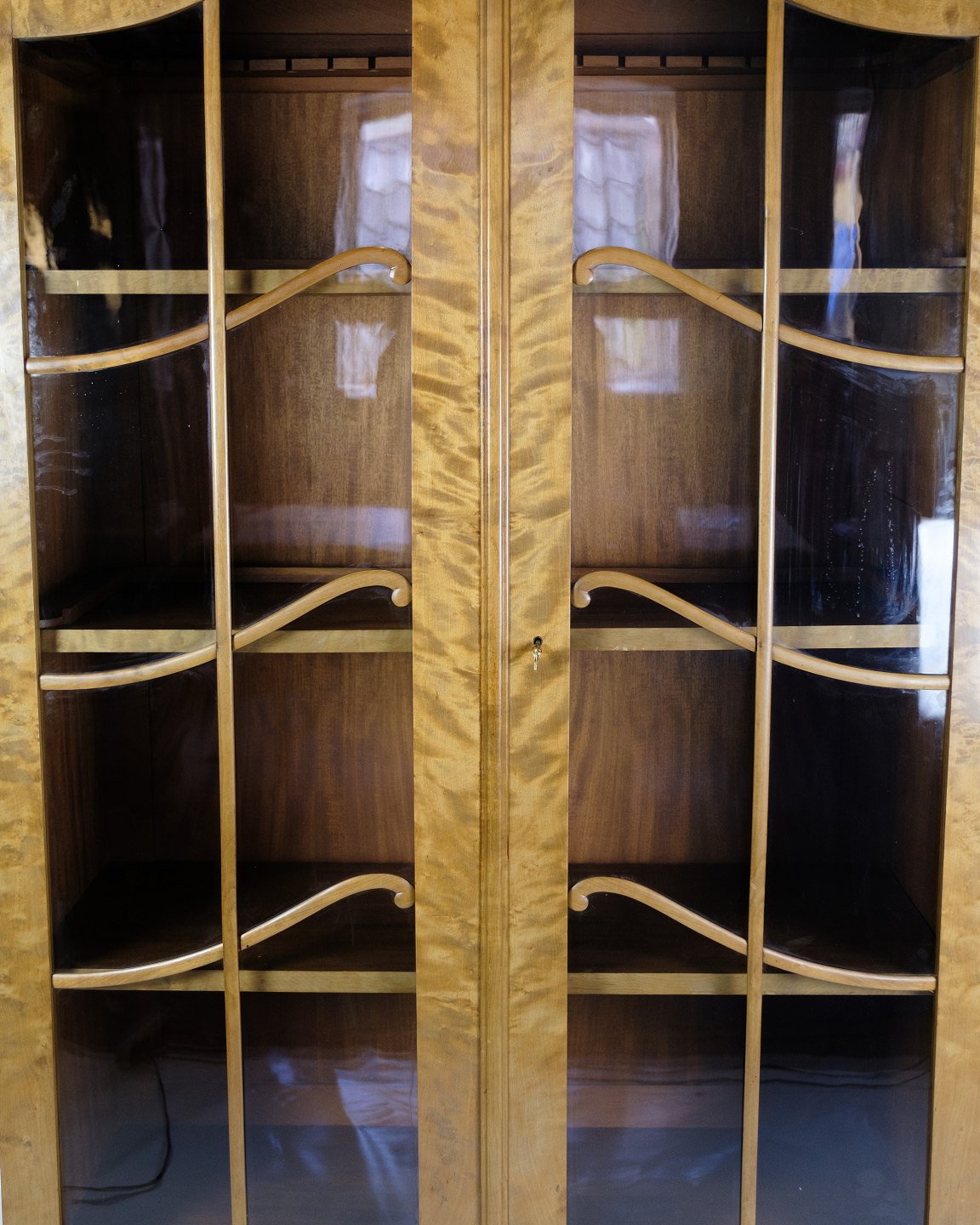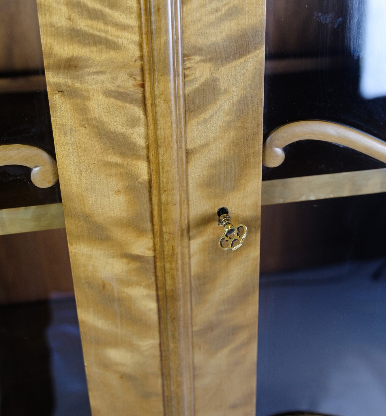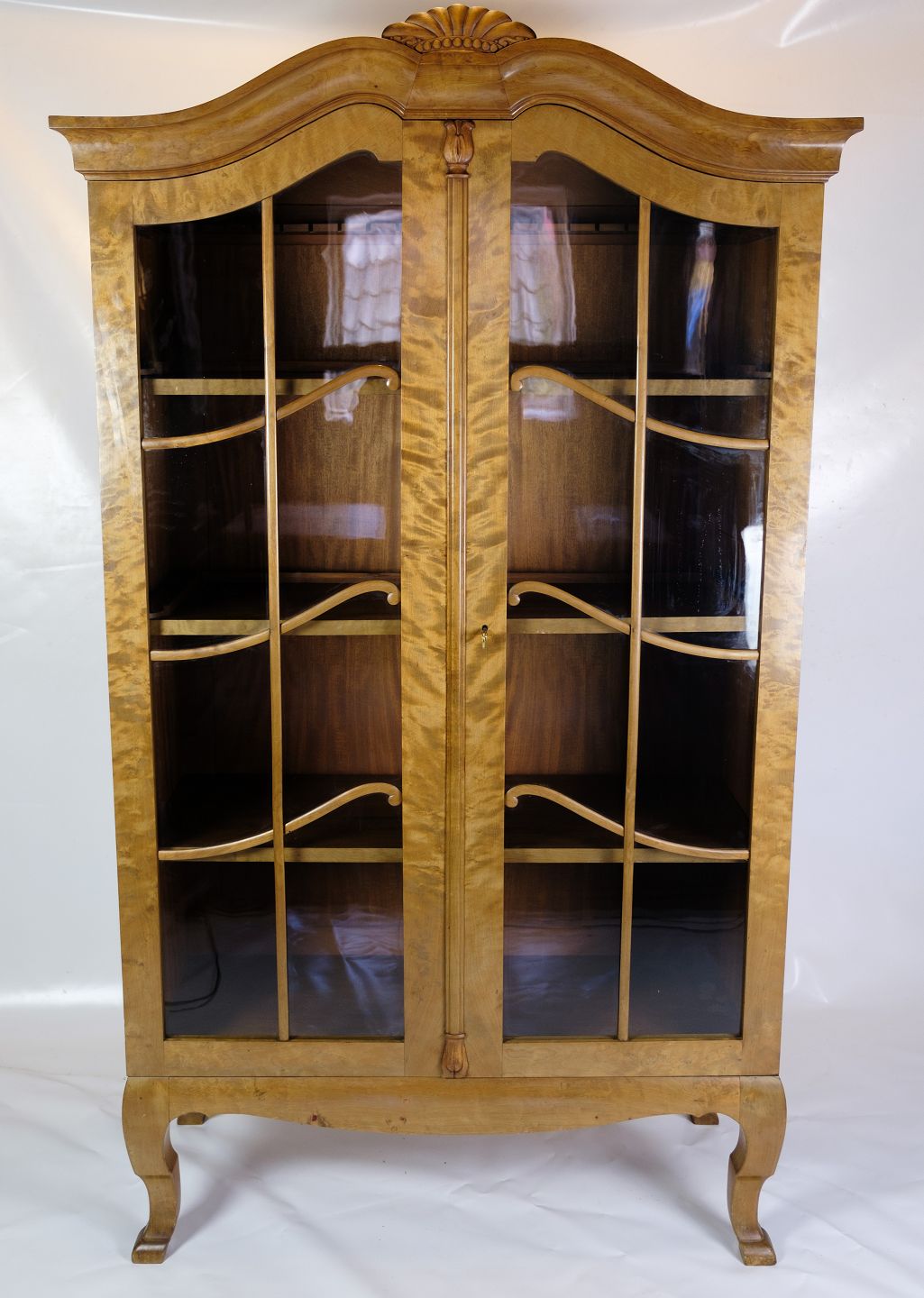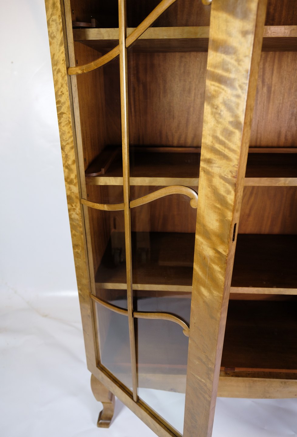 Vitrineskab af birketræ med 3 hylder og glasruder fra omkring år 1920'erne.