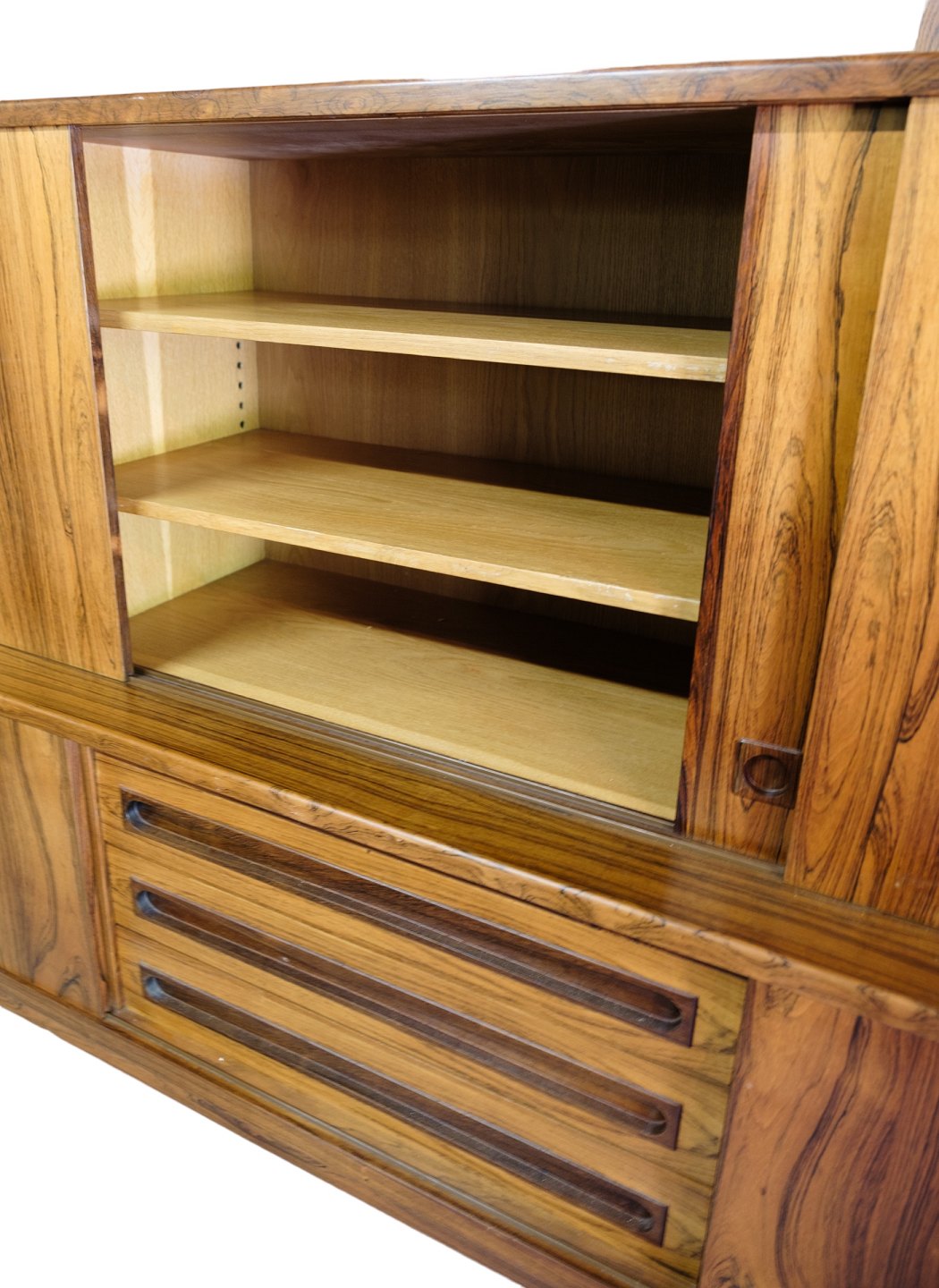 Den høje skænk i palisander, designet af Johannes Andersen og produceret af Skaaning Møbelfabrik omkring 1960'erne, er et imponerende eksempel på dansk møbelkunst fra denne periode.
