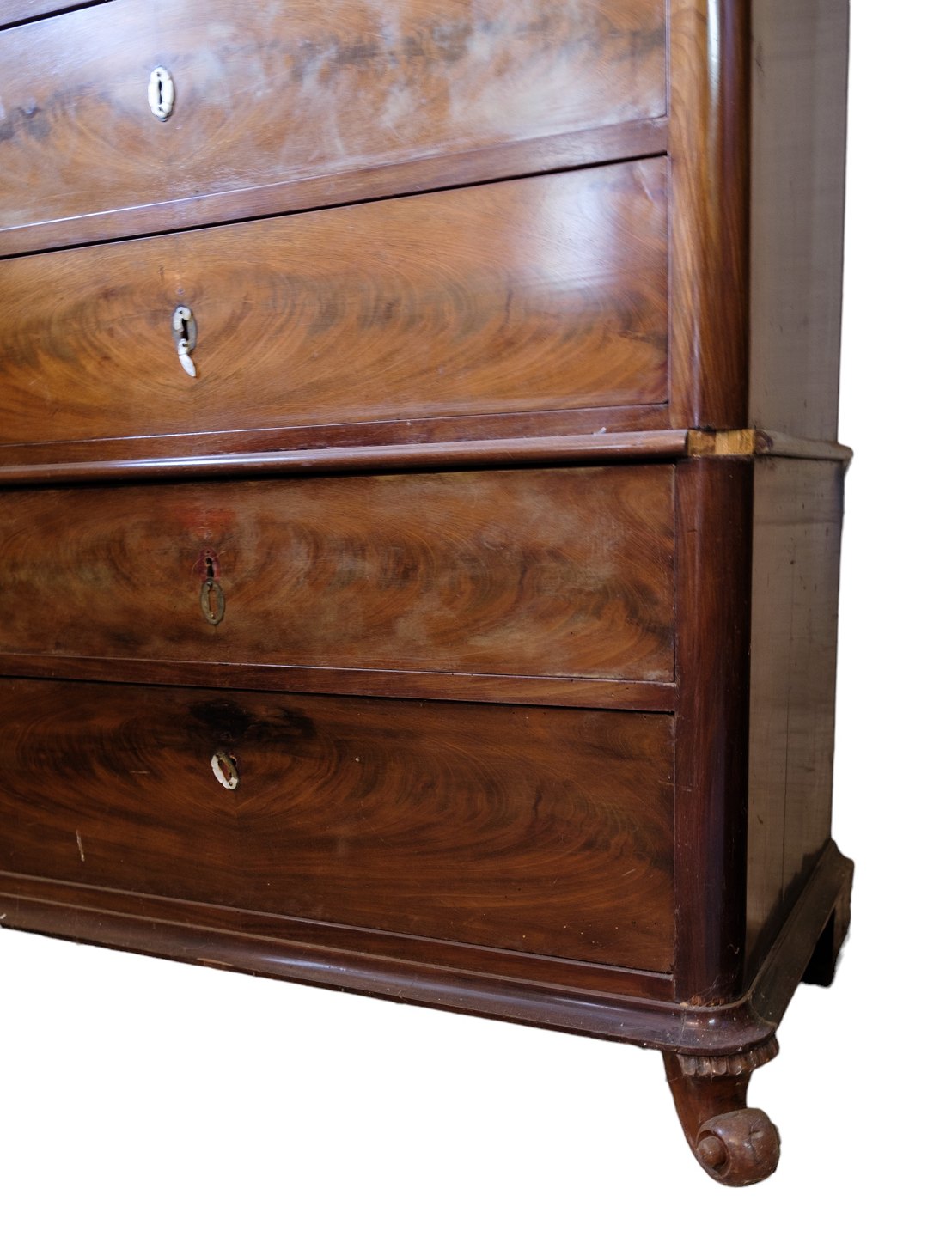 High mahogany chest of drawers with 7 drawers from around the 1840s. Will be inspected at the workshop before possible sale.