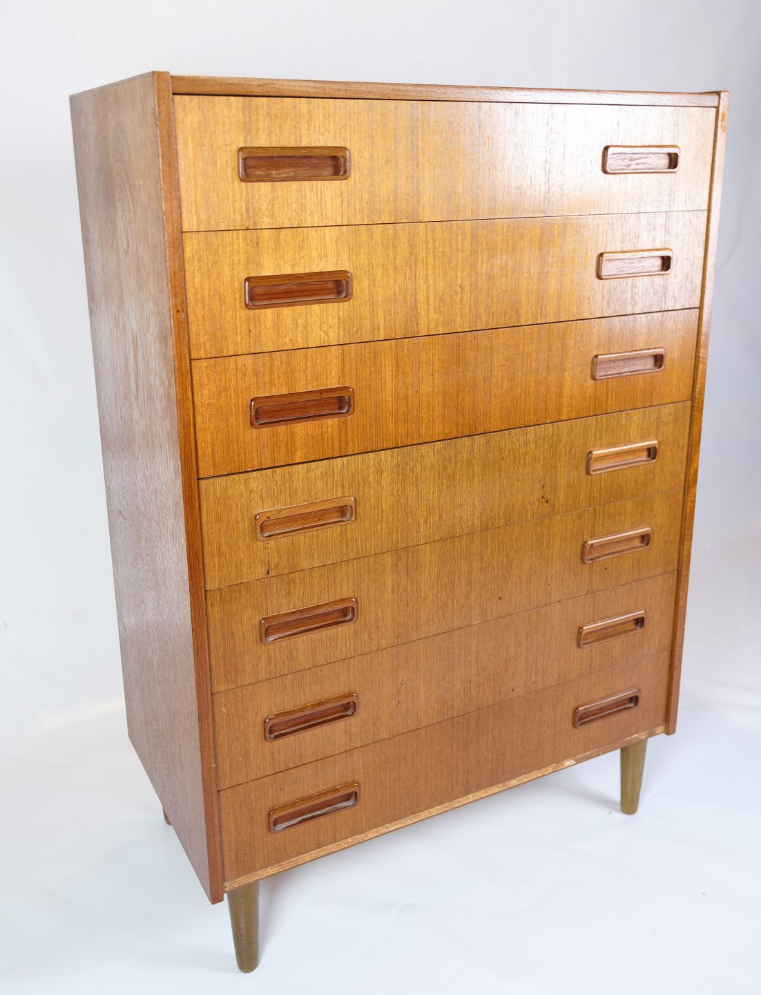Denne kommode af dansk design, skabt omkring 1960'erne, er et smukt eksempel på den tidløse elegance og funktionalitet, der kendetegner dansk møbeldesign. Fremstillet af teaktræ udstråler kommoden en varm og naturlig skønhed, der passer perfekt til forskellige indretningsstile.