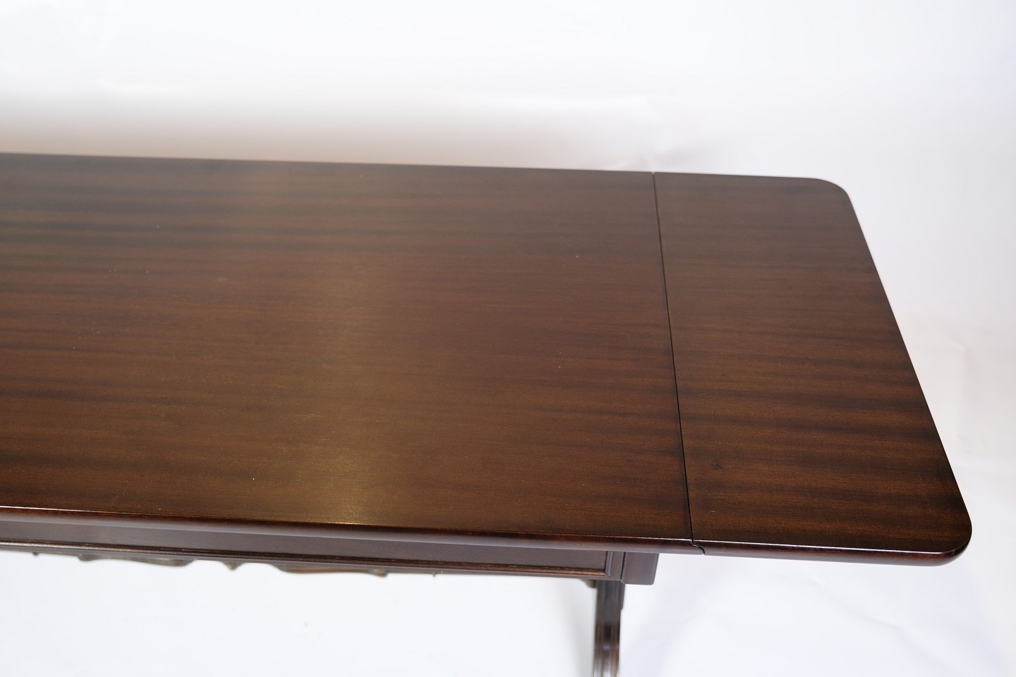 Mahogany coffee table by a Danish master carpenter decorated with lion feet of brass and wood carvings from around the 1920s.