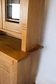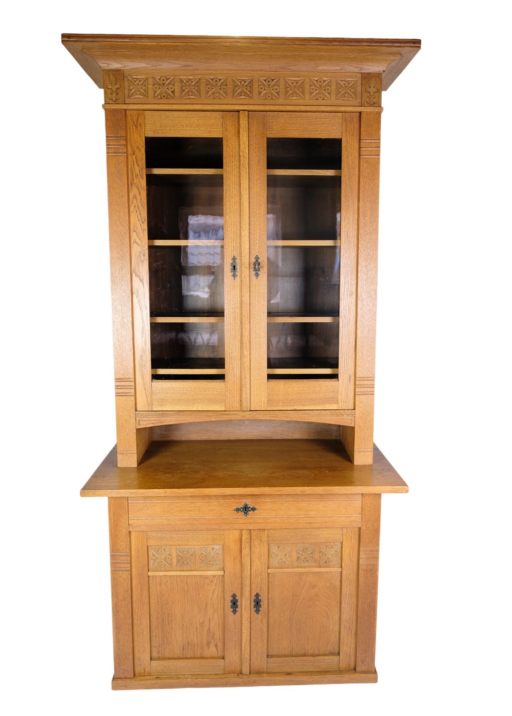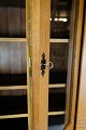 Tall display cabinet made of oak with glass doors and internal shelves with original key from around the 1880s.