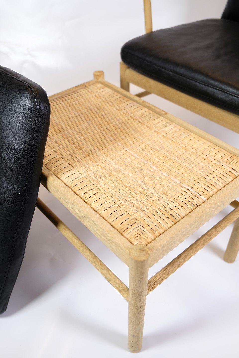 The oak's natural warmth and elegant grain structure, combined with the black leather cushion, contribute to the chairs' timeless appeal. The accompanying footstool adds extra comfort and completes the experience of luxury and well-being.