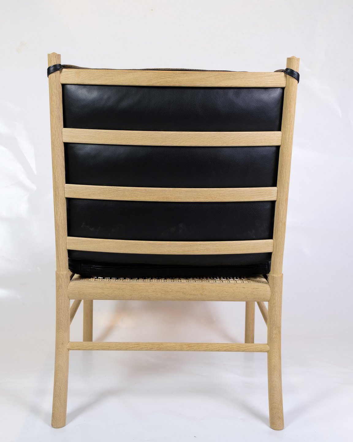 SoldAn oak armchair, model OW149, with black leather cushions designed by Ole Wanscher and manufactured by PJ Møbler in the 1960s, is a masterpiece of timeless elegance and exceptional craftsmanship.