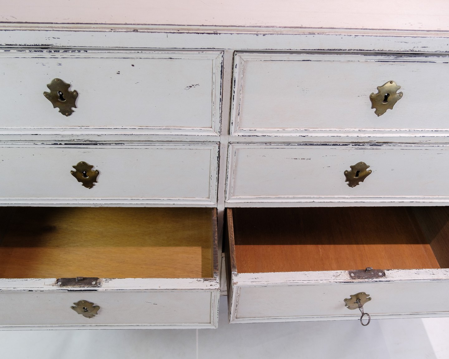 Denne kommode er ikke kun et visuelt mesterværk, men også en praktisk opbevaringsløsning. Med 8 rummelige skuffer tilbyder den en harmonisk kombination af form og funktion. De runde ben og det omhyggeligt forarbejdede træværk bidrager ikke blot til æstetik, men giver også et smukt eksempel på møbelhåndværk fra en svunden tid.