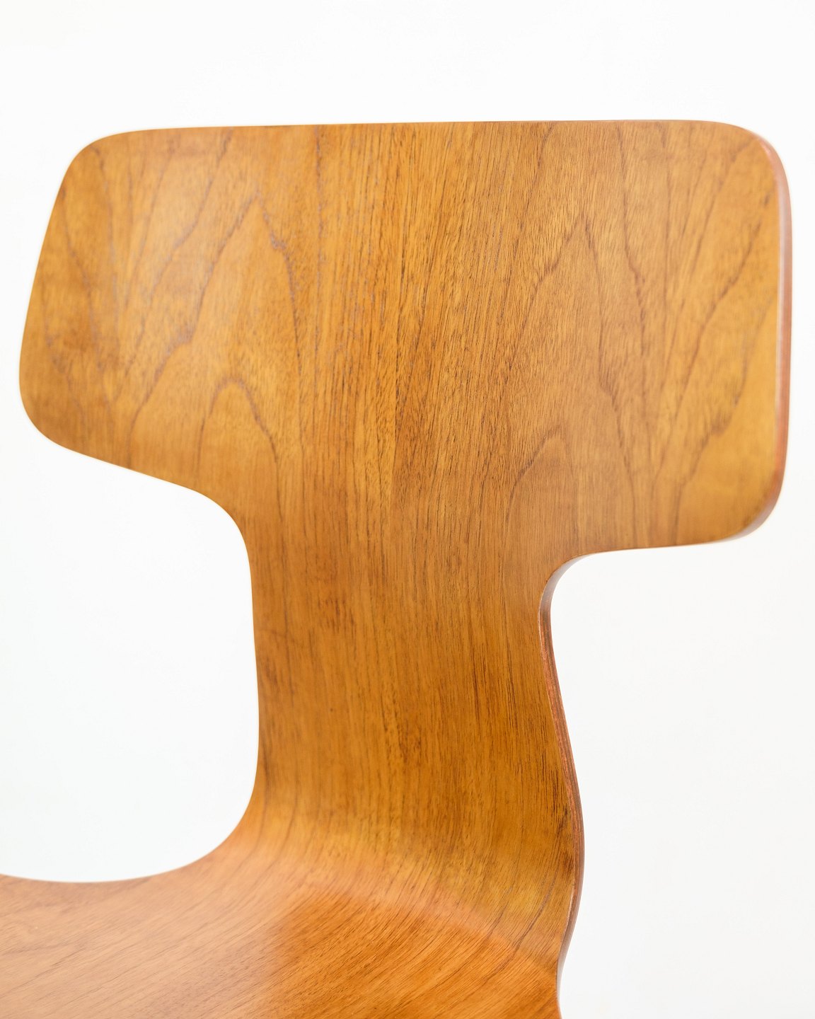 Bring iconic Danish design into your home with the T chair, designed by the legendary Arne Jacobsen and manufactured by Fritz Hansen in the 1960s. This chair, with a chrome frame and teak wood, represents a fusion of functionality and aesthetics, characteristic of Jacobsen's timeless design philosophy.