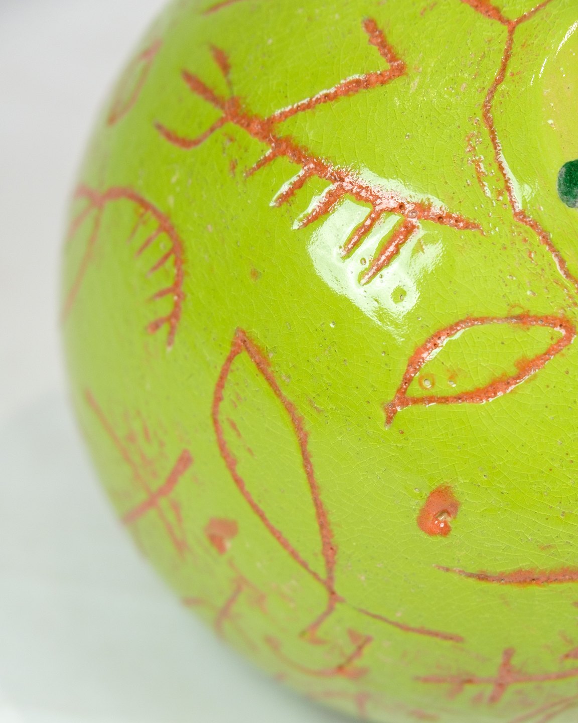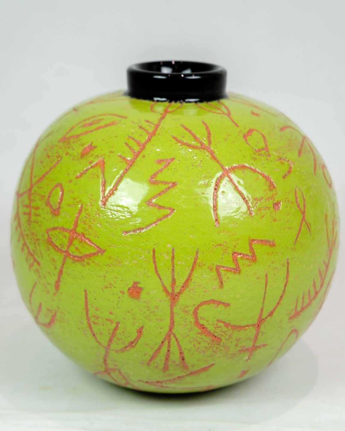 The black top layer contrasts beautifully with the green glaze and creates visual depth in the vase. The orange patterned engravings add an element of detail and complexity, making the vase an artistic and eye-catching piece.