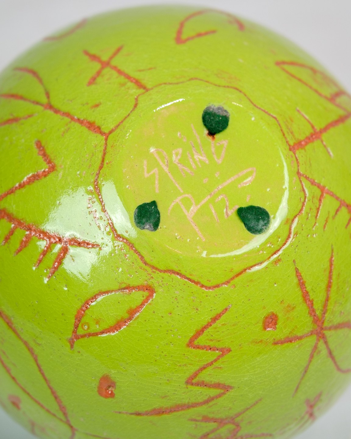 Lene Regius' round vase with black top, green glaze and orange patterned engravings from around the 1990s represents a unique period in ceramic design. The vase combines different colors and patterns to create a characteristic expression, typical of the time and the artist's style.