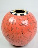 SoldLene Regius' round vase with black and white top, orange glaze and black patterned engravings from around the 1980s represents a unique period in ceramic design. The vase combines different colors and patterns to create a characteristic expression, typical of the time and the artist's style.