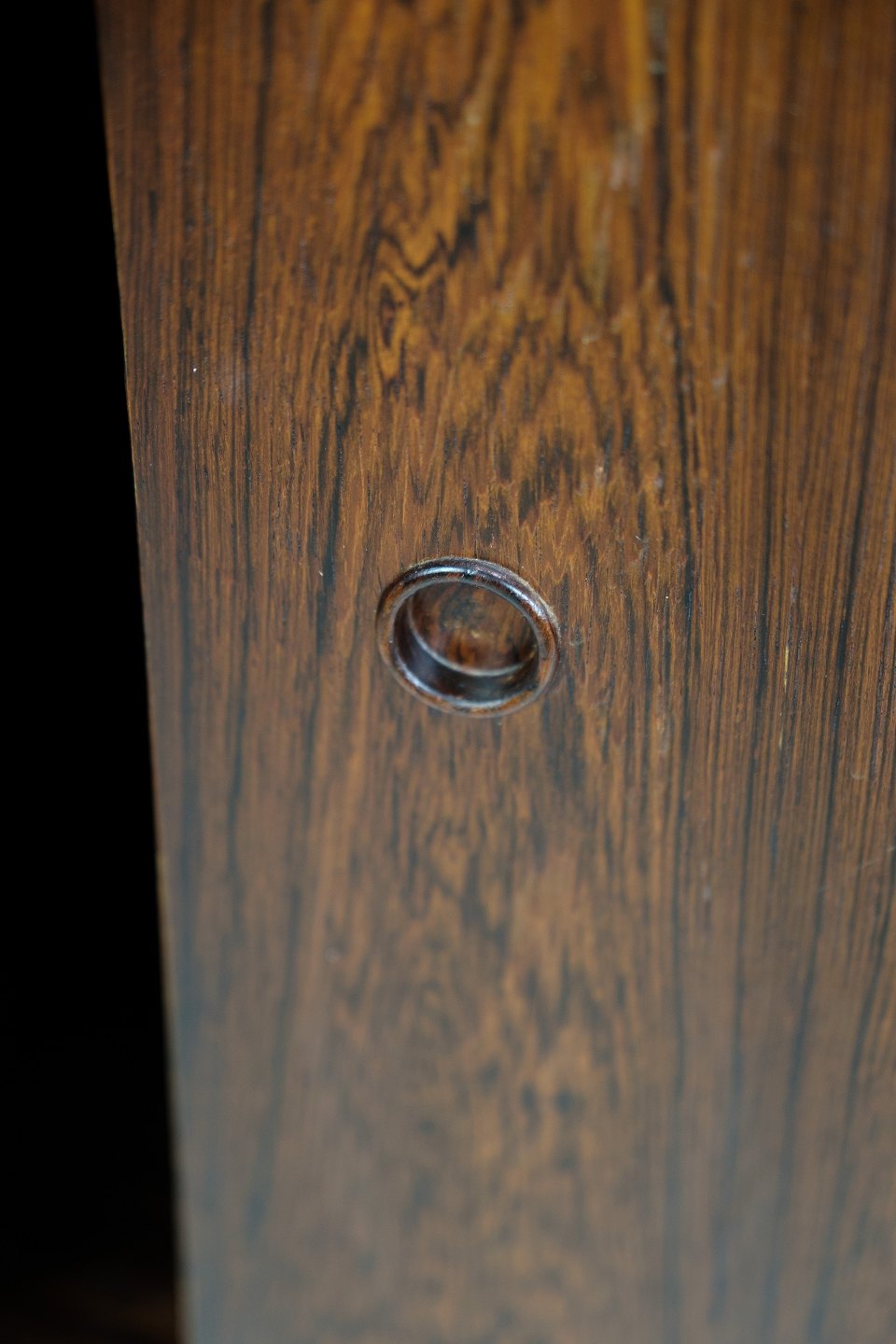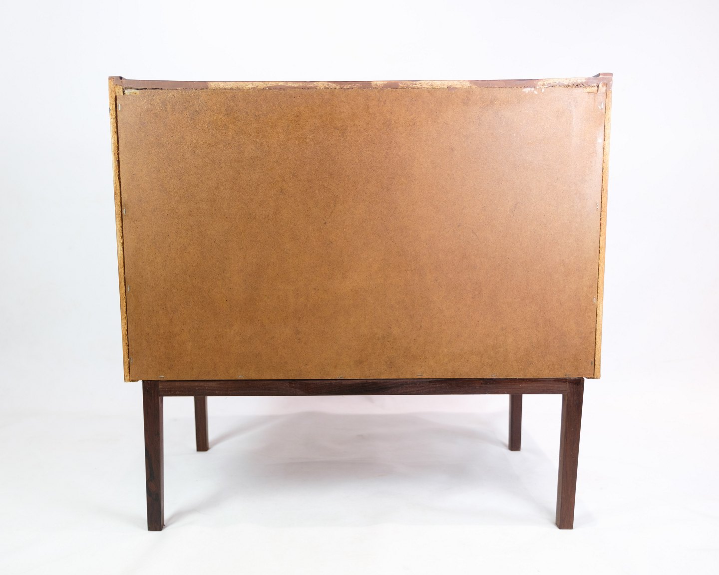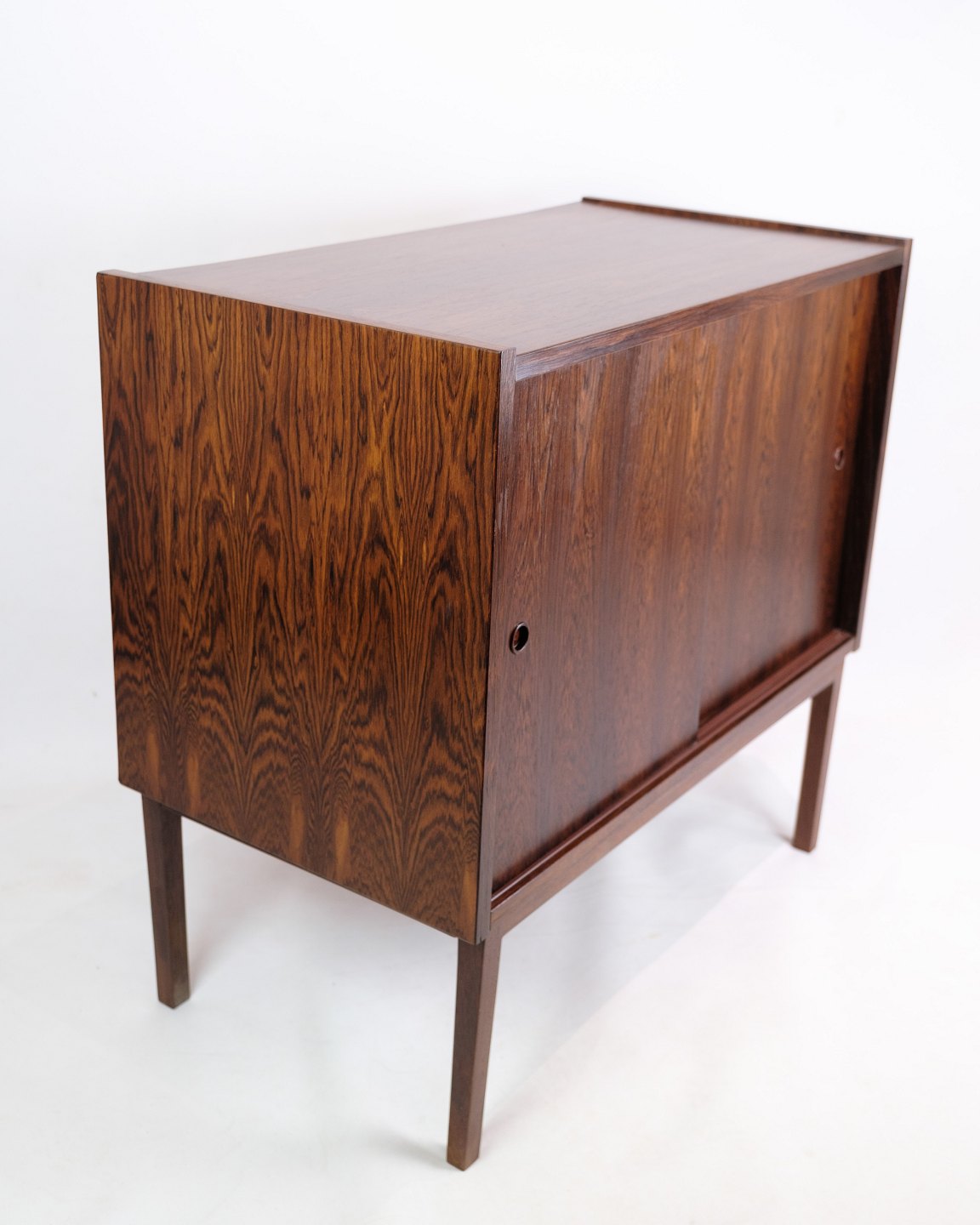 The small rosewood sideboard, of Danish design and from the 1960s, represents an era of stylish and functional furniture design. The rosewood, with its characteristic dark color and beautiful veins, gives the sideboard a unique and luxurious appearance.