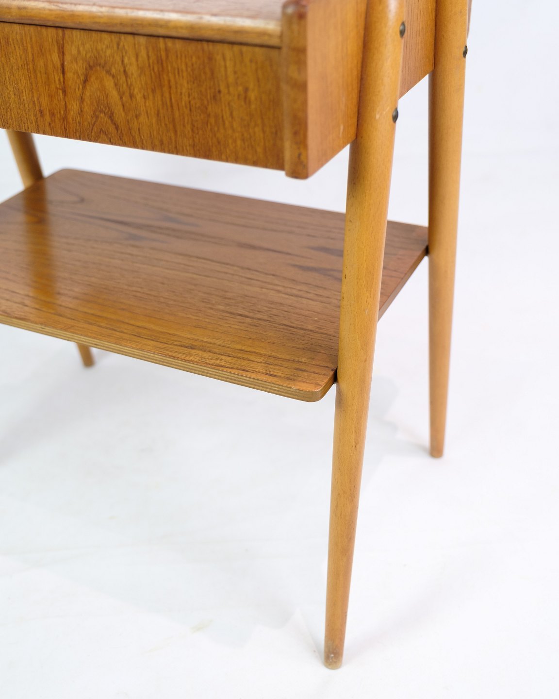 SolgtSæt af natborde på ben med skuffe og hylde, fremstillet af AB Carlström & Co møbelfabrik i Sverige fra 1950'erne. Disse natborde repræsenterer det tidløse og funktionelle design, der kendetegner skandinavisk møbelkunst fra perioden. Benstrukturen giver et let og luftigt udseende, mens skuffen og hylden tilbyder praktisk opbevaringsplads. Producenten, AB Carlström & Co, var kendt for at skabe kvalitetsmøbler.