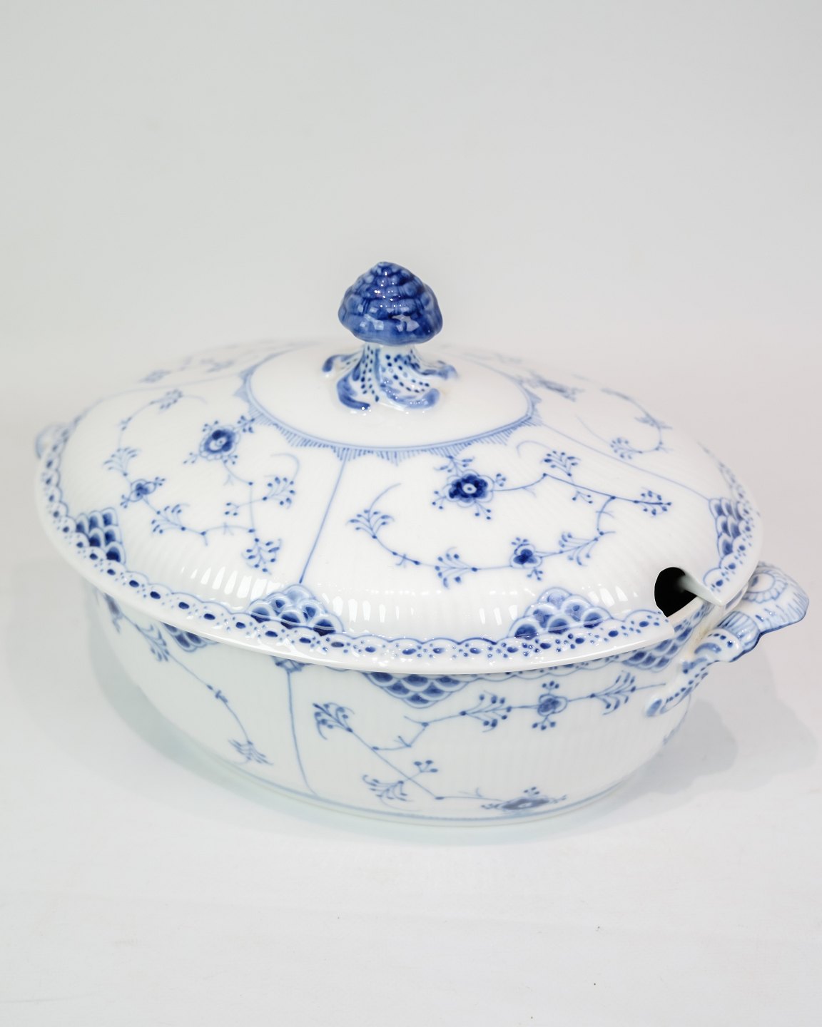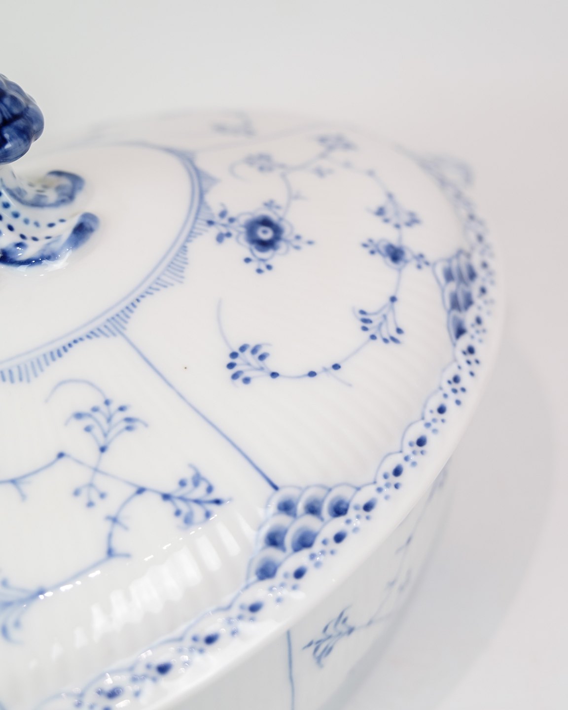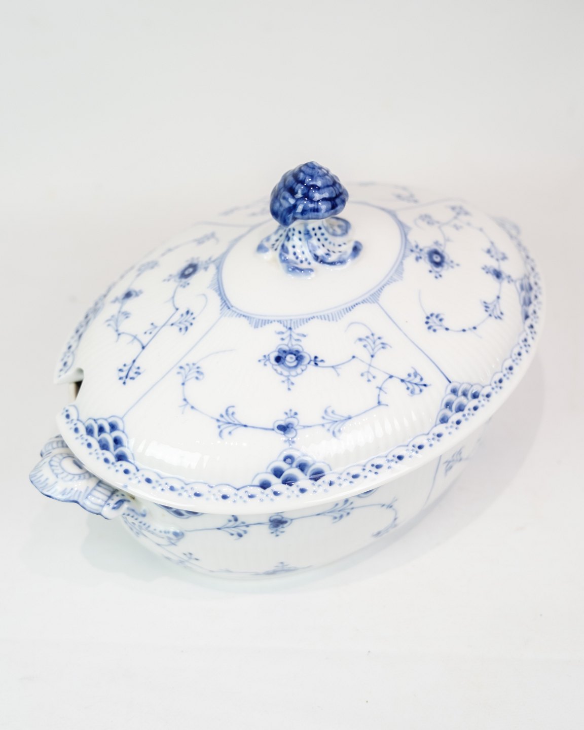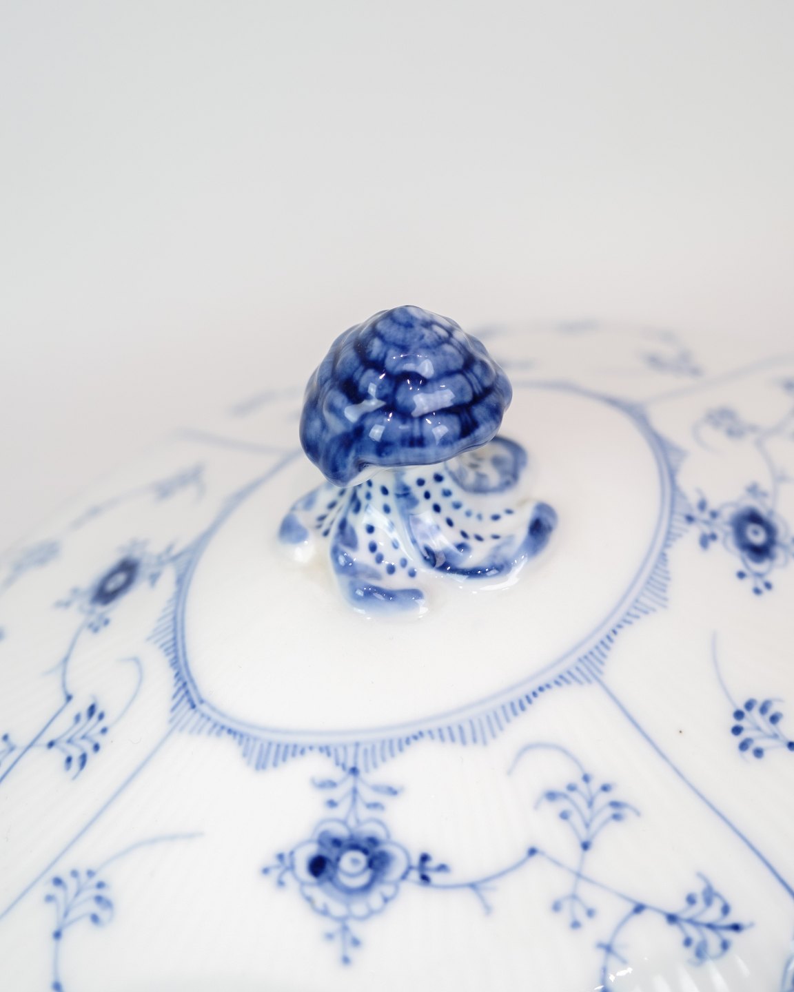 Terrinen er en Model 1109 i serien Musselmalet Helblonde, produceret af Royal Copenhagen. Denne terrin er et eksempel på dansk porcelæn af høj kvalitet og er kendetegnet ved det ikoniske Musselmalet Helblonde mønster. Royal Copenhagen er berømt for sit elegante porcelæn, og dette design er ingen undtagelse. Terrinen, med sit delikate mønster af muslinger og blonder, er et tidløst og klassisk stykke, der tilføjer raffinement til enhver spisestue eller borddækning. Det er et symbol på den fine håndværksmæssige tradition og æstetiske skønhed, som Royal Copenhagen er kendt og værdsat for verden over.