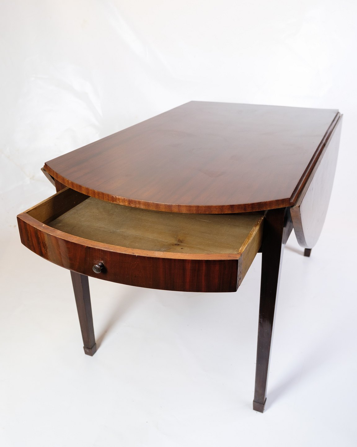 SoldThis antique folding table/dining table from around 1840 is a wonderful example of classic craftsmanship and timeless elegance. Made of polished mahogany wood, the table radiates warmth and beauty with its beautiful wood pattern. The unique design includes a practical drawer that adds functionality to the table. With its older age, the table wears an authentic patina that only adds to its historic appeal.