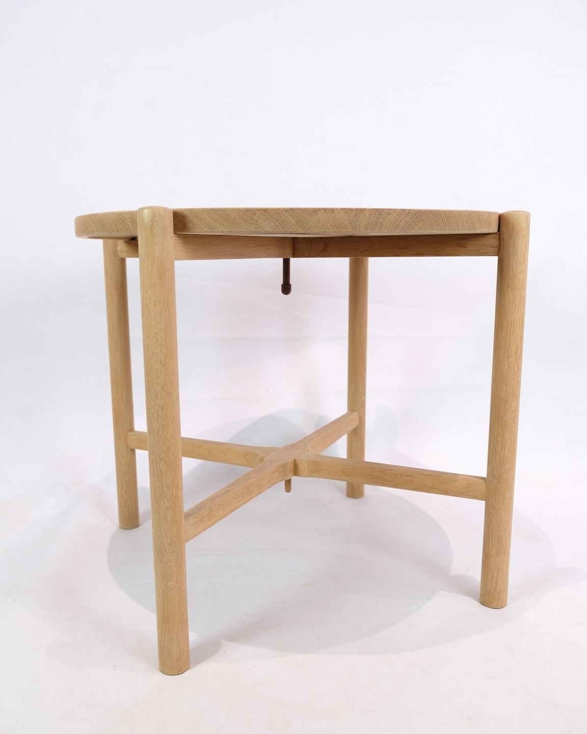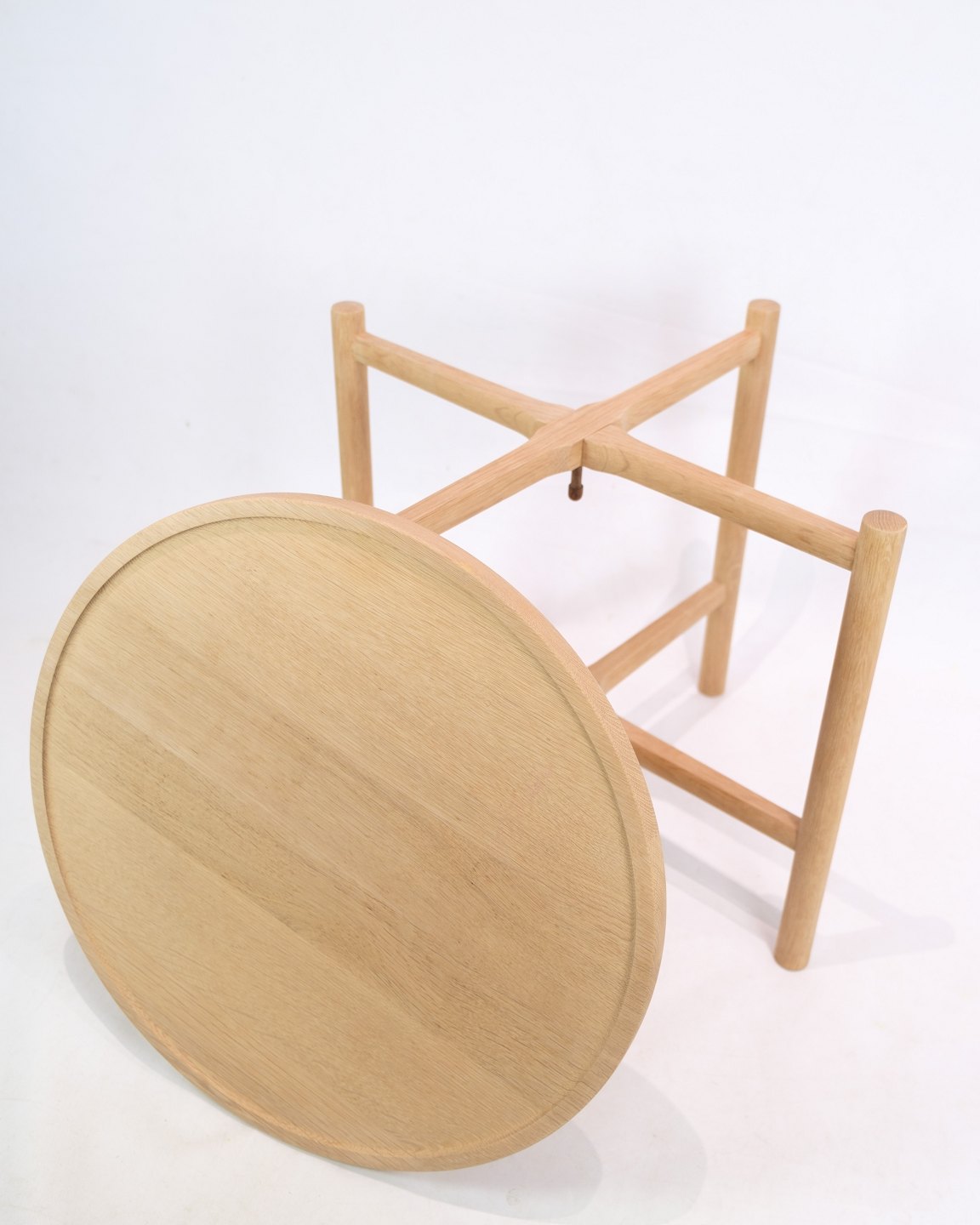 SolgtDette bakkebord eller sidebord, designet af den berømte danske møbelarkitekt Hans J. Wegner og kendt som PP35/62, er et mesterværk af enkelhed og funktionalitet. Fremstillet af sæbebehandlet egetræ, udstråler dette bord en naturlig skønhed og varme, der er karakteristisk for Wegners design.