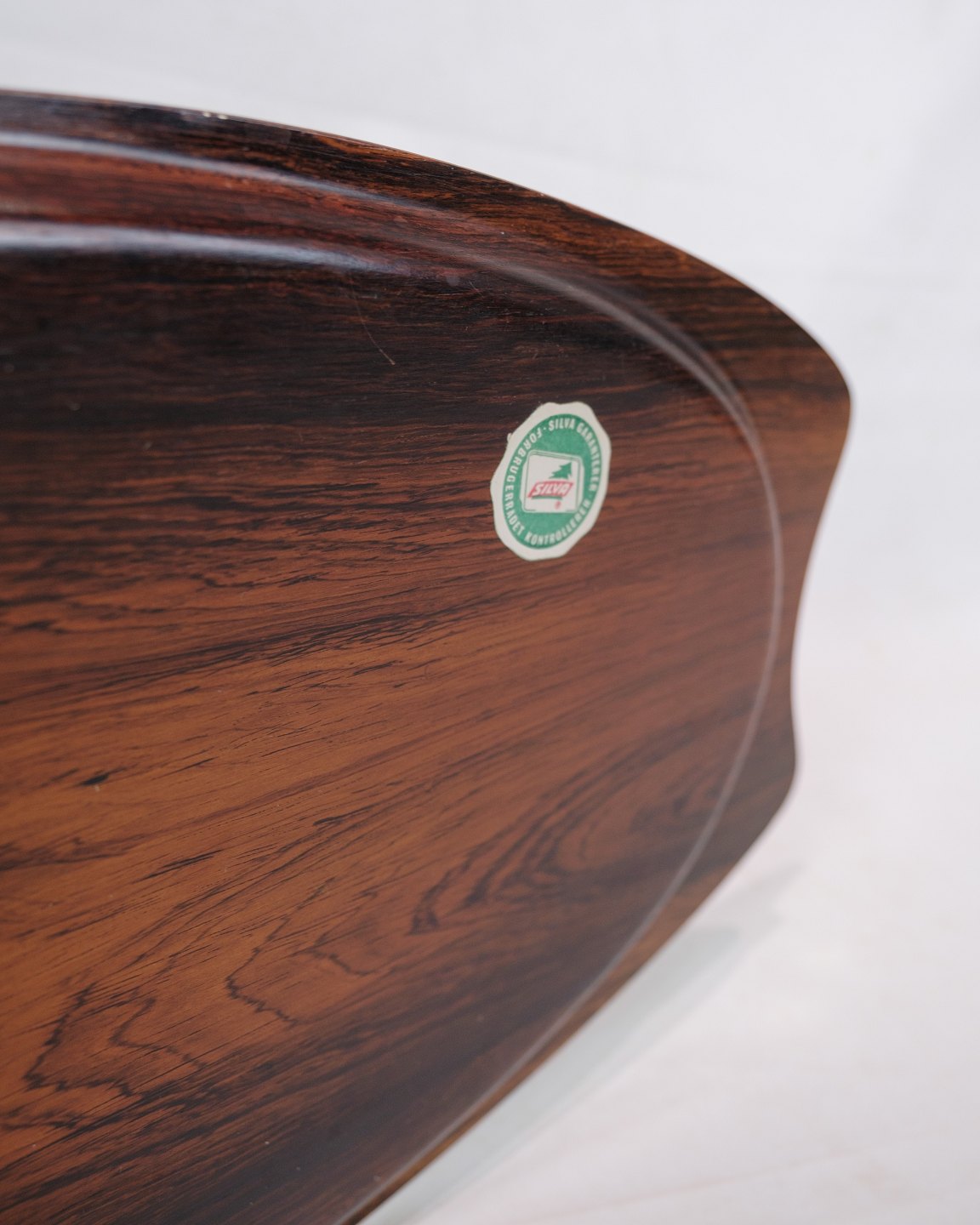 Denne serveringsbakke er et smukt eksempel på dansk design fra 1960'erne, fremstillet af palisander og produceret af Silva. Bakken udstråler en tidløs elegance og håndværksmæssig kvalitet, der er karakteristisk for denne æra af møbeldesign.