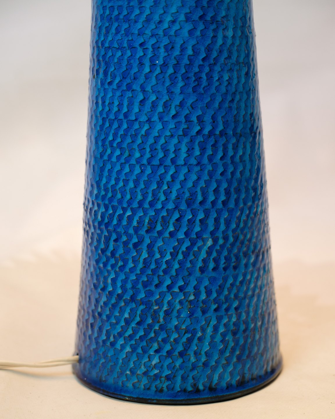 Dette sæt af to bordlamper er enestående eksempler på designskønhed, skabt af Nils Kähler og produceret af Herman A. Kähler. Lampens blå farve og sildebensmønster giver et umiskendeligt og charmerende udtryk, der skaber en unik atmosfære i ethvert rum.