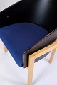 De sorte skaller på stoleryggene giver en flot kontrast til det lyse bøgetræ og tilføjer en moderne og stilfuld dimension til designet. Den sorte farve skaber en elegant ramme om sæderne, der er betrukket med blåt stof. Det blå stof giver en frisk farveaccent og er samtidig komfortabelt og slidstærkt, hvilket sikrer, at stolene forbliver behagelige og attraktive over tid.