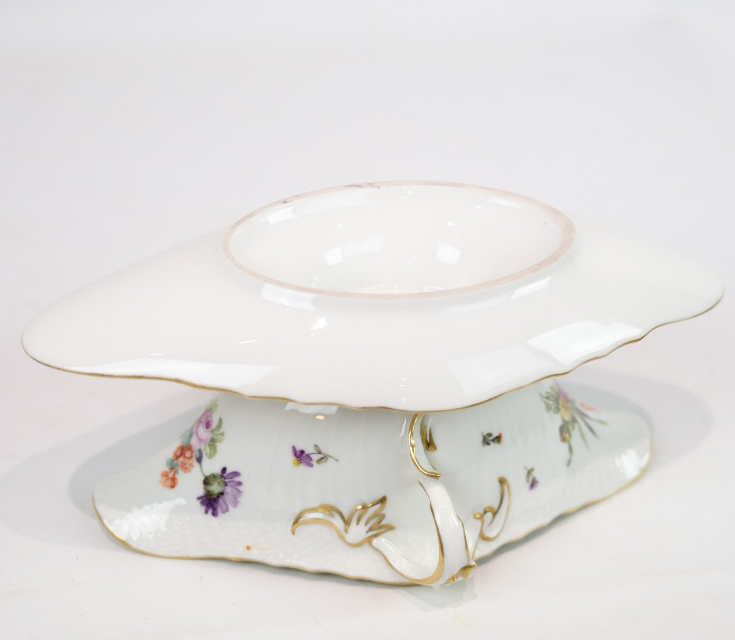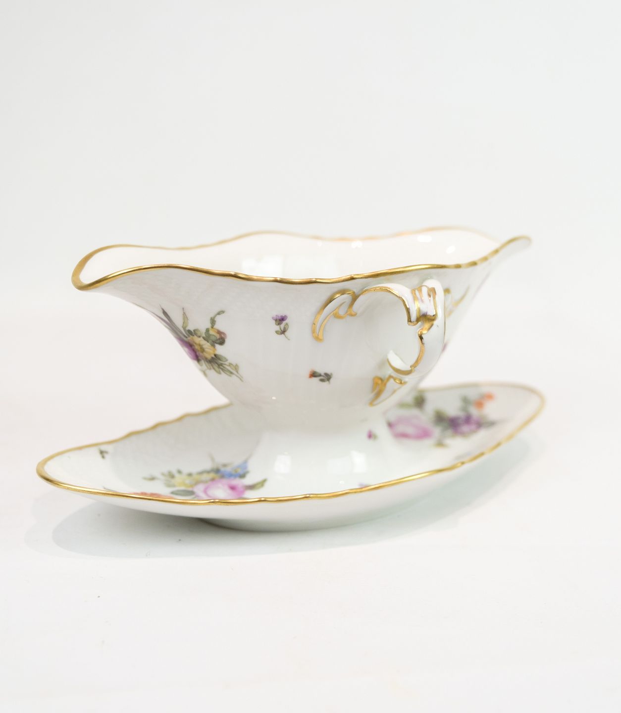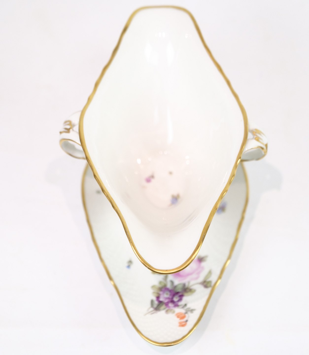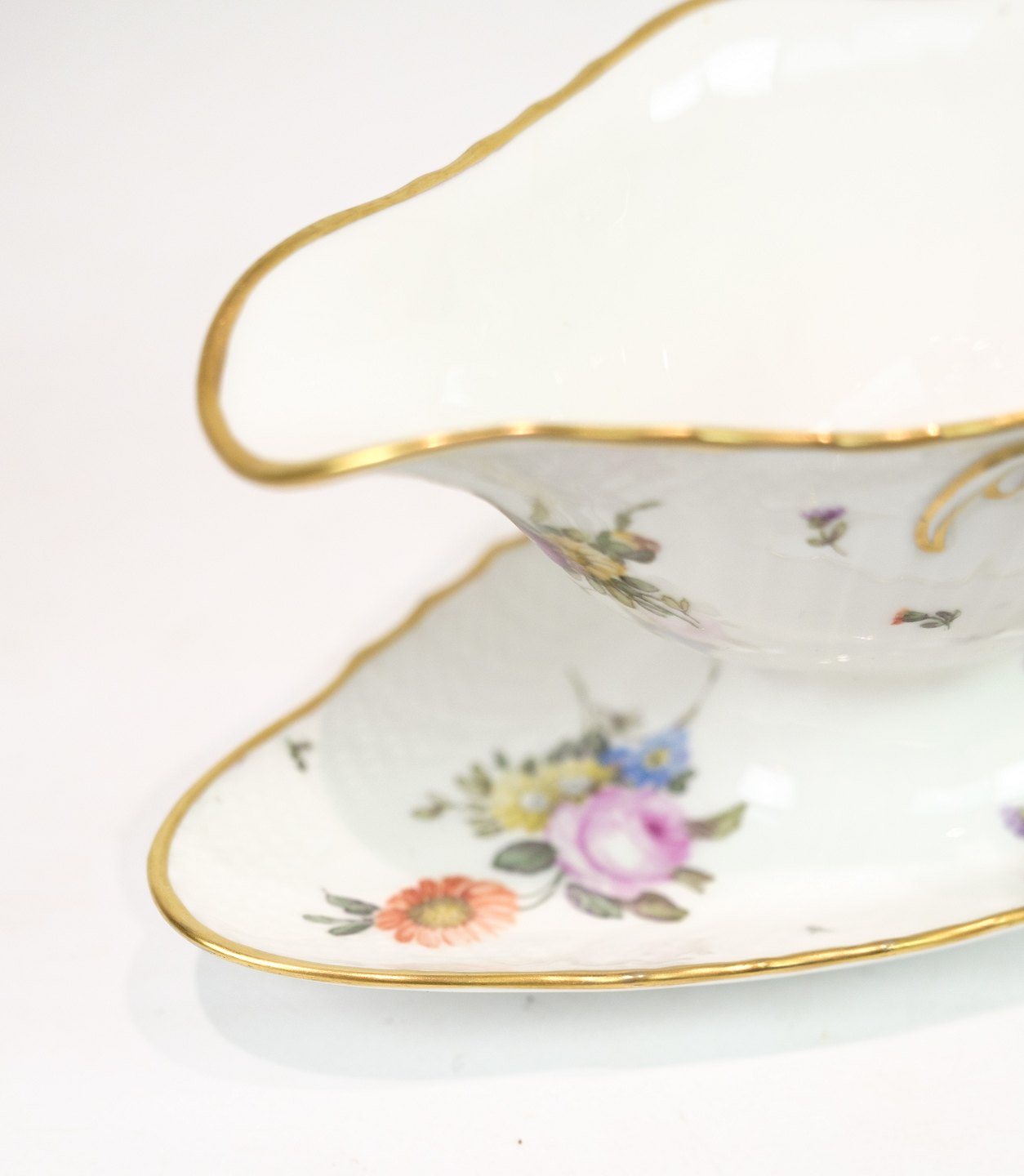 Sauce bowl of Royal porcelain with patterned Saxon flower decorated on the edge with gold. Manufactured by Royal Copenhagen in approx. 1923, where all their goods have been hand painted and subsequently become very rare. The sauce bowl is without flaws or defects.