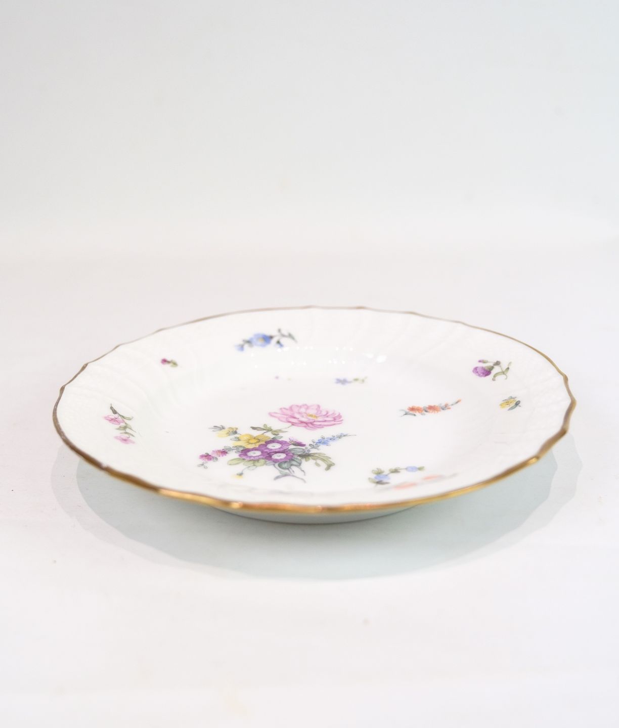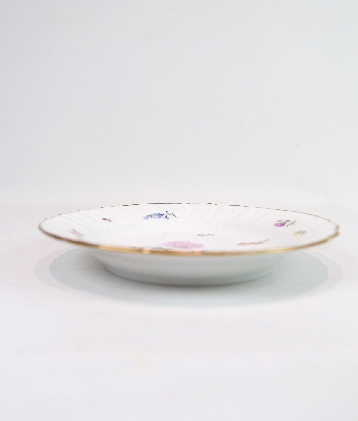 Lunch Plates of Royal porcelain with patterned Saxon flower decorated on the edge with gold. Manufactured by Royal Copenhagen in approx. 1923, where all their goods have been hand painted and subsequently become very rare. All lunch plates are without flaws or defects.