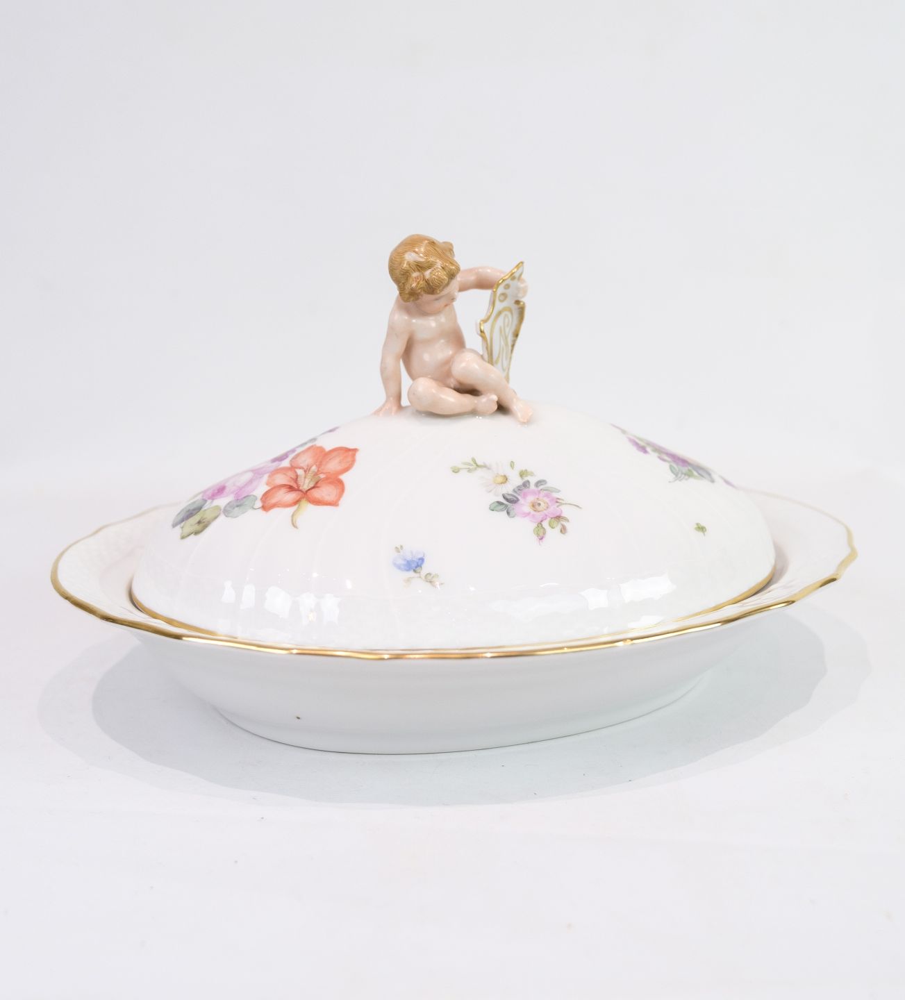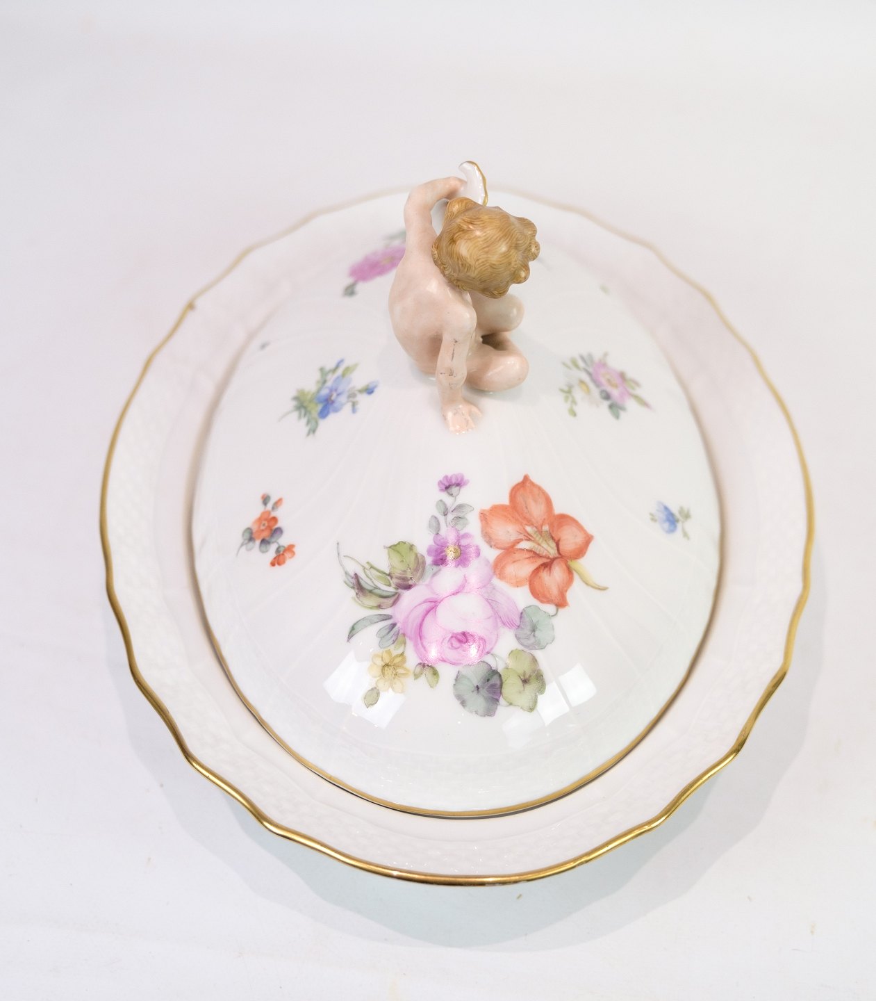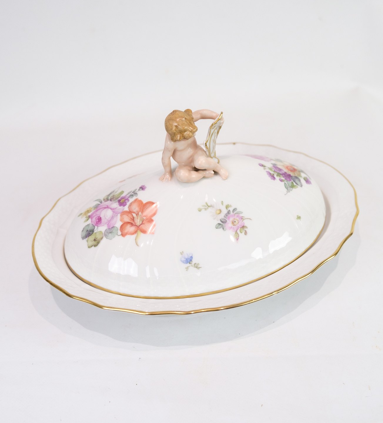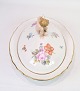 Large Lid Dish decorated with a "Putti" sitting on the lid made of Royal porcelain with patterned Saxon flower decorated at the edges with gold. Manufactured by Royal Copenhagen in approx. 1923, where all their goods have been hand painted and subsequently become very rare. The dish is without flaws or defects.