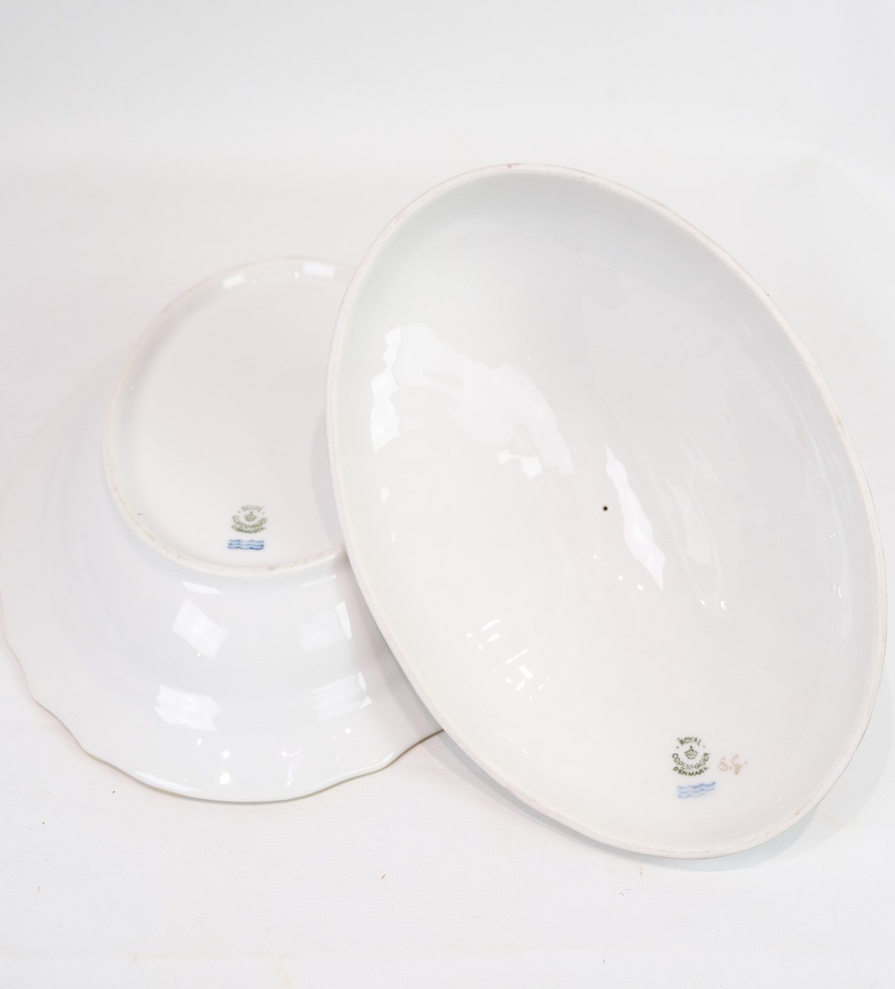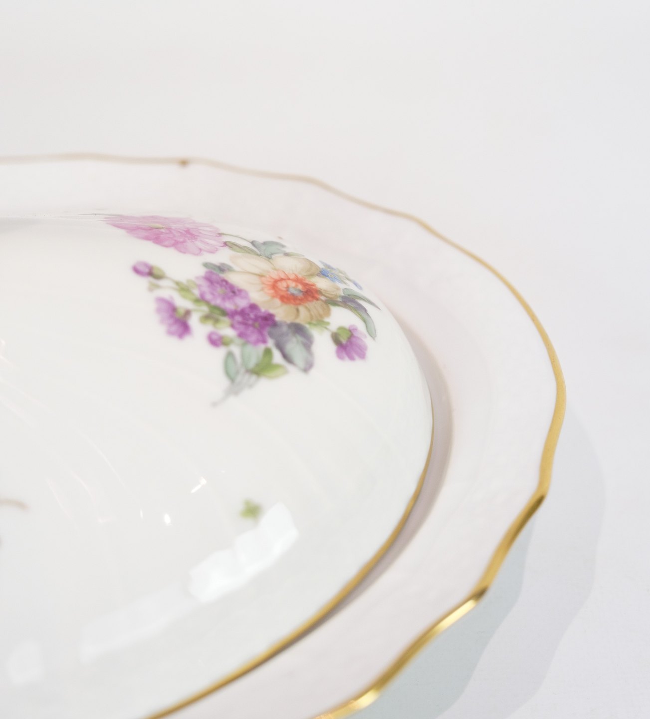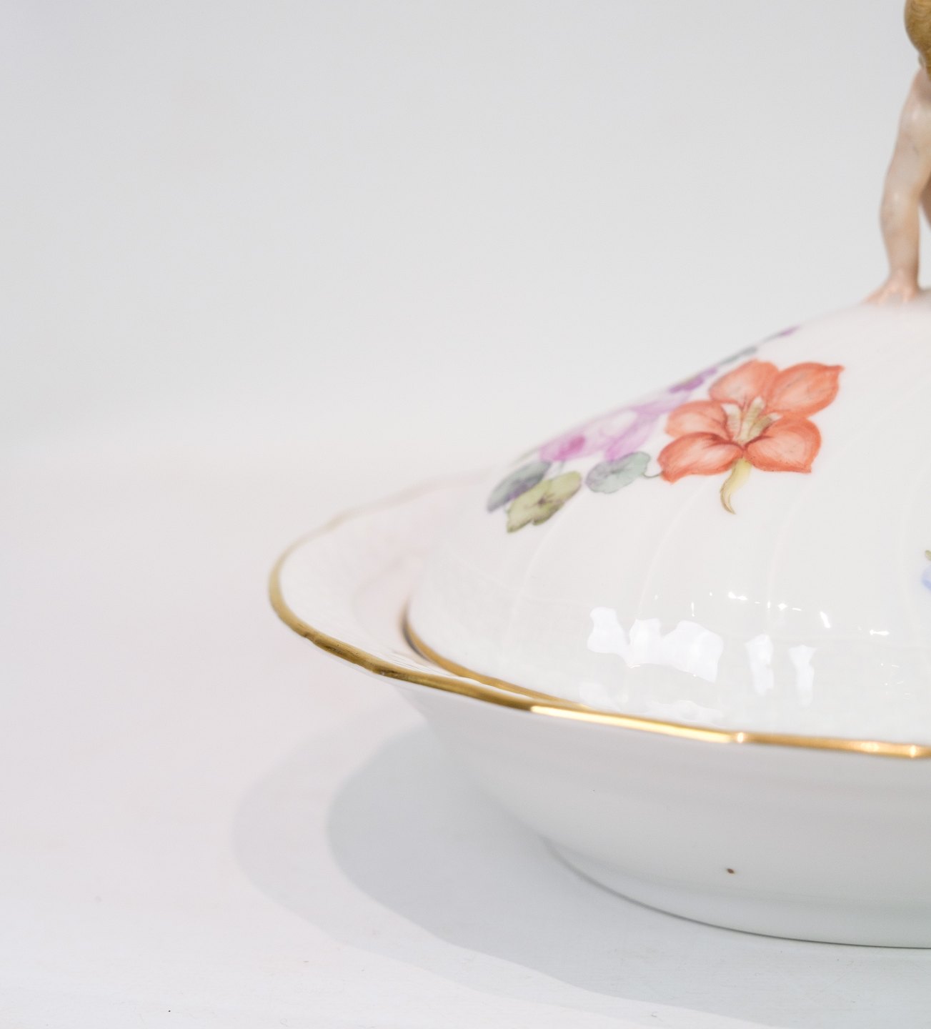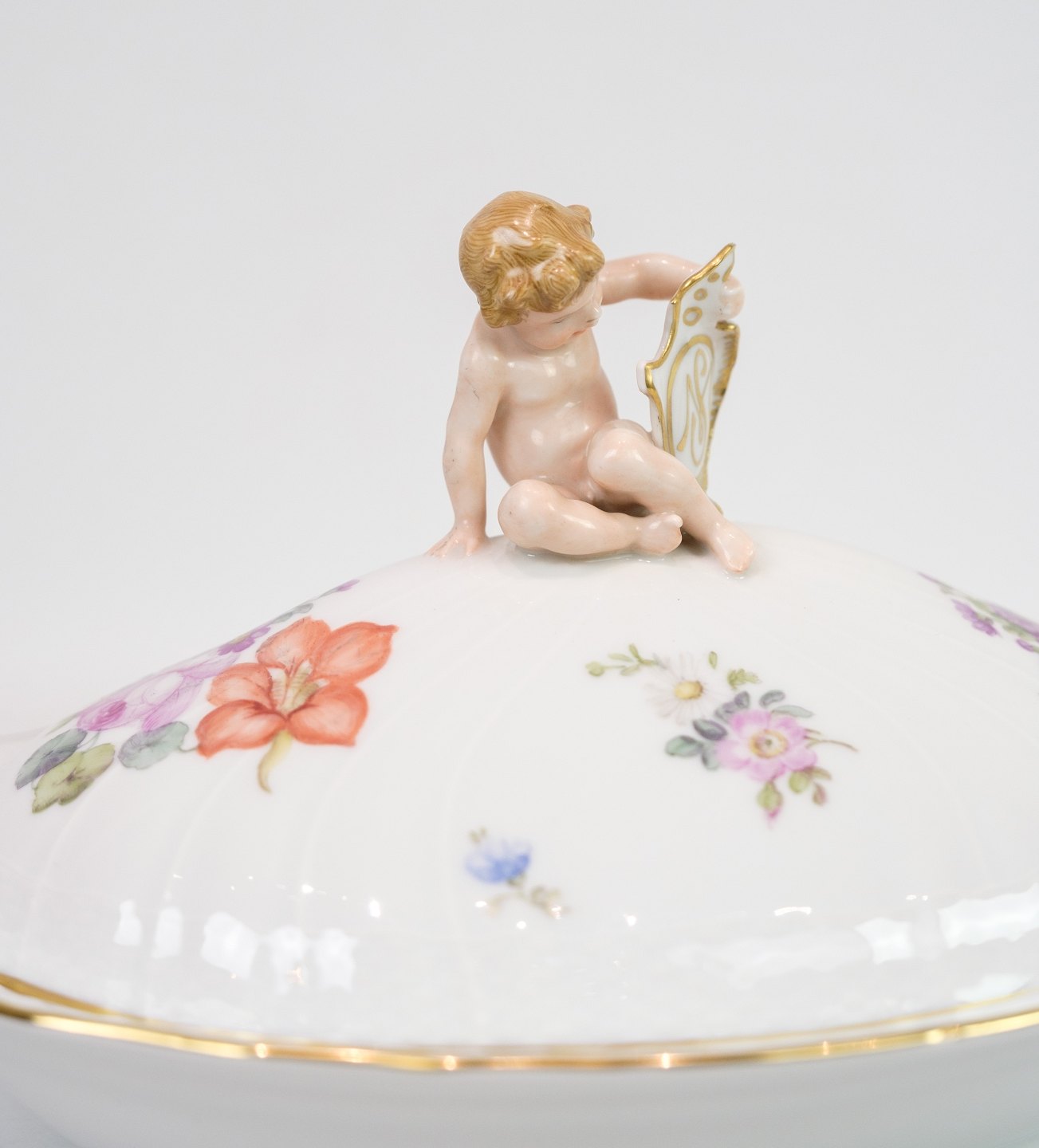 Large Lid Dish decorated with a "Putti" sitting on the lid made of Royal porcelain with patterned Saxon flower decorated at the edges with gold. Manufactured by Royal Copenhagen in approx. 1923, where all their goods have been hand painted and subsequently become very rare. The dish is without flaws or defects.