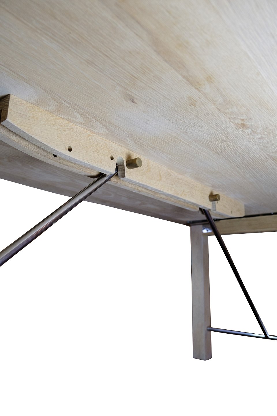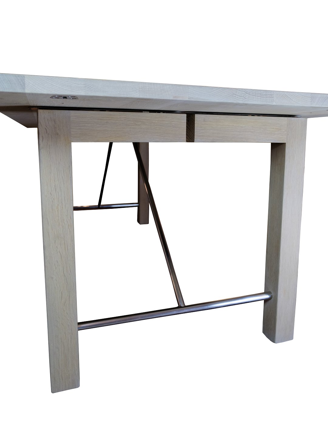 Spisebord af Massiv egetræ tegnet af Hans Thyge Raunkjær fremstillet af Trip trap med skråstiver af forkromet metal. Bordet er blevet efterset på vores værksted og står i meget flot stand. Næsten som nyt.