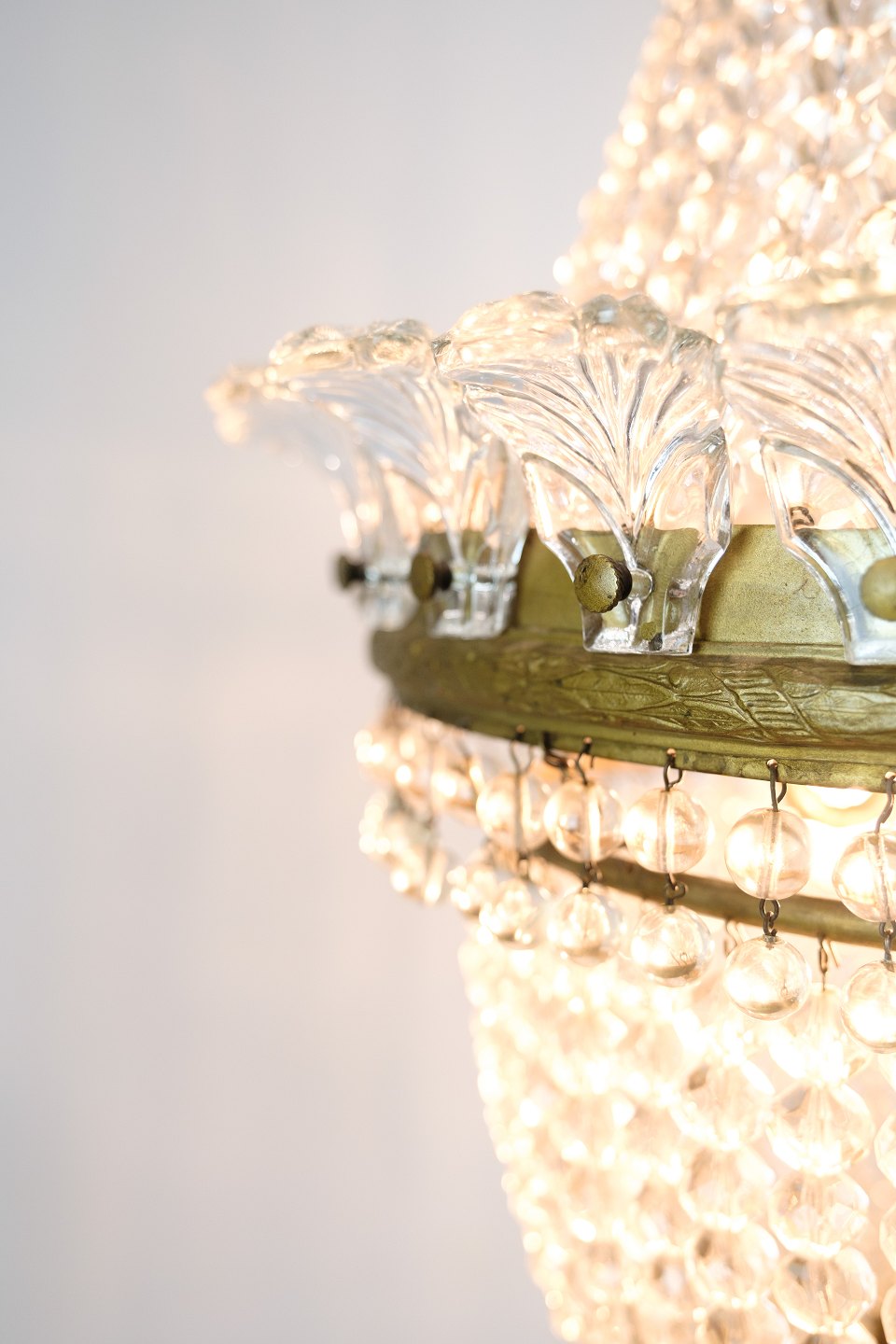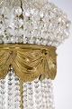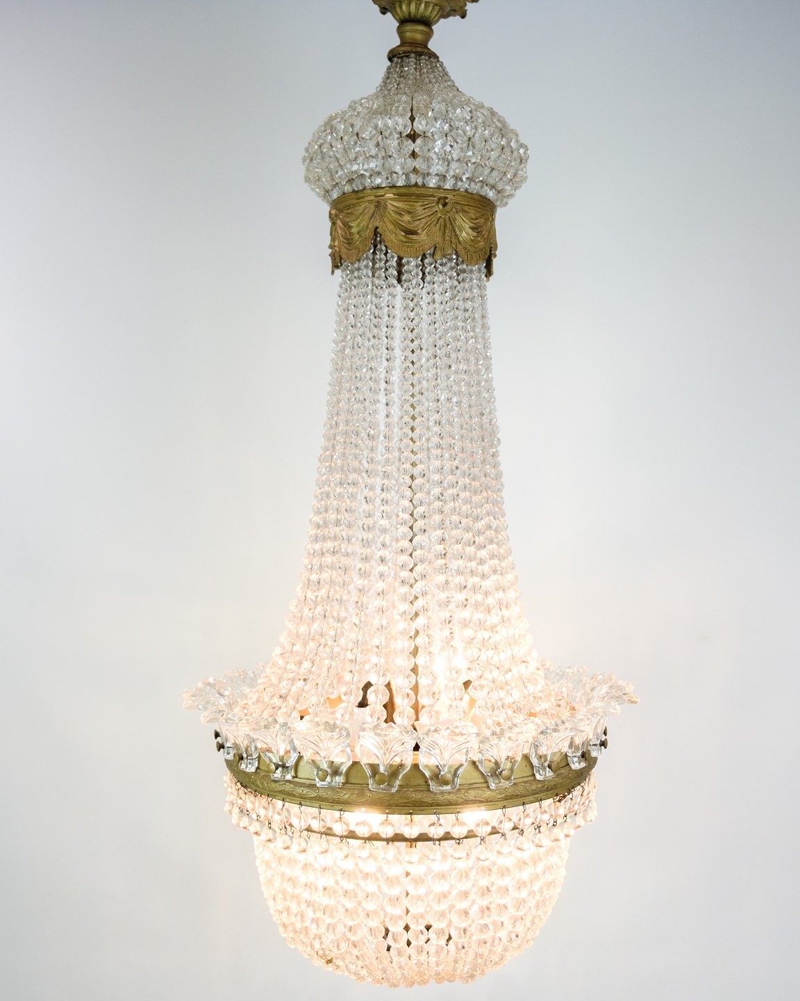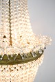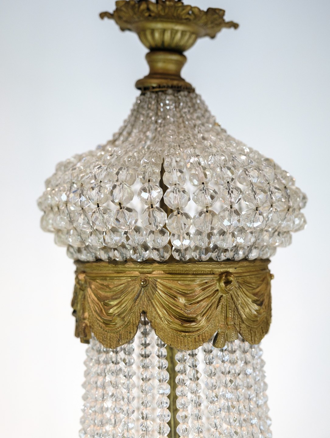 Antique prism chandelier from the year 1890, made of brass and bronze, gilded and decorated with crystals. This chandelier is an example of the fine craftsmanship of the period, where precious metals and crystals create a luxurious and timeless atmosphere.