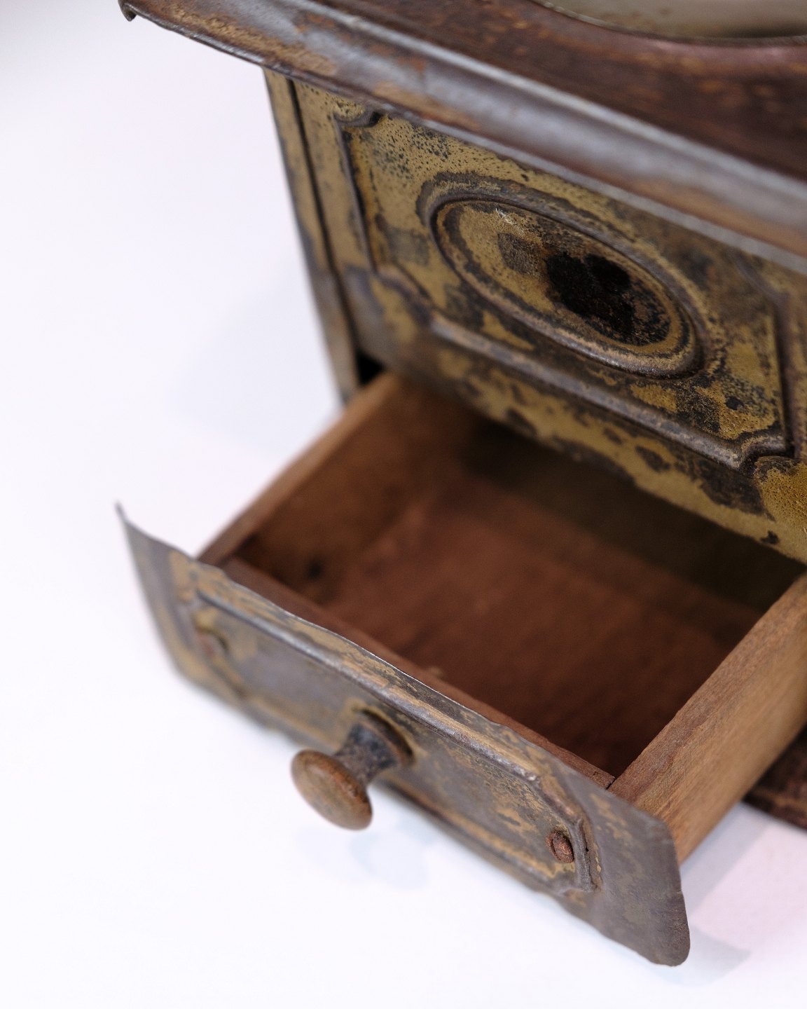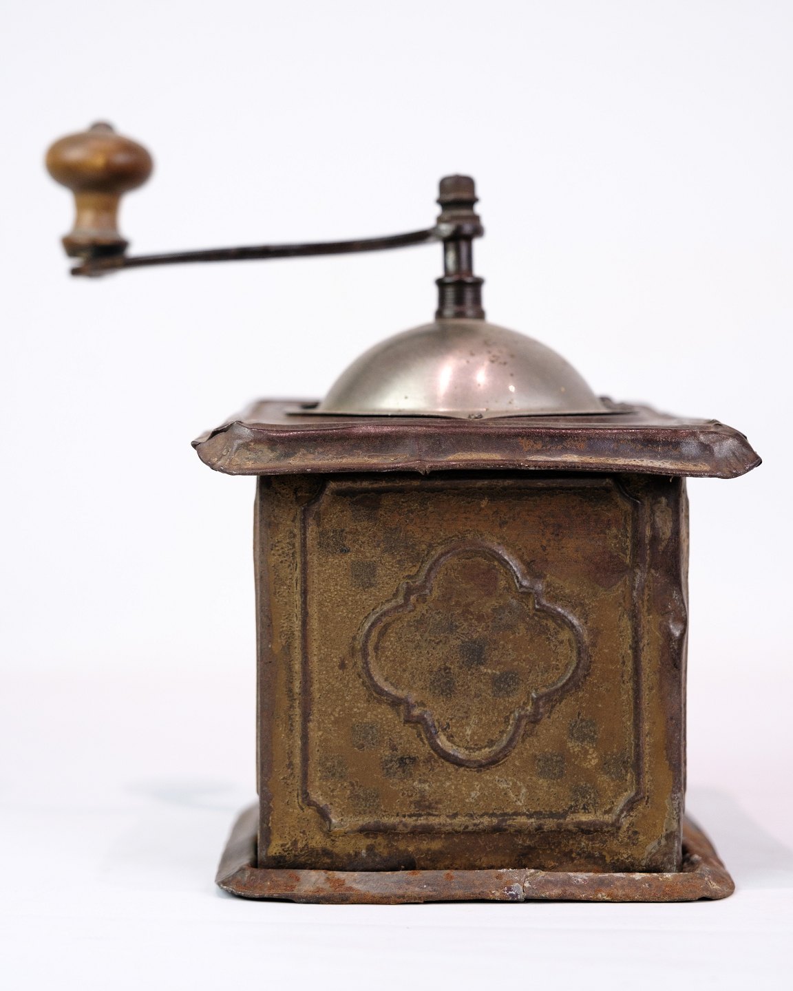 SoldAntique coffee grinder from the 1890s made of metal and dark wood, decorated with a beautiful pattern.