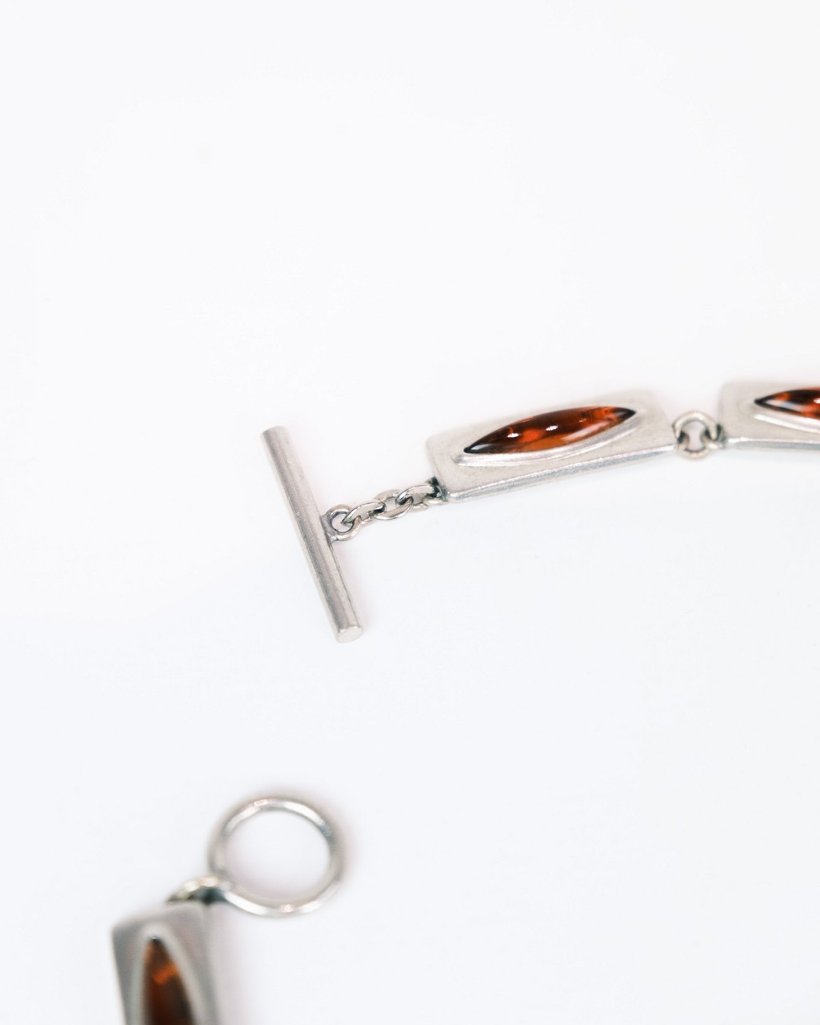 Necklace in tin, decorated with amber, designed by Jørgen Jensen in the 1960s. Jørgen Jensen, known for his work with pewter, created jewelery that combined simplicity and the beauty of nature. This necklace is a timeless example of his design, where the warm amber plays beautifully with the cool tin.