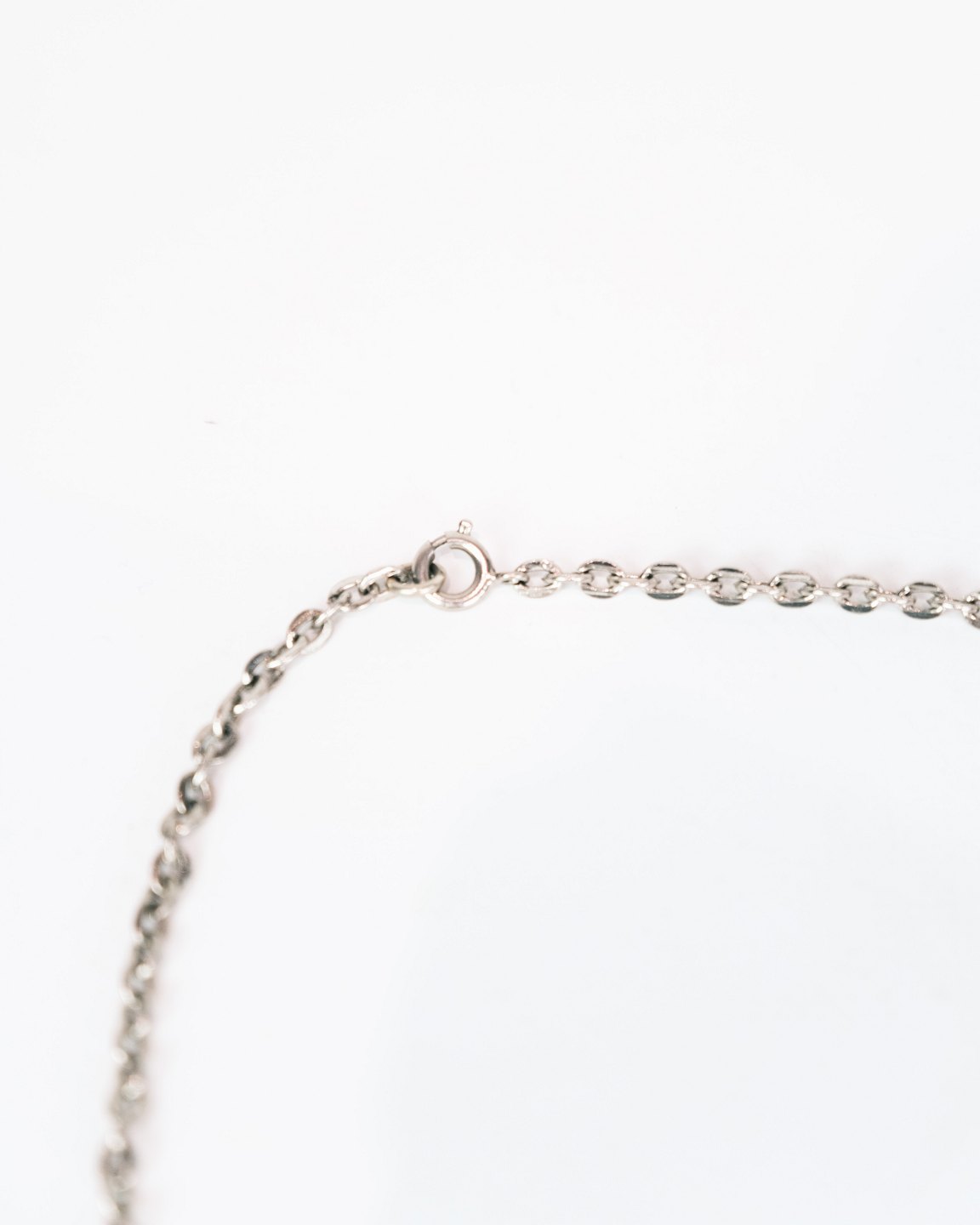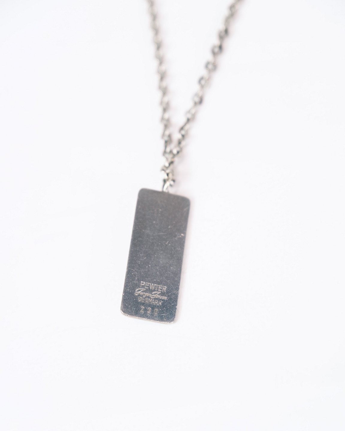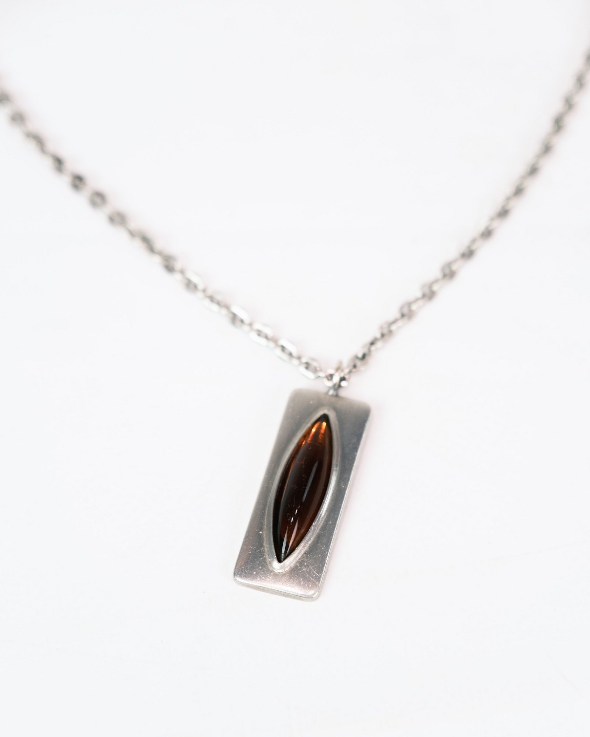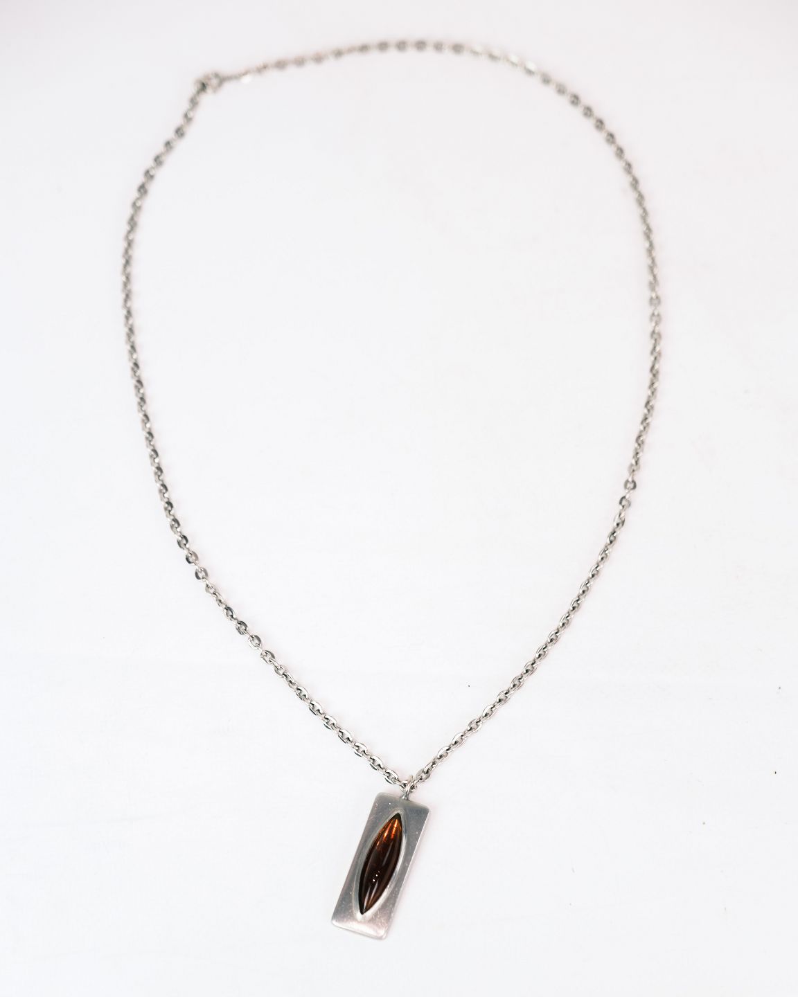 Necklace in tin, decorated with amber and with silver chain, designed by Jørgen Jensen in the 1960s. Jørgen Jensen, known for his pewter jewellery, created works that elegantly combined simplicity with the elements of nature. This necklace combines the warm amber with the cool tin, while the silver chain adds an extra layer of sophistication, making it a timeless and stylish piece from the 1960s.