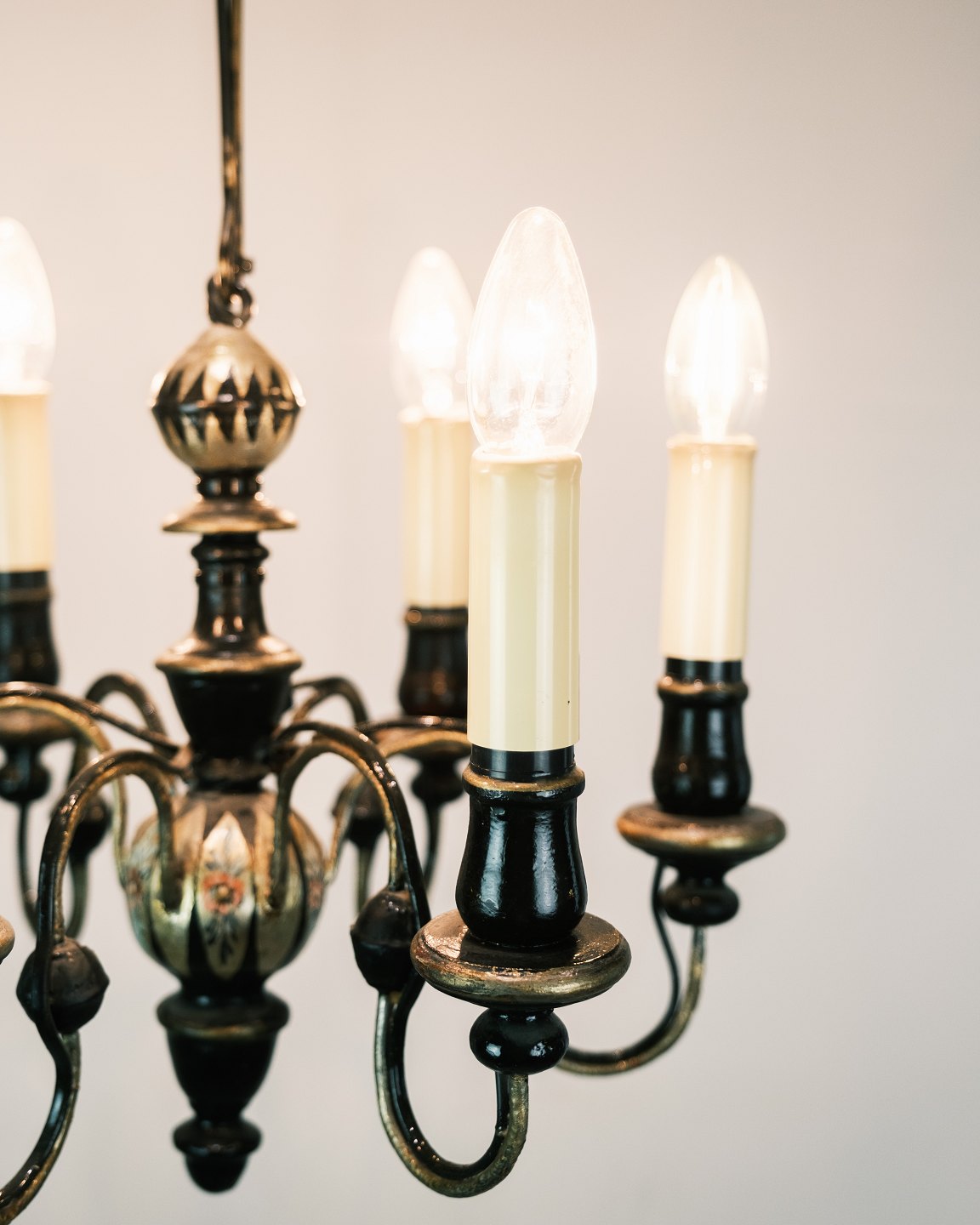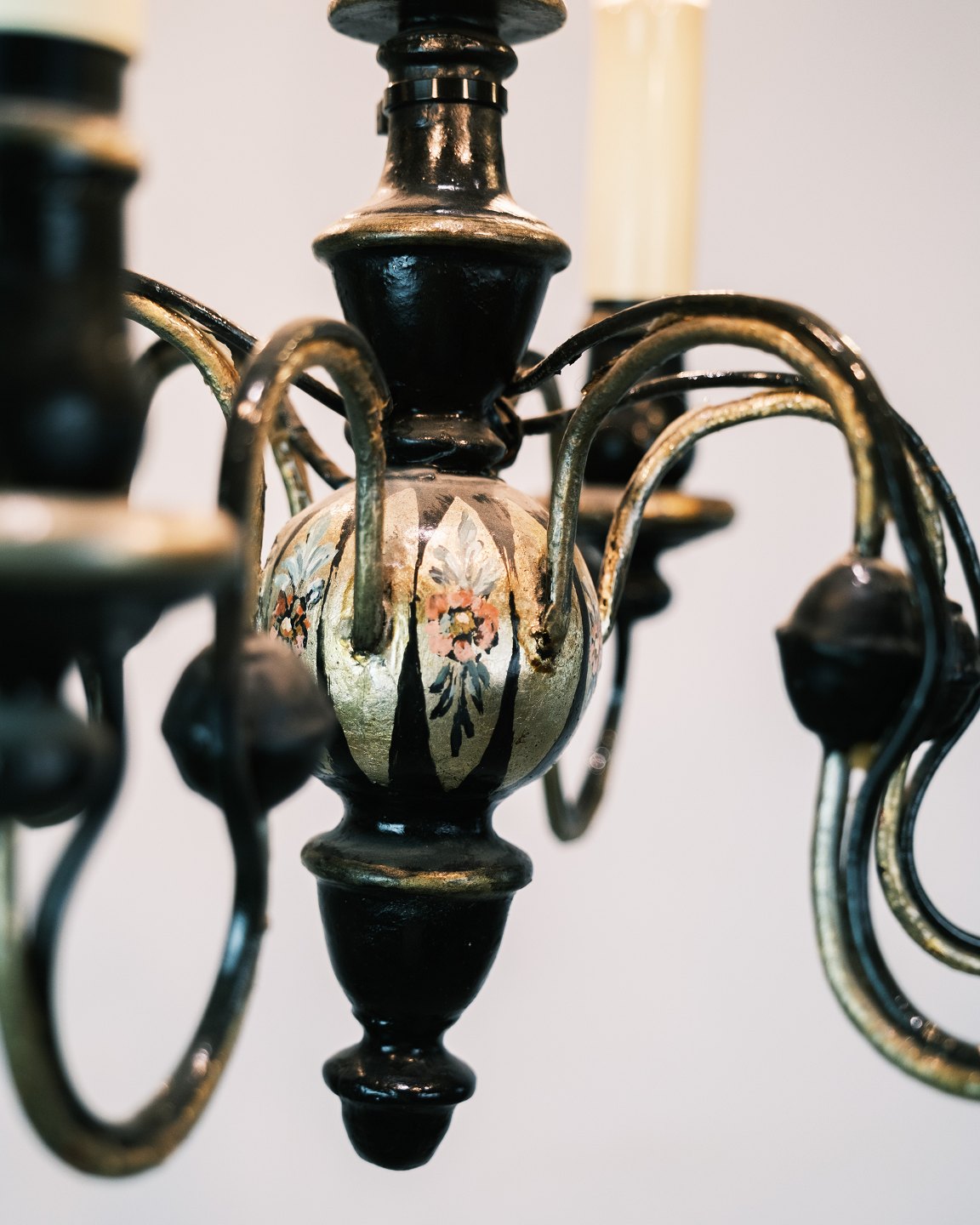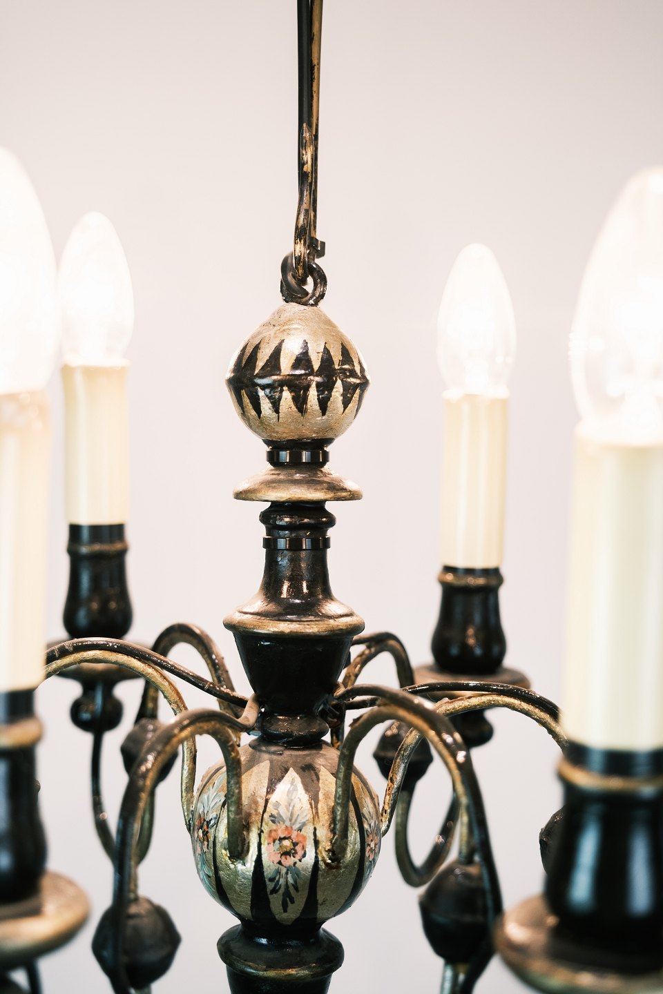 Kirkekrone med 6 arme, udført i træ og dekoreret med guld, fra 1930'erne. Denne lysekrone kombinerer klassisk håndværk med religiøs symbolik og tidens stil, hvilket gør den til et imponerende og historisk stykke.
