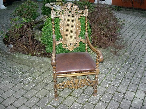 SolgtKongestol i egetræ med udskæringer og lædersæde i fin stand